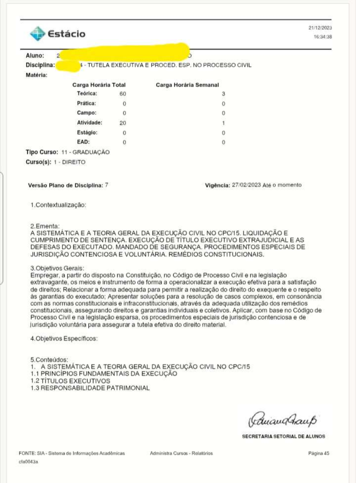 21/12/2023 Estácio 16:34:38 Aluno: 2 Disciplina: TUTELA EXECUTIVA E PROCED. ESP. NO PROCESSO CIVIL Matéria: Carga Horária Total Carga Horária Semanal Teórica: 60 3 Prática: 0 Campo: 0 0 Atividade: 20 1 Estágio: 0 0 EAD: 0 0 Tipo Curso: 11 GRADUAÇÃO Curso(s): 1 DIREITO Versão Plano de Disciplina: 7 Vigência: 27/02/2023 Até o momento 1.Contextualização: 2.Ementa: A SISTEMÁTICA E A TEORIA GERAL DA EXECUÇÃO CIVIL NO CPC/15. LIQUIDAÇÃO E CUMPRIMENTO DE SENTENÇA. EXECUÇÃO DE TÍTULO EXECUTIVO EXTRAJUDICIAL E AS DEFESAS DO EXECUTADO. MANDADO DE SEGURANÇA. PROCEDIMENTOS ESPECIAIS DE JURISDIÇÃO CONTENCIOSA E VOLUNTÁRIA. REMÉDIOS CONSTITUCIONAIS. 3. Objetivos Gerais: Empregar, a partir do disposto na Constituição, no Código de Processo Civil e na legislação extravagante, os meios e instrumento de forma a operacionalizar a execução efetiva para a satisfação de direitos; Relacionar a forma adequada para permitir a realização do direito do exequente e o respeito às garantias do executado; Apresentar soluções para a resolução de casos complexos, em consonância com as normas constitucionais e através da adequada utilização dos remédios constitucionais, assegurando direitos e garantias e coletivos. Aplicar, com base no Código de Processo Civil e na legislação esparsa, os procedimentos especiais de jurisdição contenciosa e de voluntária para assegurar a tutela efetiva do direito material. 4. Objetivos Específicos: 1. A SISTEMÁTICA E A TEORIA GERAL DA EXECUÇÃO CIVIL NO CPC/15 1.1 PRINCÍPIOS FUNDAMENTAIS DA EXECUÇÃO 1.2 TÍTULOS EXECUTIVOS RESPONSABILIDADE PATRIMONIAL SECRETARIA SETORIAL DE ALUNOS FONTE: SIA Sistema de Informações Acadêmicas Administra Cursos Relatórios Página 45 cfa0043a21/12/2023 Estácio 16:34:38 2. LIQUIDAÇÃO E CUMPRIMENTO DE SENTENÇA 2.1 LIQUIDAÇÃO DE SENTENÇA 2.2 CUMPRIMENTO DE SENTENÇA 2.3 OBRIGAÇÃO DE FAZER, NÃO FAZER E ENTREGA DE COISA 3. EXECUÇÃO DE TÍTULO EXECUTIVO EXTRAJUDICIAL E AS DEFESAS DO EXECUTADO 3.1 CONCEITOS, CARACTERÍSITCAS E REGRAS 3.2 DISTINÇÃO DOS PROCESSOS 3.3 DEFESA DO EXECUTADO: OS EMBARGOS 4. PROCEDIMENTOS ESPECIAIS DE JURISDIÇÃO CONTENCIOSA E VOLUNTÁRIA 4.1 PRINCIPAIS PROCEDIMENTOS CONTENCIOSOS E NÃO CONTENCIOSOS NO CPC 4.2 AÇÃO DE ALIMENTOS E AÇÕES 4.3 JUIZADOS ESPECIAIS 5. REMÉDIOS CONSTITUCIONAIS 5.1 AÇÃO CIVIL PÚBLICA 5.3 AÇÃO POPULAR 5.4 MANDADO DE INJUNÇÃO E HABEAS DATA MANDADO DE SEGURANÇA (ATIVIDADE PRÁTICA SUPERVISIONADA) 6.1 ELEMENTOS CONCEITUAIS 6.2 PRESSUPOSTOS E PROCEDIMENTO DO MANDADO DE SEGURANÇA CONTEÚDO DA SENTENÇA E REGIME DA COISA JULGADA 6. Procedimentos de ensino A disciplina adotará o modelo de sala de aula invertida e aprendizagem baseada em problemas. processo de ensino-aprendizagem por meio de uma preleção, que terá como base uma situação problema previamente definida pelo professor. Serão utilizados como estratégias: exposição e discussão de filmes e documentários, estudos de casos que subsidiarão a análise de problemas, debates estruturados, fóruns de discussão, brainstormings, jogos e ferramentas digitais que tornarão o aluno protagonista de seu aprendizado. Além disso, o modelo de aprendizagem a realização da Atividade Autônoma Aura AAA: duas questões elaboradas para avaliar se os objetivos estabelecidos, em cada plano de aula, foram alcançados pelos alunos. A Atividade Aura AAA tem natureza diagnóstica e formativa, suas questões são fundamentadas em uma situação-problema, estudada previamente, e cuja resolução permite aferir o aprendizado do(s) tema/tópicos discutidos na aula. de avaliação: Os procedimentos de avaliação contemplarão as competências desenvolvidas durante a disciplina, divididos da seguinte forma: Avaliação 1 (AV1), Avaliação 2 (AV2) e Avallação 3 (AV3): AV1 Contemplará os temas abordados na disciplina até a sua realização e será assim composta: Prova com valor total de 7 (sete) pontos; Realização de quiz avaliativo com valor total de 3 (três) pontos, acompanhados pelo professor da disciplina. A soma de todos os instrumentos que possam vir a compor grau final da AV1 não poderá ultrapassar grau máximo de 10 (dez) pontos. AV2 Contemplará todos os temas abordados pela disciplina e será composta por uma prova teórica no formato PNI Prova Nacional Integrada, com total de 10 (dez) pontos. AV3 Contemplará todos os temas abordados pela disciplina. Será composta por uma prova no formato PNI Prova Nacional SECRETARIA SETORIAL DE ALUNOS FONTE: SIA Sistema Informações Acadêmicas Administra Cursos Relatórios Página 46 cfa0043a21/12/2023 Estácio 16:34:38 Integrada, com total de 10 pontos, substituirá a menor nota de AV1 ou AV2. Para aprovação na disciplina, o aluno deverá: atingir resultado igual ou superior a 6,0, calculado a partir da média aritmética entre os graus das avaliações, sendo consideradas apenas as duas maiores notas entre as três etapas de avaliação (AV1, AV2 e AV3). A média aritmética obtida será o grau final do aluno na disciplina; obter grau igual ou superior a 4,0 em, pelo menos, duas das três avaliações; frequentar, no mínimo, 75% das aulas ministradas 8.Bibliografia Básica: CÂMARA, novo Processo Civil 7.ed. Rio de Janeiro: 2021. Disponível em: CARNEIRO, Paulo Cezar Pinheiro, o novo Processo Civil Exposição sistemática do processo: de conhecimento; nos tribunais; de execução; tutela provisória. 2.ed. Rio de Janeiro: Gen/Forense, 2021. Disponível em: THEODORO JÚNIOR, Humberto. Processo de Execução e Cumprimento de Sentença. 30.ed. Rio de Janeiro: Gen/Forense, Disponível em: Complementar: ALVIM, Angélica Arruda et al (Coord.). Comentários ao Código de Processo Civil. Lei n. 13.105/2015. De acordo com as Leis n. 13.256/2016 e 2.ed. São Paulo: Saraiva, 2016. Disponível em: CABRAL, Antonio do Passo; CRAMER, Ronaldo (Coord.). Comentários ao Código de Processo Civil. 2.ed. Rio de Janeiro: Gen/Forense, 2016. Dispo