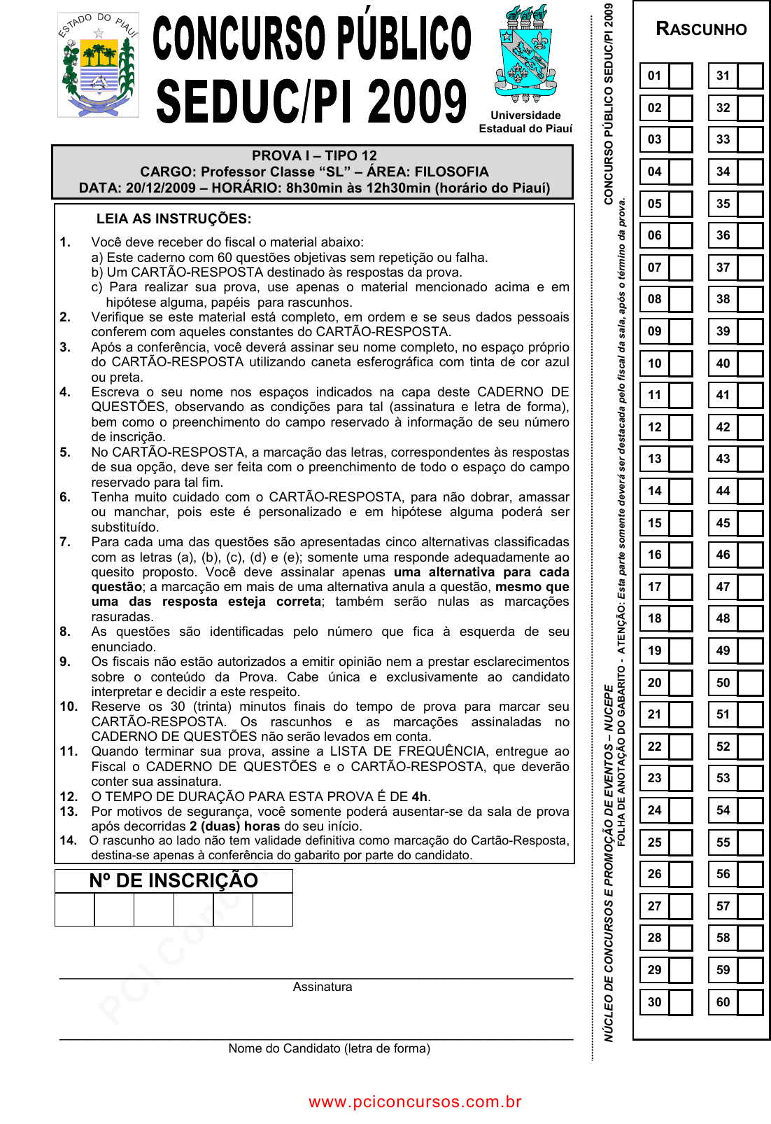 pcimarkpci MDAwMDowMDAwOjAwMDA6MDAwMDowMDAwOmZmZmY6OTU0ZTpiOWI2:U3VuLCAyMiBKdW4gMjAyNSAxNDo1NzowOCAtMDMwMA== www.pciconcursos.com.br PROVA I – TIPO 12 CARGO: Professor Classe “SL” – ÁREA: FILOSOFIA DATA: 20/12/2009 – HORÁRIO: 8h30min às 12h30min (ho rário do Piauí) LEIA AS INSTRUÇÕES: 1. Você deve receber do fiscal o material abaixo: a) Este caderno com 60 questões objetivas sem repetição ou falha. b) Um CARTÃO-RESPOSTA destinado às respostas da prova. c) Para realizar sua prova, use apenas o material mencionado acima e em hipótese alguma, papéis para rascunhos. 2. Verifique se este material está completo, em ordem e se seus dados pessoais conferem com aqueles constantes do CARTÃO-RESPOSTA. 3. Após a conferência, você deverá assinar seu nome completo, no espaço próprio do CARTÃO-RESPOSTA utilizando caneta esferográfica com tinta de cor azul ou preta. 4. Escreva o seu nome nos espaços indicados na capa deste CADERNO DE QUESTÕES, observando as condições para tal (assinatura e letra de forma), bem como o preenchimento do campo reservado à informação de seu número de inscrição. 5. No CARTÃO-RESPOSTA, a marcação das letras, correspondentes às respostas de sua opção, deve ser feita com o preenchimento de todo o espaço do campo reservado para tal fim. 6. Tenha muito cuidado com o CARTÃO-RESPOSTA, para não dobrar, amassar ou manchar, pois este é personalizado e em hipótese alguma poderá ser substituído. 7. Para cada uma das questões são apresentadas cinco alternativas classificadas com as letras (a), (b), (c), (d) e (e); somente uma responde adequadamente ao quesito proposto. Você deve assinalar apenas uma alternativa para cada questão ; a marcação em mais de uma alternativa anula a questão, mesmo que uma das resposta esteja correta ; também serão nulas as marcações rasuradas. 8. As questões são identificadas pelo número que fica à esquerda de seu enunciado. 9. Os fiscais não estão autorizados a emitir opinião nem a prestar esclarecimentos sobre o conteúdo da Prova. Cabe única e exclusivamente ao candidato interpretar e decidir a este respeito. 10. Reserve os 30 (trinta) minutos finais do tempo de prova para marcar seu CARTÃO-RESPOSTA. Os rascunhos e as marcações assinaladas no CADERNO DE QUESTÕES não serão levados em conta. 11. Quando terminar sua prova, assine a LISTA DE FREQUÊNCIA, entregue ao Fiscal o CADERNO DE QUESTÕES e o CARTÃO-RESPOSTA, que deverão conter sua assinatura. 12. O TEMPO DE DURAÇÃO PARA ESTA PROVA É DE 4h. 13. Por motivos de segurança, você somente poderá ausentar-se da sala de prova após decorridas 2 (duas) horas do seu início. 14. O rascunho ao lado não tem validade definitiva como marcação do Cartão-Resposta, destina-se apenas à conferência do gabarito por parte do candidato. Nº DE INSCRIÇÃO ____________________________________________________________ Assinatura ____________________________________________________________ Nome do Candidato (letra de forma) Universidade Estadual do Piauí RASCUNHO 01 31 02 32 03 33 04 34 05 35 06 36 07 37 08 38 09 39 10 40 11 41 12 42 13 43 14 44 15 45 16 46 17 47 18 48 19 49 20 50 21 51 22 52 23 53 24 54 25 55 26 56 27 57 28 58 29 59 30 60 N Ú C LE O D E C O N C U R S O S E P R O M O Ç Ã O D E E V E N T O S – N U C E P E C O N C U R S O P Ú B LI C O S E D U C /P I 2 00 9 F O LH A D E A N O T A Ç Ã O D O G A B A R IT O - A T E N Ç Ã O : E st a pa rt e so m en te d ev er á se r de st ac ad a pe lo fi sc al d a sa la , a pó s o té rm in o da p ro va . www.pciconcursos.com.br pcimarkpci MDAwMDowMDAwOjAwMDA6MDAwMDowMDAwOmZmZmY6OTU0ZTpiOWI2:U3VuLCAyMiBKdW4gMjAyNSAxNDo1NzowOCAtMDMwMA== www.pciconcursos.com.br Concurso Público SEDUC/PI 2009 2 N º D E I N S C R I Ç Ã O www.pciconcursos.com.br pcimarkpci MDAwMDowMDAwOjAwMDA6MDAwMDowMDAwOmZmZmY6OTU0ZTpiOWI2:U3VuLCAyMiBKdW4gMjAyNSAxNDo1NzowOCAtMDMwMA== www.pciconcursos.com.br Concurso Público SEDUC/PI 2009 3 QUESTÕES DE LÍNGUA PORTUGUESA TEXTO I (Para as questões de 01 a 06) UM RETRATO DA SALA DE AULA (Trechos de entrevista concedida por Martin Carnoy a Monica Weinberg. Carnoy, economista americano e professor na Universidade Stanford, nos Estados Unidos, comanda um centro voltado para pesquisas sobre educação. Em 2008, Carnoy veio ao Brasil para coordenar um estudo cujo propósito era entender, sob o ponto de vista do que se passa nas salas de aula, algumas das razões para o mau ensino brasileiro.) 01 02 03 04 05 06 07 08 09 10 11 12 13 14 15 16 17 18 19 20 Como no século XIX Está claro que as escolas brasileiras – públicas e particulares – não oferecem grandes desafios intelectuais aos estudantes. No lugar disso, não é raro que eles passem até uma hora copiando uma lição da lousa, à moda antiga, como se estivessem num colégio do século XIX. Ao fazer medições sobre como o tempo de aula é administrado nos colégios que visitei, chamaram-me a atenção ainda a predominância do improviso por parte dos professores, os minutos preciosos que se esvaem com a indisciplina e a absurda quantidade de trabalhos em grupo. Eles consomem algo como 30% das aulas e simplesmente não funcionam. A razão é fácil de entender: só mesmo um professor muito bem qualificado é capaz de conferir eficiência ao trabalho em equipe ou a qualquer outra atividade que envolva o intelecto. E o Brasil não conta com esse time de professores de alto padrão. Ao contrário. O nível geral é muito baixo. Menos teoria e mais prática Falta ao Brasil entender o básico. Os professores devem ser bem treinados para ensinar – e não para difundir teorias pedagógicas genéricas. As faculdades precisam estar atentas a isso. Um bom professor de matemática ou de línguas é aquele que domina o conteúdo de sua matéria e consegue passá-lo adiante de maneira atraente aos alunos. Simples assim. O que vejo no cenário brasileiro, no entanto, é a difusão de um valor diferente: o de que todo 