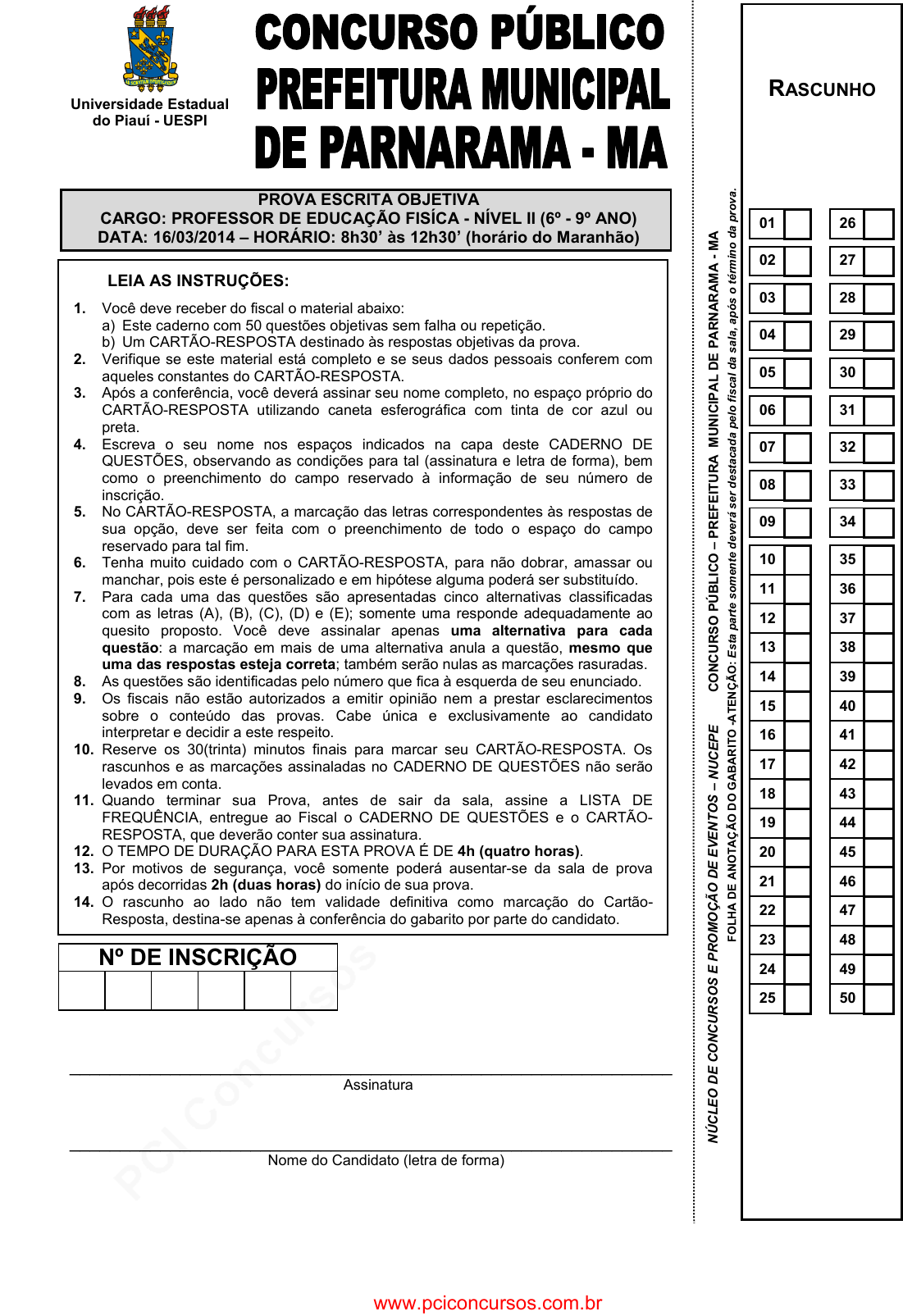pcimarkpci MDAwMDowMDAwOjAwMDA6MDAwMDowMDAwOmZmZmY6OTU0ZTpiOWI2:U3VuLCAyMiBKdW4gMjAyNSAxNDo1NjozMiAtMDMwMA== www.pciconcursos.com.br PROVA ESCRITA OBJETIVA CARGO: PROFESSOR DE EDUCAÇÃO FISÍCA - NÍVEL II (6º - 9º ANO) DATA: 16/03/2014 – HORÁRIO: 8h30’ às 12h30’ (horári o do Maranhão) LEIA AS INSTRUÇÕES: 1. Você deve receber do fiscal o material abaixo: a) Este caderno com 50 questões objetivas sem falha ou repetição. b) Um CARTÃO-RESPOSTA destinado às respostas objetivas da prova. 2. Verifique se este material está completo e se seus dados pessoais conferem com aqueles constantes do CARTÃO-RESPOSTA. 3. Após a conferência, você deverá assinar seu nome completo, no espaço próprio do CARTÃO-RESPOSTA utilizando caneta esferográfica com tinta de cor azul ou preta. 4. Escreva o seu nome nos espaços indicados na capa deste CADERNO DE QUESTÕES, observando as condições para tal (assinatura e letra de forma), bem como o preenchimento do campo reservado à informação de seu número de inscrição. 5. No CARTÃO-RESPOSTA, a marcação das letras correspondentes às respostas de sua opção, deve ser feita com o preenchimento de todo o espaço do campo reservado para tal fim. 6. Tenha muito cuidado com o CARTÃO-RESPOSTA, para não dobrar, amassar ou manchar, pois este é personalizado e em hipótese alguma poderá ser substituído. 7. Para cada uma das questões são apresentadas cinco alternativas classificadas com as letras (A), (B), (C), (D) e (E); somente uma responde adequadamente ao quesito proposto. Você deve assinalar apenas uma alternativa para cada questão : a marcação em mais de uma alternativa anula a questão, mesmo que uma das respostas esteja correta ; também serão nulas as marcações rasuradas. 8. As questões são identificadas pelo número que fica à esquerda de seu enunciado. 9. Os fiscais não estão autorizados a emitir opinião nem a prestar esclarecimentos sobre o conteúdo das provas. Cabe única e exclusivamente ao candidato interpretar e decidir a este respeito. 10. Reserve os 30(trinta) minutos finais para marcar seu CARTÃO-RESPOSTA. Os rascunhos e as marcações assinaladas no CADERNO DE QUESTÕES não serão levados em conta. 11. Quando terminar sua Prova, antes de sair da sala, assine a LISTA DE FREQUÊNCIA, entregue ao Fiscal o CADERNO DE QUESTÕES e o CARTÃO- RESPOSTA, que deverão conter sua assinatura. 12. O TEMPO DE DURAÇÃO PARA ESTA PROVA É DE 4h (quatro horas) . 13. Por motivos de segurança, você somente poderá ausentar-se da sala de prova após decorridas 2h (duas horas) do início de sua prova. 14. O rascunho ao lado não tem validade definitiva como marcação do Cartão- Resposta, destina-se apenas à conferência do gabarito por parte do candidato. Nº DE INSCRIÇÃO ____________________________________________________________ Assinatura ____________________________________________________________ Nome do Candidato (letra de forma) RASCUNHO 01 26 02 27 03 28 04 29 05 30 06 31 07 32 08 33 09 34 10 35 11 36 12 37 13 38 14 39 15 40 16 41 17 42 18 43 19 44 20 45 21 46 22 47 23 48 24 49 25 50 N Ú C LE O D E C O N C U R S O S E P R O M O Ç Ã O D E E V E N T O S – N U C E P E C O N C U R S O P Ú B LI C O – P R E F E IT U R A M U N IC IP A L D E P A R N A R A M A - M A F O LH A D E A N O T A Ç Ã O D O G A B A R IT O - A T E N Ç Ã O : E st a pa rt e so m en te d ev er á se r de st ac ad a pe lo fi sc al d a sa la , a pó s o té rm in o da p ro va . Universidade Estadual do Piauí - UESPI www.pciconcursos.com.br pcimarkpci MDAwMDowMDAwOjAwMDA6MDAwMDowMDAwOmZmZmY6OTU0ZTpiOWI2:U3VuLCAyMiBKdW4gMjAyNSAxNDo1NjozMiAtMDMwMA== www.pciconcursos.com.br CONCURSO PÚBLICO – PARNARAMA – PROFESSOR DE EDUCAÇÃO FISÍCA - NÍ VEL II (6º - 9º ANO) N º D E I N S C R I Ç Ã O www.pciconcursos.com.br pcimarkpci MDAwMDowMDAwOjAwMDA6MDAwMDowMDAwOmZmZmY6OTU0ZTpiOWI2:U3VuLCAyMiBKdW4gMjAyNSAxNDo1NjozMiAtMDMwMA== www.pciconcursos.com.br CONCURSO PÚBLICO – PARNARAMA – PROFESSOR DE EDUCAÇÃO FISÍCA - NÍ VEL II (6º - 9º ANO) LÍNGUA PORTUGUESA Apresentamos, a seguir, o trecho de uma conversa entre o sociólogo italiano Domenico De Masi e jornalista Alexandre Matias, publicada na Revista Galileu. Leia-o para responder às questões de 01 a 05. Matias: O Brasil é o país do futuro? De Masi : Não. Acho que o Brasil é, sim, o país do presente. Por 120 anos, vocês criaram o melhor modo de vida para a sociedade pós-industrial. Não é o melhor possível, mas é o melhor entre todos os que já foram testados. Ainda não é um modelo para o futuro, mas é válido para o tempo atual. Matias: O que une o Brasil? De Masi : A sociedade é unificada pela "língua geral": o sincretismo cultural, de grandes festas civis e religiosas incorporadas à vida das pessoas, a música, o papel das mulheres, a sensualidade sem culpa. (...) O Brasil é aberto ao novo e à mudança. Em comparação com o passado, há dois novos elementos: a consciência dos próprios desafios - a corrupção, a violência, a desigualdade, os déficits educacionais - está mais difundida e há a percepção de ser um país de ponta, diferente e positivo. (...) ( Revista Galileu, nº 271, fevereiro/2014, Seção Papo cabeça, p. 80-81). 01. O texto, considerando-se as características formais e funcionais a partir das quais se estrutura, pertence ao gênero a) entrevista. b) bate papo. c) depoimento. d) relato. e) relatório. 02. Em sua resposta à primeira pergunta, De Masi sugere que a) o modelo de Brasil de hoje deve ser projetado para o futuro. b) o modo de se viver, atualmente, no Brasil, não será o melhor para o futuro. c) a forma de se viver em sociedade, no Brasil, no futuro será tão boa quanto hoje. d) o modo de viver criado pela sociedade brasileira poderia ser ainda melhor, hoje. e) o modelo de sociedade que temos originou-se de comparações com outras sociedades. 03. Em relação ao aspecto linguístico-cultural, a segunda resposta 