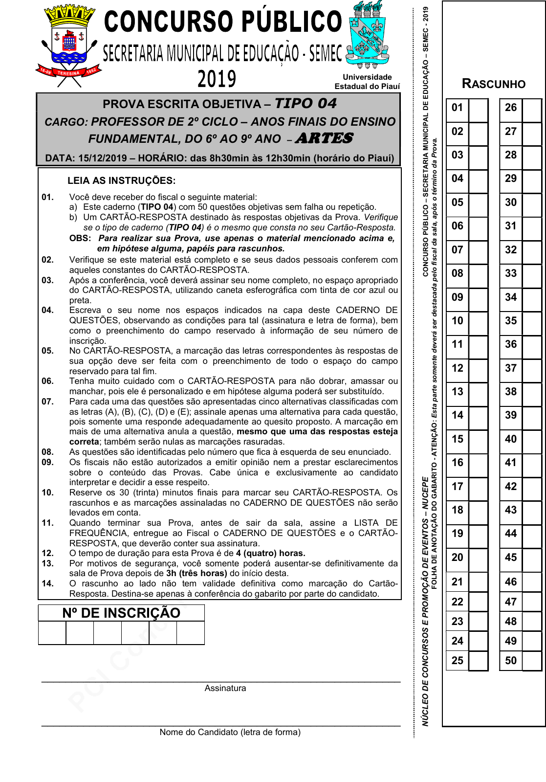 pcimarkpci MDAwMDowMDAwOjAwMDA6MDAwMDowMDAwOmZmZmY6OTU0ZTpiOWI2:U3VuLCAyMiBKdW4gMjAyNSAxNDo1NDozNCAtMDMwMA== www.pciconcursos.com.br PROVA ESCRITA OBJETIVA – TIPO 04 CARGO: PROFESSOR DE 2º CICLO – ANOS FINAIS DO ENSINO FUNDAMENTAL, DO 6º AO 9º ANO – ARTES DATA: 15/12/2019 – HORÁRIO: das 8h30min às 12h30min (horário do Piauí) LEIA AS INSTRUÇÕES: 01. Você deve receber do fiscal o seguinte material: a) Este caderno (TIPO 04) com 50 questões objetivas sem falha ou repetição. b) Um CARTÃO-RESPOSTA destinado às respostas objetivas da Prova. Verifique se o tipo de caderno (TIPO 04) é o mesmo que consta no seu Cartão-Resposta. OBS: Para realizar sua Prova, use apenas o material mencionado acima e, em hipótese alguma, papéis para rascunhos. 02. Verifique se este material está completo e se seus dados pessoais conferem com aqueles constantes do CARTÃO-RESPOSTA. 03. Após a conferência, você deverá assinar seu nome completo, no espaço apropriado do CARTÃO-RESPOSTA, utilizando caneta esferográfica com tinta de cor azul ou preta. 04. Escreva o seu nome nos espaços indicados na capa deste CADERNO DE QUESTÕES, observando as condições para tal (assinatura e letra de forma), bem como o preenchimento do campo reservado à informação de seu número de inscrição. 05. No CARTÃO-RESPOSTA, a marcação das letras correspondentes às respostas de sua opção deve ser feita com o preenchimento de todo o espaço do campo reservado para tal fim. 06. Tenha muito cuidado com o CARTÃO-RESPOSTA para não dobrar, amassar ou manchar, pois ele é personalizado e em hipótese alguma poderá ser substituído. 07. Para cada uma das questões são apresentadas cinco alternativas classificadas com as letras (A), (B), (C), (D) e (E); assinale apenas uma alternativa para cada questão, pois somente uma responde adequadamente ao quesito proposto. A marcação em mais de uma alternativa anula a questão, mesmo que uma das respostas esteja correta; também serão nulas as marcações rasuradas. 08. As questões são identificadas pelo número que fica à esquerda de seu enunciado. 09. Os fiscais não estão autorizados a emitir opinião nem a prestar esclarecimentos sobre o conteúdo das Provas. Cabe única e exclusivamente ao candidato interpretar e decidir a esse respeito. 10. Reserve os 30 (trinta) minutos finais para marcar seu CARTÃO-RESPOSTA. Os rascunhos e as marcações assinaladas no CADERNO DE QUESTÕES não serão levados em conta. 11. Quando terminar sua Prova, antes de sair da sala, assine a LISTA DE FREQUÊNCIA, entregue ao Fiscal o CADERNO DE QUESTÕES e o CARTÃO- RESPOSTA, que deverão conter sua assinatura. 12. O tempo de duração para esta Prova é de 4 (quatro) horas. 13. Por motivos de segurança, você somente poderá ausentar-se definitivamente da sala de Prova depois de 3h (três horas) do início desta. 14. O rascunho ao lado não tem validade definitiva como marcação do Cartão- Resposta. Destina-se apenas à conferência do gabarito por parte do candidato. Nº DE INSCRIÇÃO ____________________________________________________________ Assinatura ____________________________________________________________ Nome do Candidato (letra de forma) Universidade Estadual do Piauí RASCUNHO 01 26 02 27 03 28 04 29 05 30 06 31 07 32 08 33 09 34 10 35 11 36 12 37 13 38 14 39 15 40 16 41 17 42 18 43 19 44 20 45 21 46 22 47 23 48 24 49 25 50 N Ú C L E O D E C O N C U R S O S E P R O M O Ç Ã O D E E V E N T O S – N U C E P E C O N C U R S O P Ú B L IC O – S E C R E T A R IA M U N IC IP A L D E E D U C A Ç Ã O – S E M E C - 2 0 1 9 F O L H A D E A N O T A Ç Ã O D O G A B A R IT O - A T E N Ç Ã O : E s ta p ar te s o m e n te d e ve rá s er d e st ac a d a p el o f is c a l d a s al a, a p ó s o t ér m in o d a P ro v a. pcimarkpci MDAwMDowMDAwOjAwMDA6MDAwMDowMDAwOmZmZmY6OTU0ZTpiOWI2:U3VuLCAyMiBKdW4gMjAyNSAxNDo1NDozNCAtMDMwMA== www.pciconcursos.com.br CONCURSO PÚBLICO – SECRETARIA MUNICIPAL DE EDUCAÇÃO - SEMEC – 2019 2 N º D E I N S C R I Ç Ã O C O N C U R SO P Ú B L IC O – S E C R E T A R IA M U N IC IP A L D E E D U C A Ç Ã O - S E M E C – 2 01 9 pcimarkpci MDAwMDowMDAwOjAwMDA6MDAwMDowMDAwOmZmZmY6OTU0ZTpiOWI2:U3VuLCAyMiBKdW4gMjAyNSAxNDo1NDozNCAtMDMwMA== www.pciconcursos.com.br CONCURSO PÚBLICO – SECRETARIA MUNICIPAL DE EDUCAÇÃO - SEMEC – 2019 3 ARTES 01. O livro Arte, Educação e Inclusão: 10 anos de Cordão Grupo de Dança (2018) apresenta uma concepção e um contexto de arte que se comunica com o pensamento de Edgar Morin, quando este afirma que “a educação tem de deixar de ser apenas uma função, uma especialização, uma profissão e voltar a se tornar uma tarefa política por excelência, uma missão de transmissão de estratégias para a vida.” (MORIN, 2003 apud FREITAS; BREBIS, 2018). Correlacionando o citado pensamento de Morin com experimentações em arte, a relação que se configura é uma concepção de arte como a) dinâmica de utilização dos diversos espaços de produção, circulação e consumo. b) possibilidade de mediação cultural na relação entre artistas e público. c) mediação cultural na experimentação de técnicas específicas. d) estratégia para a vida por meio de criações colaborativas. e) vivência que dialoga com a realidade social de forma crítica e reflexiva. 02. A imagem apresentada (símbolo da Educação Física) mostra um dos grandes tesouros da arte na antiguidade clássica, a estátua que representa um atleta momentos antes de lançar um disco. Ao se apreciar a bela imagem, constata-se a obra a) “O Pensador”, de Auguste Rodin. b) “Venus de Milo”, de Alexandre de Antioquia. c) “David”, de Michelangelo. d) “O Doríforo”, de Policleto. e) “Discóbolo”, de Myron. https://www.imagexia.com 03. Artes visuais é a designação dada ao conjunto de artes que representam o mundo real ou imaginário e que tem a visão (sentido de ver) como principal caminho de pe