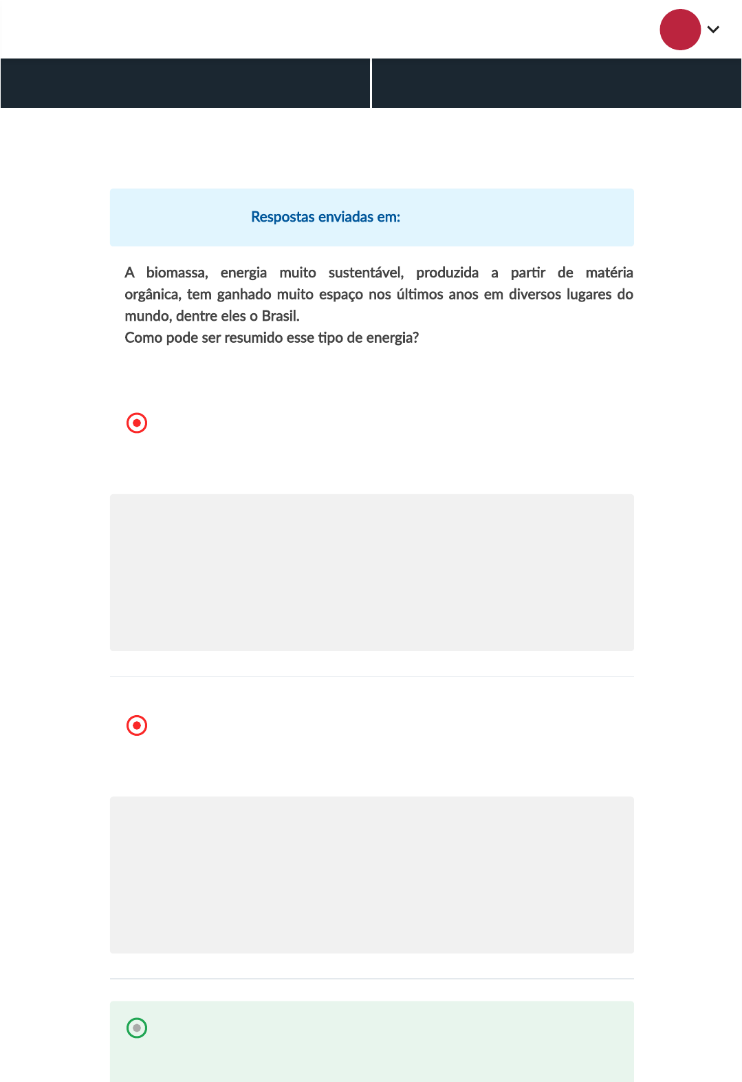Exercícios Respostas enviadas em: 24/06/2025 12:30 5. A biomassa, energia muito sustentável, produzida a par�r de matéria orgânica, tem ganhado muito espaço nos úl�mos anos em diversos lugares do mundo, dentre eles o Brasil. Como pode ser resumido esse �po de energia? Resposta incorreta. A. É proveniente da matéria orgânica dos animais. O gás oriundo da decomposição dessa matéria é armazenado e encanado conforme as necessidades das cidades. A biomassa é composta por matéria orgânica de origem vegetal ou animal, obtida por meio da decomposição de uma variedade de recursos, como madeira, resíduos agrícolas e até do lixo. A decomposição da biomassa produz energia química e, a partir daí, combustíveis como o biodiesel e o etanol. Resposta incorreta. B. Um misto de energia mecânica proveniente dos animais com energia solar da biosfera, produzindo resíduos orgânicos que produzem combustíveis derivados do petróleo. A biomassa é composta por matéria orgânica de origem vegetal ou animal, obtida por meio da decomposição de uma variedade de recursos, como madeira, resíduos agrícolas e até do lixo. A decomposição da biomassa produz energia química e, a partir daí, combustíveis como o biodiesel e o etanol. Você acertou! C. Composta por matéria orgânica de origem vegetal ou animal obtida por meio da decomposição de uma variedade de recursos, como madeira, resíduos agrícolas, Anterior Próximo CG como da cana de açúcar, e até do lixo. A decomposição da biomassa produz energia química e, a partir daí, combustíveis como o biodiesel e o etanol. A biomassa é composta por matéria orgânica de origem vegetal ou animal, obtida por meio da decomposição de uma variedade de recursos, como madeira, resíduos agrícolas e até do lixo. A decomposição da biomassa produz energia química e, a partir daí, combustíveis como o biodiesel e o etanol. Resposta incorreta. D. Um misto de energia solar com eólica, produzida nos canaviais. Pode ser utilizada na produção de açúcar, sendo combustível para as suas máquinas de extração do suco de cana. A biomassa é composta por matéria orgânica de origem vegetal ou animal, obtida por meio da decomposição de uma variedade de recursos, como madeira, resíduos agrícolas e até do lixo. A decomposição da biomassa produz energia química e, a partir daí, combustíveis como o biodiesel e o etanol. Resposta incorreta. E. Composta por matéria orgânica obtida por meio da decomposição apenas de recursos vegetais, como a cana de açucar. A decomposição da biomassa produz energia química e, a partir daí, combustíveis como o biodiesel e o etanol. A biomassa é composta por matéria orgânica de origem vegetal ou animal, obtida por meio da decomposição de uma variedade de recursos, como madeira, resíduos agrícolas e até do lixo. A decomposição da biomassa produz energia química e, a partir daí, combustíveis como o biodiesel e o etanol. Voltar Anterior Próximo CG