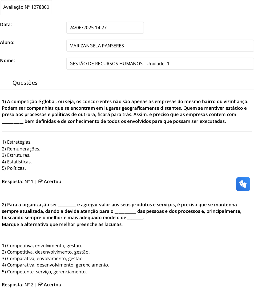 Questões 1) A competição é global, ou seja, os concorrentes não são apenas as empresas do mesmo bairro ou vizinhança. Podem ser companhias que se encontram em lugares geograficamente distantes. Quem se mantiver estático e preso aos processos e políticas de outrora, ficará para trás. Assim, é preciso que as empresas contem com ___________ bem definidas e de conhecimento de todos os envolvidos para que possam ser executadas. 1) Estratégias. 2) Remunerações. 3) Estruturas. 4) Estatísticas. 5) Políticas. Resposta: Nº 1 | Acertou 2) Para a organização ser _________ e agregar valor aos seus produtos e serviços, é preciso que se mantenha sempre atualizada, dando a devida atenção para o ___________ das pessoas e dos processos e, principalmente, buscando sempre o melhor e mais adequado modelo de ________. Marque a alternativa que melhor preenche as lacunas. 1) Competitiva, envolvimento, gestão. 2) Competitiva, desenvolvimento, gestão. 3) Comparativa, envolvimento, gestão. 4) Comparativa, desenvolvimento, gerenciamento. 5) Competente, serviço, gerenciamento. Resposta: Nº 2 | Acertou Avaliação Nº 1278800 Data: 24/06/2025 14:27 Aluno: MARIZANGELA PANSERES Nome: GESTÃO DE RECURSOS HUMANOS - Unidade: 1 2025 © Grupo UNICORP - Educação e Desenvolvimento Versão:2.3.0 3) Edgar Schein desenvolveu uma interessante analogia entre a cultura organizacional e o iceberg. Ele também desenvolveu os tópicos que aparecem na sequência, descrevendo os elementos tangíveis e os intangíveis. Marque a alternativa na qual se descrevem os elementos tangíveis e os intangíveis corretamente: 1) Elementos intangíveis da cultura organizacional: são caracterizados pelos aspectos formais da cultura organizacional. Elementos tangíveis da cultura organizacional: são os aspectos informais e subjetivos. 2) Elementos intangíveis da cultura organizacional: são caracterizados pelos aspectos formais da cultura organizacional. Elementos tangíveis da cultura organizacional: são os aspectos informais e objetivos. 3) Elementos tangíveis da cultura organizacional: são caracterizados pelos aspectos formais da cultura organizacional. Elementos intangíveis da cultura organizacional: são os aspectos informais e subjetivos. 4) Elementos tangíveis da cultura organizacional: são caracterizados pelos aspectos formais da cultura organizacional. Elementos intangíveis da cultura organizacional: são os aspectos informais e objetivos. 5) Elementos tangíveis da cultura organizacional: são caracterizados pelos aspectos formais da cultura organizacional. Elementos intangíveis da cultura organizacional: são os aspectos formais e subjetivos. Resposta: Nº 3 | Acertou 4) O clima organizacional é um poderoso indicador do grau de ________ dos colaboradores e gestores na percepção em relação a diversos aspectos da empresa, desde políticas de RH, estilo de gestão, processos de comunicação, oportunidade de participação, o quanto é possível melhorar por feedback, satisfação com o salário e com a ______________ de vida no trabalho. Marque a alternativa em que as palavras completam corretamente as lacunas. 1) Satisfação, qualidade. 2) Integração, qualidade. 3) Valorização, qualidade. 4) Interação, qualificação. 5) Satisfação, qualificação. Resposta: Nº 2 | Errou | Alternativa Correta: Nº 1 5) Existem dimensões universais que estão presentes nos diferentes países e nas diferentes culturas, sendo divididas em cinco dimensões: física, emocional, social, profissional, intelectual e espiritual. Sobre a Dimensão profissional, assinale a alternativa correta: 1) Engloba a satisfação do cliente com o trabalho e o desenvolvimento profissional. 2) Engloba a satisfação com o trabalho e o desenvolvimento profissional. 3) Engloba a satisfação do indivíduo com o trabalho e o desenvolvimento profissional. 4) Engloba a satisfação do fornecedor com o trabalho e o desenvolvimento profissional. 5) Engloba a satisfação do empreendedor com o trabalho e o desenvolvimento profissional. Resposta: Nº 3 | Acertou