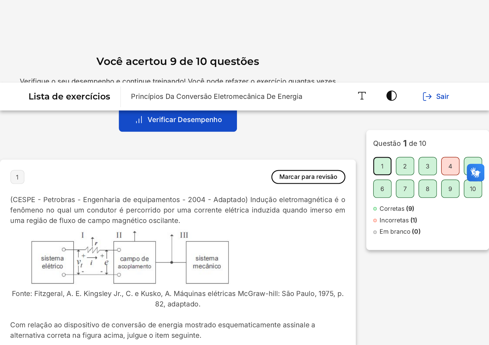 Você acertou 9 de 10 questões Verifique o seu desempenho e continue treinando! Você pode refazer o exercício quantas vezes quiser. Verificar Desempenho 1 Marcar para revisão (CESPE - Petrobras - Engenharia de equipamentos - 2004 - Adaptado) Indução eletromagnética é o fenômeno no qual um condutor é percorrido por uma corrente elétrica induzida quando imerso em uma região de fluxo de campo magnético oscilante. Fonte: Fitzgeral, A. E. Kingsley Jr., C. e Kusko, A. Máquinas elétricas McGraw-hill: São Paulo, 1975, p. 82, adaptado. Com relação ao dispositivo de conversão de energia mostrado esquematicamente assinale a alternativa correta na figura acima, julgue o item seguinte. Questão 1 de 10 Corretas (9) Incorretas (1) Em branco (0) 1 2 3 4 5 6 7 8 9 10 Lista de exercícios Princípios Da Conversão Eletromecânica De Energia Sair A B C D E O esquema mostrado refere-se ao funcionamento de geradores elétricos. O esquema é inadequado para motores elétricos. As três setas verticais, I, II e III, representam as perdas de energia do sistema: elétricas, no campo de acoplamento e mecânicas, respectivamente. Se não houver movimento mecânico, a variação da energia no sistema elétrico é igual à variação da energia no campo de acoplamento. Havendo movimento mecânico a força é nula. Supondo que o acoplamento desse dispositivo seja de origem magnética, é correto inferir que a energia e a co-energia armazenadas no campo magnético de acoplamento são iguais. Resposta correta Parabéns, você selecionou a alternativa correta. Confira o gabarito comentado! Gabarito Comentado Avaliando o fluxo de cargas apresentado no conteúdo, há três pontos de perdas principais que devemos nos atentar durante o processo, sendo eles indicados pelas setas I, II e III: Em I: as perdas decorrentes dos componentes elétricos; Em II: perdas devido à interação entre os sistemas, acoplamento; Em III: perdas devido às peças mecânicas envolvidas no processo. A B C D E 2 Marcar para revisão Indução eletromagnética é o fenômeno no qual um condutor é percorrido por uma corrente elétrica induzida quando imerso em uma região de fluxo de campo magnético oscilante. Dentro deste contexto, considere dois enrolamentos com os seguintes dados: A corrente que circula pelas bobinas é a mesma dada por: Em qual posição ocorre o torque médio de maior valor? L21 = L12 = cos(θ) L(22 =)2 L(11 =)1 i = I 30° -30° 270° 90° 180° A B Resposta correta Parabéns, você selecionou a alternativa correta. Confira o gabarito comentado! Gabarito Comentado Avaliando a equação O torque médio é negativo. O seno máximo ocorre na posição em que o ângulo é 90. Contudo o torque é negativo, logo em 270/-90° tem-se um valor máximo negativo, fazendo com que o torque médio alcance o máximo positivo. 3 Marcar para revisão Indução eletromagnética é o fenômeno no qual um condutor é percorrido por uma corrente elétrica induzida quando imerso em uma região de fluxo de campo magnético oscilante. Dentro deste contexto, o que se pode afirmar acerca do torque instantâneo: Ao elevar a corrente do estator, a amplitude da parcela do rotor se altera. Ao elevar a corrente do estator, a amplitude da parcela do rotor e mutua se alteram. C D E Ao elevar a corrente do estator, a amplitude da parcela do estator e mútua se alteram. Ao elevar a corrente do estator, a amplitude da parcela do estator se altera, somente. Ao elevar a corrente do estator, a amplitude da parcela mútua se altera, somente. Resposta correta Parabéns, você selecionou a alternativa correta. Confira o gabarito comentado! Gabarito Comentado Avaliando a equação: Ao elevar a corrente do estator, a amplitude da parcela do estator e mútua se alteram. 4 Marcar para revisão Indução eletromagnética é o fenômeno no qual um condutor é percorrido por uma corrente elétrica induzida quando imerso em uma região de fluxo de campo magnético oscilante. Neste contexto, considere um circuito cuja a indutância depende da posição da parte móvel, descrita como segue: x(cm) 0 0,1 0,2 0,4 0,8 1 1,4 1,6 2 A B C D E L[mH] 1,10 1,12 1,3 1,5 1,7 1,8 2,2 2,5 2,8 Para um fluxo de 0,002Wb e um deslocamento é de 1,2 cm, qual a energia armazenada no campo desse sistema? Wcamp (λ,x) = 10μJ Wcamp (λ,x) = 1μJ Wcamp (λ,x) = 10 J Wcamp (λ,x) = 5 J Wcamp (λ,x) = 15 J Resposta incorreta Opa! A alternativa correta é a letra A. Confira o gabarito comentado! Gabarito Comentado A B 5 Marcar para revisão Indução eletromagnética é o fenômeno no qual um condutor é percorrido por uma corrente elétrica induzida quando imerso em uma região de fluxo de campo magnético oscilante. Dentro deste contexto, considere uma máquina rotativa de dupla alimentação, sendo uma no rotor (1) e uma no estator (1). São dadas as seguintes indutâncias (mH): A corrente que circula pelas bobinas é a mesma dada por: Assinale a alternativa que descreve o torque em função da posição. L21 = L12 = 2sen(2θ) L(22 =)2 L(11 =)1 i = sen(2θ) Tcamp = (sen(2θ)2)cos(θ) Tcamp = 4(sen(θ)2)cos(2θ) C D E Tcamp = 4(sen(2θ)2)cos(2θ) Tcamp = (sen(2θ)2)cos(2θ) Tcamp = 4(sen(θ)2)cos(θ) Resposta correta Parabéns, você selecionou a alternativa correta. Confira o gabarito comentado! Gabarito Comentado Pode-se derivar a equação da coenergia aplicando-se: 6 Marcar para revisão (CESPE - Telebras - Engenheiro Eletricista - 2013 - Adaptado) Indução eletromagnética é o fenômeno no qual um condutor é percorrido por uma corrente elétrica induzida quando imerso em uma região A B C de fluxo de campo magnético oscilante. Considere a figura a seguir: Fonte: CESPE - Telebras - Engenheiro Eletricista - 2013. A figura acima representa o esquema de um circuito magnético alimentado por uma bobina com corrente constante i. O núcleo ferromagnético é constituindo por um material com permeabilidade magnética relativa igual a 10.000. A seção reta ao longo do entreferr