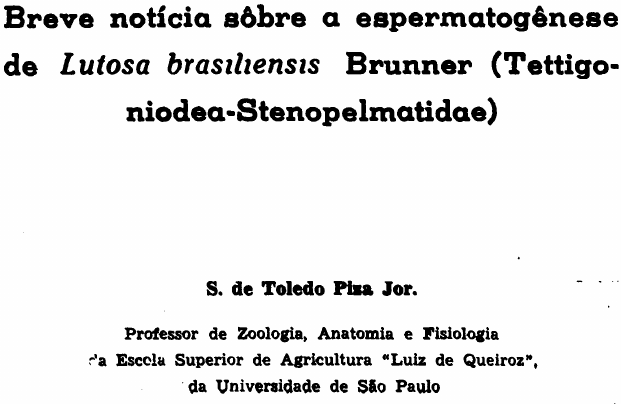 Breve notícia sôbre a espermatogênese de Lutosa brasiliensis Brunner (Tettigo¬ niodea-Stenopelmatidae) S. de Toledo Piza Jor. Professor de Zoologia, Anatomia e Fisiologia da Escola Superior de Agricultura "Luiz de Queiroz", da Universidade de São Paulo A presente observação foi feita em material fixado em Al len-Bauer e colorido pela hematoxilina de Heldenhain, pro veniente de um único indivíduo capturado na Escola. Os espermatogônios em metáfase exibem 15 cromossômios, ou sejam 14 autossômios e 1 cromossômio sexual. (Fig. 1). Os autossômios são representados por um par de elementos mui to grandes, dois pares de elementos de tamanho médio e qua tro pires de elementos pequenos. Todos eles sao mediocêntri cos. O sexo-cromossômio tem aproximadamente as dimensões dos autossômios de tamanho médio e apresenta o cinetocore perto de uma das extremidades. Nas divisões espermatogoniais nota-se acentuada dificul dade do cromossômio sexual em abandonar a região equatorial. Geralmente a divisão dêsse elemento parece operar-se sob fri ca atuação dos pólos, ficando os cromossômios resultantes es¬ tirados paralelamente ao eixo do fuso. (Fig. 2). Às vezes, po rém, tem-se a impressão, que a divisão se processa sem qual quer influência polar, ficando os cromossômios-filhos, ao lado um do outro a alguma distância, no equador da célula. (Figs. 3 e 4) Mesmo no primeiro caso, o efeito que se desenvolve en tre os polos o os cinetocores é fraco demais para arrastar os cromossômios, o que se pode atribuir a uma atividade cinética muito reduzida dos centrômeros. Quando a divisão do esper¬ matogônio se conclui, cada uma das células resultantes fica com o seu sexo-cromossômio, o qual permanece por algum tem po na posição em que se encontrava, para mais tarde incorpo rar-se ao núcleo. (Fig. 5). A situação dos cromossômios sexuais no plano de divisão do espermatogônio sugere a possibilidade da passagem de am bos para a mesma célula, o que de fato às vezes se verifica. Também pode acontecer, num ou noutro caso, que a parede nuclear se forme antes que o sexo-cromossômio se tenha apro ximado suficientemente, ficando este do lado de fora do núcleo. Os espermatócitos primários sao providos de corpos cromᬠtóides variáveis em número e tamanho. Na fase leptotene da prófase além de minúsculos grânulos, um ou outro pequeno corpo pode ser visto no citoplasma. O cromossômio sexual, nes sa fase, é piriforme, apresentando-se bastante alongado na sua extremidade mais afilada. (Fig. 6). Depois do pareamento, is to é, na fase paquitene, o núcleo se mostra bem maior que nas fases precedentes, o sexo-cromossômio mais contraido e os pa- quinemas formados por dois filamentos dispostos lado a lado, nos quais os cromômeros aparecem com grande clareza, prin cipalmente no par de autossômios relacionado com o cromos sômio X (Fig. 7). Nessa fase os corpos cromatóides aumentam de tamanho, sobressaindo-se um, de forma esférica e às vezes vacuolizado. Nenhum corpúsculo foi reconhecido com seguran ça no interior do núcleo, que pudesse ter sido tomado por um verdadeiro plasmossômio. Por essa razão, apesar da semelhan ça, não foi possível estabelecer qualquer relação entre corpos cromatóides e nucléolos, como foi anteriormente feito. (Cf. PI¬ ZA 1945, 1945a). Raramente pude observar a presença de dois sexo-cromos¬ sômios no interior do mesmo núcleo, possibilidade aliás espe rada em face do comportamento desses cromossômios nas mi toses espermatogoniais. (Fig. 8). Se não tiver havido engano nessa minha observação, poderei afirmar que os cromossômios X, quando em dose dupla no núcleo no estado paquitene, não se paream entre si e nem sequer se aproximam. Em apenas duas células em paquitene foi-me possível cons tatar a presença do sexo-cromossômio do lado de fora do nú¬ cleo, quase encostado na sua parede. (Fig. 9). Esse fato, aliado ao comportamento do cromossômio sexual nas mitoses espe¬ matogoniais, levam-me a imaginar o mecanismo que deve ter dado origem aos casos em que normalmente o cromossômio X não se reúne aos demais cromossômios, ficando no interior de um pequeno núcleo ao lado do núcleo que contém os autosso mios. Realmente, pode-se muito bem supor que acidentes des sa natureza tenham-se fixado como condutas normais no de curso da evolução de algumas espécies. A fase paquitene se encaminha sem novidades para a fase diiolotene, que se apresenta como nos demais Ortôpteros, sendo que o diplonema correspondentes aos autossomios maiores, do bra-se para caber no núcleo. A diacinese é normal. Na metafase nota-se que os autossomios, formando 7 té¬ trades, têm acentuada propensão para se reunirem num bloco único. Meroio quando separados, observa-se, frequentemente, a passagem de substância cromossômica de um para outro. (Fig. 10). O cromossômio X fica sempre fora do plano equatorial. Nas vistas laterais pode-se constatar que esse elemento, na quase totalidade dos casos, se encontra num dos pólos, fora da área do fuso e completamente desorientado. Uma das tétrades é consideravelmente maior que as outras, O corpo cromatóide mais volumoso, acompanhado ou não de outros menores, en contra-se ao acaso na célula. Na anáfasr os autossômios revelam igual tendência de se aglomerarem. (Pig. 11). No final dessa fase verifica-se, mais facilmente nos maiores, que os cromossômios já se acham di vididos. Quando os espermatócitos secundários se separam os corpos cromatóide ficam no citoplasma de um ou de outro, ao acaso. O cromossômio X, que se encontra num dos pólos, incor pora-se ao núcleo que se constitui nesse pólo. Na telófase os autossômios se distendem e o núcleo assu me o aspecto de um começo de prótese. O sexo-cro mossômio conserva-se inalterado. Depois de algum tempo os autosôsmios entram novamente a se contrair, tornando-se lo go possível verificar que eles sao formados por dois cromatidios intei