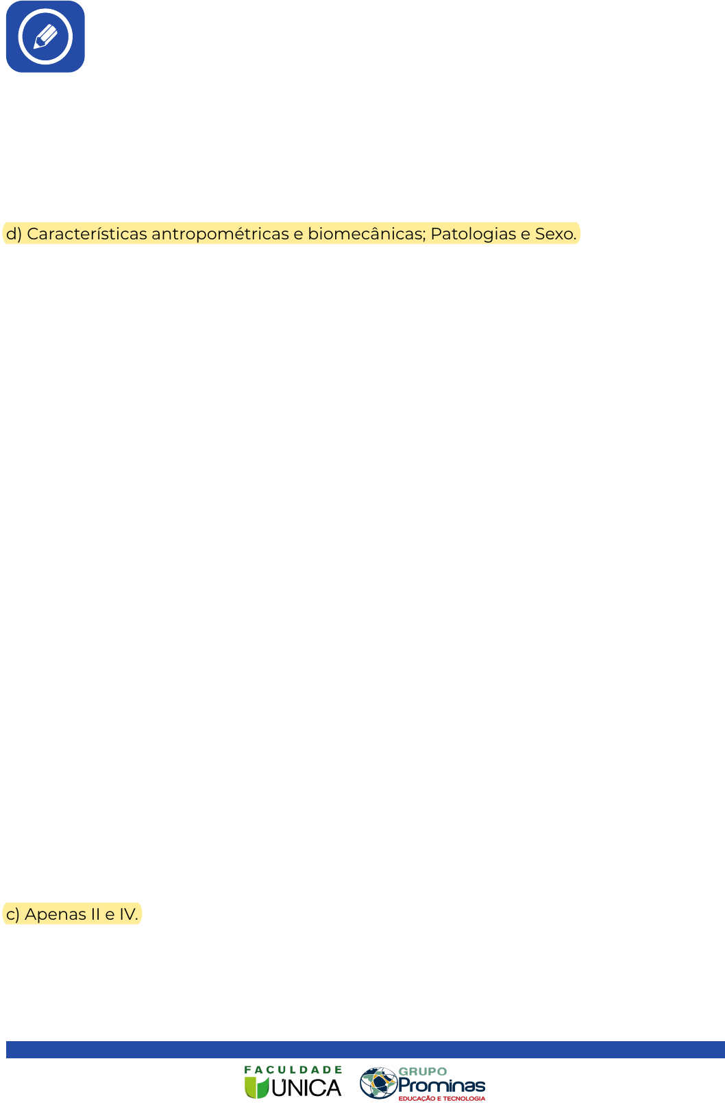87 FIXANDO O CONTEÚDO 1. Das opções abaixo, qual delas influencia significativamente no comportamento do centro de gravidade no corpo humano? a) Características antropométricas e biomecânicas; Hábitos de vida e Família. b) Sexo; Composição Corporal e Nível Social. c) Patologias; Sexo e Características Psicológicas. d) Características antropométricas e biomecânicas; Patologias e Sexo. e) Patologias; Composição Corporal e Aspectos Educacionais. 2. Movimentos angulares ocorrem em torno de uma linha imaginária chamada eixo de rotação; desse modo, um atleta, ao realizar um giro em pé no eixo longitudinal (ou crânio caudal) ou um mortal para trás, no eixo transversal e na posição grupada, pratica movimentos que ocorrem em torno de um eixo que atravessa o centro de massa, mas com diferenças, principalmente, em relação ao grau de dificuldade. Assinale as alternativas corretas: I. O grau de dificuldade do giro em torno de eixo longitudinal será maior, pois o momento de inércia em torno do eixo é maior em relação ao giro no eixo transversal. Desse modo, a aceleração angular também será menor, devido o maior momento de inércia em relação ao eixo. II. A distribuição da massa em torno do eixo transversal é maior em relação ao eixo longitudinal, desse modo, a aceleração angular será maior no giro realizado no eixo longitudinal, já que há uma menor resistência à rotação em torno desse eixo. III. A massa do atleta está distribuída ao longo do eixo transversal com relativa proximidade a ele. Já com relação ao eixo longitudinal, a mesma massa estará a uma distância muito maior em relação ao eixo de rotação. Desse modo, o momento de inércia é maior no segundo caso. IV. A realização do giro em torno do eixo longitudinal terá um menor grau de dificuldade, pois o fator que influencia mais dramaticamente o momento angular é a distribuição de massa em relação ao eixo de rotação, porque o momento angular é proporcional ao quadrado do raio de giro. Estão relacionados, com um menor ou maior grau de dificuldade, aos giros: a) Apenas I e II. b) Apenas I e III. c) Apenas II e IV. d) Apenas I, II e IV. e) Apenas I, III e IV. 3. Modalidades de luta como o judô necessitam de um grande equilíbrio corporal, pois se o oponente aplicar o “ippon”, por exemplo, que é o golpe que acontece na projeção com 88 queda, o atleta cai com as costas por completo no tatame e perde a luta. Lembrando que o equilíbrio corporal está relacionado com a altura do centro de gravidade acima da base de sustentação, do tamanho da base de sustentação, da localização da linha da gravidade na base de sustentação e com a massa corporal. Assinale a alternativa correta acerca das características relacionadas ao equilíbrio corporal. a) Quando a linha do centro de gravidade do atleta se move para fora da base de sustentação, a estabilidade é perturbada e o centro de gravidade poderá cair em direção ao solo caso o equilíbrio não seja retomado rapidamente, por isso, ter um alto centro de gravidade aprimora o equilíbrio. b) O atleta terá um maior equilíbrio se antecipar uma força do oponente vindo em sua direção anteroposterior posicionando os pés nessa direção, com um pé na sua frente e o outro atrás, ajudando assim a manter o seu centro de massa dentro da base de sustentação. c) Quanto mais próxima à localização do CG do limite da base de sustentação, menor será o equilíbrio. Por isso, lutadores que lutam com as pernas estendidas têm um maior equilíbrio, além de uma maior velocidade para mover o seu centro de gravidade para fora da base de sustentação. d) Se o oponente aplicar uma força direcionada lateralmente, ele deverá abaixar o seu centro de gravidade, flexionando os joelhos e o quadril, e deixar os pés próximos um do outro, assim ele manterá a linha da gravidade dentro de uma base de sustentação mais ampla. e) Quanto mais alto é o centro de gravidade e mais pesado é o atleta, mais estável ele ficará. Ao manter o seu centro de gravidade alto, ele conseguirá se mover mais rapidamente para fora da sua base de sustentação e, desse modo, aplicar o golpe rapidamente, além de ter um maior equilíbrio. 4. O stiff (imagem) é um exercício de força que tem como principais músculos recrutados os isquiotibiais, glúteos e eretores da espinha. O movimento desse exercício se inicia em pé, segurando uma barra com os braços estendidos e, em seguida, flexiona-se o quadril mantendo as pernas estendidas ou com uma pequena flexão dos joelhos. Ademais, a coluna deve ficar ereta durante todo o movimento. Assinale as afirmativas a seguir, relacionadas ao movimento realizado durante a execução do stiff, e classifique-as em verdadeiras (V) ou falsas (F). ( ) Após a posição ereta, conforme ocorre a flexão do quadril, a maior alavanca resistiva será quando o tronco formar um ângulo de 90° em relação à coxa e, consequentemente, 89 nesse ângulo, também haverá o maior torque muscular para vencer a resistência. ( ) Durante a flexão do quadril, a barra deverá seguir uma trajetória onde permaneça sobre os pés, ou seja, sobre a base de apoio. Desse modo, haverá um maior equilíbrio para executar o movimento. Caso a barra ultrapasse a linha dos pés, haverá uma perda do equilíbrio para frente. ( ) O maior torque muscular será na posição ereta, pois nessa posição a barra estará mais próxima do quadril. Ao flexionar o quadril, haverá um aumento do braço de alavanca da resistência e, consequentemente, uma diminuição do torque muscular. ( ) Uma maneira de aumentar o torque muscular é realizar uma pequena flexão do quadril. Como o torque resistivo e o torque muscular seguem uma relação inversa, ao ter uma pequena alavanca resistiva, haverá um pequeno torque motor ou muscular. Assinale a alternativa que apresenta a ordem correta: a) V - V - F - F. b) V - F - F - F. c) V - F - V - F. d) F - F - V 