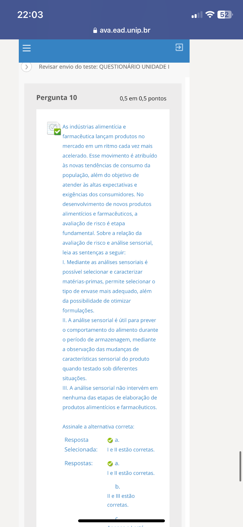 22:03 52 ava.ead.unip.br Revisar envio do teste: QUESTIONÁRIO UNIDADE Pergunta 10 0,5 em 0,5 pontos As indústrias alimentícia e farmacêutica lançam produtos no mercado em um ritmo cada vez mais acelerado. Esse movimento é atribuído às novas tendências de consumo da população, além do objetivo de atender às altas expectativas e exigências dos consumidores. No desenvolvimento de novos produtos alimentícios e farmacêuticos, a avaliação de risco é etapa fundamental. Sobre a relação da avaliação de risco e análise sensorial, leia as sentenças a seguir: I. Mediante as análises sensoriais é possível selecionar e caracterizar matérias-primas, permite selecionar O tipo de envase mais adequado, além da possibilidade de otimizar formulações. II. A análise sensorial é útil para prever O comportamento do alimento durante O período de armazenagem, mediante a observação das mudanças de características sensorial do produto quando testado sob diferentes situações. III. A análise sensorial não intervém em nenhuma das etapas de elaboração de produtos alimentícios e farmacêuticos. Assinale a alternativa correta: Resposta a. Selecionada: I e estão corretas. Respostas: a. le estão corretas. b. e III estão corretas.