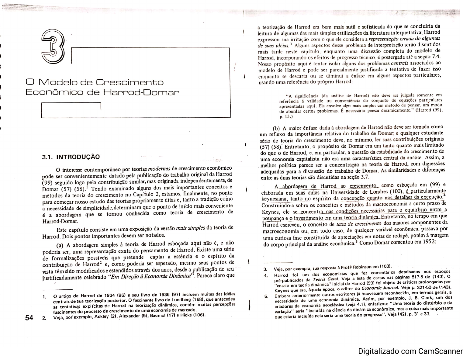 a teorização de Harrod era bem mais sutil e sofisticada do que se concluiria da leitura de algumas das mais simples estilizações da literatura interpretativa; Harrod expressou sua irritação com que ele considera a representação errada de algumas de suas idéias.³ Alguns aspectos desse problema de interpretação serão discutidos mais tarde neste enquanto uma discussão completa do modelo de Harrod, incorporando os efeitos de progresso técnico, é postergada até a seção 7.4. Nosso propósito aqui é tentar isolar alguns dos problemas centrais associados ao modelo de Harrod e pode ser parcialmente justificada a tentativa de fazer isso enquanto se descarta ou se diminui a ênfase em alguns aspectos particulares, Modelo de usando uma referência do próprio Harrod: Econômico de Harrod-Doman "A significância (da análise de Harrod) não deve ser julgada somente em referência à validade ou conveniência do conjunto de equações particulares apresentadas aqui. Ela envolve algo mais amplo: um método de pensar, um modo de abordar certos problemas. É necessário pensar dinamicamente." (Harrod (99), p. 15.) (b) A maior ênfase dada à abordagem de Harrod não deve ser tomada como um reflexo da importância relativa do trabalho de Domar; e qualquer estudante sério de teoria do crescimento deve, no mínimo, ler suas contribuições originais (57) (58): Entretanto, o propósito de Domar era um tanto quanto mais limitado do que o de Harrod, e, em particular, a questão da estabilidade do crescimento de 3.1. INTRODUÇÃO uma economia capitalista não era uma característica central da análise. Assim, a melhor política parece ser a concentração na teoria de Harrod, com digressões interesse contemporâneo por teorias modernas de crescimento econômico adequadas para a discussão do trabalho de Domar. As similaridades e diferenças pode ser convenientemente datado pela publicação do trabalho original da Harrod entre as duas teorias são discutidas na seção 3.7. (99) seguido logo pela contribuição similar, mas originada independentemente, de Domar (57) (58). Tendo examinado alguns dos mais importantes conceitos e A abordagem de Harrod ao como esboçada em (99) e métodos da teoria do crescimento no Capítulo 2, estamos, finalmente, no ponto elaborada em suas aulas na Universidade de Londres (100), é particularmente para começar nosso estudo das teorias propriamente ditas e, tanto a tradição como keynesiana, tanto no espírito da concepção quanto nos detalhes da execução.⁴ a necessidade de simplicidade, determinam que o ponto de início mais conveniente Construindo-a sobre os conceitos e métodos da macroeconomia a curto prazo de é a abordagem que se tomou conhecida como teoria de crescimento de Keynes, ele se concentra nas condições necessárias para o equilíbrio entre a poupança e o investimento em uma teoria Entretanto, no tempo em que Harrod-Domar. Harrod escreveu, o conceito de taxa de crescimento dos maiores componentes da Este capítulo consiste em uma exposição da versão mais simples da teoria de macroeconomia ou, em todo caso, de qualquer variável econômica, passava por Harrod. Dois pontos importantes devem ser notados. uma curiosa fase constituída de apreciações em notas de rodapé, porém à margem (a) A abordagem simples à teoria de Harrod esboçada aqui não é, e não do corpo principal da análise econômica.⁵ Como Domar comentou em 1952: poderia ser, uma representação exata do pensamento de Harrod. Existe uma série de formalizações possíveís que pretende captar a essência e o espírito da contribuição de Harrod² e, como poderia ser esperado, mesmo seus pontos de vista têm sido modificados e estendidos através dos anos, desde a publicação de seu 3. Veja, por exemplo, sua resposta Profa Robinson em (103). justificadamente celebrado "Em Direção à Economia Dinâmica". Parece claro que 4. Harrod foi um dos economistas que fez comentários detalhados nos esboços pré-publicados da Teoria Geral. Veja a lista de cartas nas páginas 517-8 de (143). o "ensaio em teoria dinâmica" inicial de Harrod (99) foi objeto de críticas prolongadas por Keynes que era, época, o editor do Economic Journal. Veja p. 321-50 de (143). 1. o artigo de Harrod de 1934 (96) e seu livro de 1936 (97) incluem muitas das idéias 5. Embora anteriormente outros escritores já houvessem reconhecido, em termos gerais, a centrais teorização posterior. fascinante livro de Lundberg (168), que antecedeu necessidade de uma economia dinâmica. Assim, por exemplo, J. B. Clark, um dos as tentativas explícitas de Harrod na teorização dinâmica, contém muitas percepções criadores da economia neoclássica (veja 4.1), enfatizou: "Uma teoria do distúrbio e da fascinantes do processo de crescimento de uma economia de variação" seria "incluída na ciência da dinâmica econômica, mas a coisa mais importante 54 2. Veja, por exemplo, Ackley (2), Alexander (5), Baumol (17) e Hicks (106). que estaria incluída nela seria uma teoria do progresso". Veja (42), p. 31 e 33. Digitalizado com CamScanner"Em teoria econômica, crescimento tem ocupado um lugar estranho: parece preços relativos são constantes,⁶ e nesse caso as principais variáveis macro do estar sempre pelas redondezas mas raramente é convidado para dentro. De modo modelo de Harrod podem ser interpretadas como agregadas com base no valor. que, ou foi tomado como pacífico, ou foi tratado como uma reflexão posterior" (Domar (59), 16). Nas palavras de Hicks: "Quando preços são constantes, as quantidades de serviços podem ser Dado que o pós-guerra se enquietou com altas taxas de crescimento somadas, somando-se seus valores monetários; os valores monetários transformam-se econômico e, mais tarde, com possíveis "limites ao é difícil em índices de volumes." (Hicks (108), p. 78.) compreender a relativamente curta vida pública do interesse teórico pelas causas e mecanismos do crescimento econ