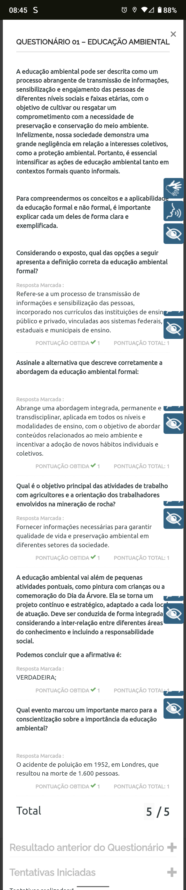 08:45 S 88% QUESTIONÁRIO 01 EDUCAÇÃO AMBIENTAL A educação ambiental pode ser descrita como um processo abrangente de transmissão de informações, sensibilização e engajamento das pessoas de diferentes níveis sociais e faixas etárias, com objetivo de cultivar ou resgatar um comprometimento com a necessidade de preservação e conservação do meio ambiente. Infelizmente, nossa sociedade demonstra uma grande negligência em relação a interesses coletivos, como a proteção ambiental. Portanto, é essencial intensificar as ações de educação ambiental tanto em contextos formais quanto informais. Para compreendermos os conceitos e a aplicabilidad da educação formal e não formal, é importante explicar cada um deles de forma clara e exemplificada. Considerando exposto, qual das opções a seguir apresenta a definição correta da educação ambiental formal? Resposta Marcada Refere-se a um processo de transmissão de informações e sensibilização das pessoas, incorporado nos currículos das instituições de ensin público e privado, vinculadas aos sistemas federais, estaduais e municipais de ensino. PONTUAÇÃO OBTIDA 1 PONTUAÇÃO TOTAL: 1 Assinale a alternativa que descreve corretamente a abordagem da educação ambiental formal: Resposta Marcada Abrange uma abordagem integrada, permanente e transdisciplinar, aplicada em todos os níveis e modalidades de ensino, com o objetivo de abordar conteúdos relacionados ao meio ambiente e incentivar a adoção de novos hábitos individuais e coletivos. PONTUAÇÃO OBTIDA 1 PONTUAÇÃO TOTAL: 1 Qual é o objetivo principal das atividades de trabalho com agricultores e a orientação dos trabalhadores envolvidos na mineração de rocha? Resposta Marcada Fornecer informações necessárias para garantir qualidade de vida e preservação ambiental em diferentes setores da sociedade. PONTUAÇÃO OBTIDA 1 PONTUAÇÃO TOTAL: 1 A educação ambiental vai além de pequenas atividades pontuais, como pintura com crianças ou a comemoração do Dia da Árvore. Ela se torna um projeto contínuo e estratégico, adaptado a cada loc de atuação. Deve ser conduzida de forma integrada considerando a inter-relação entre diferentes áreas do conhecimento e incluindo a responsabilidade social. Podemos concluir que a afirmativa é: Resposta Marcada VERDADEIRA; PONTUAÇÃO OBTIDA 1 PONTUAÇÃO Qual evento marcou um importante marco para a conscientização sobre a importância da educação ambiental? Resposta Marcada acidente de poluição em 1952, em Londres, que resultou na morte de 1.600 pessoas. PONTUAÇÃO OBTIDA PONTUAÇÃO TOTAL: 1 Total Resultado anterior do Questionário + Tentativas Iniciadas +
