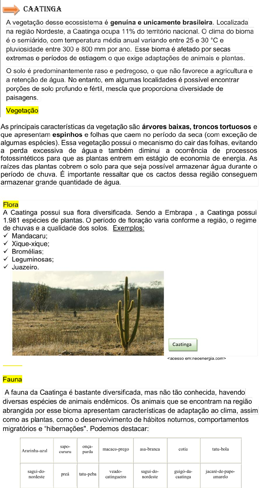 CAATINGA A vegetação desse ecossistema é genuína e unicamente brasileira. Localizada na região Nordeste, a Caatinga ocupa 11% do território nacional. clima do bioma é o semiárido, com temperatura média anual variando entre 25 e 30 °C e pluviosidade entre 300 e 800 mm por ano. Esse bioma é afetado por secas extremas e períodos de estiagem. o que exige adaptações de animais e plantas. solo é predominantemente raso e pedregoso, o que não favorece a agricultura e a retenção de água. No entanto, em algumas localidades é possível encontrar porções de solo profundo e fértil, mescla que proporciona diversidade de paisagens. Vegetação As principais características da vegetação são árvores baixas, troncos tortuosos e que apresentam espinhos e folhas que caem no período da seca (com exceção de algumas espécies). Essa vegetação possui o mecanismo do cair das folhas, evitando a perda excessiva de água e também diminui a ocorrência de processos fotossintéticos para que as plantas entrem em estágio de economia de energia. As raízes das plantas cobrem o solo para que seja possível armazenar água durante o período de chuva. É importante ressaltar que os cactos dessa região conseguem armazenar grande quantidade de água. Flora A Caatinga possui sua flora diversificada. Sendo a Embrapa a Caatinga possui 1.981 espécies de plantas. período de floração varia conforme a região, o regime de chuvas e a qualidade dos solos. Exemplos: Mandacaru; Xique-xique; Bromélias; Leguminosas; Juazeiro. Caatinga Fauna A fauna da Caatinga é bastante diversificada, mas não tão conhecida, havendo diversas espécies de animais endêmicos. Os animais que se encontram na região abrangida por esse bioma apresentam características de adaptação ao clima, assim como as plantas, como o desenvolvimento de hábitos noturnos, comportamentos migratórios e "hibernações". Podemos destacar: sapo- onça- Ararinha-azul macaco-prego asa-branca cotia tatu-bola cururu parda sagui-do- veado- nordeste tatu-peba sagui-do- guigó-da- jacaré-de-papo- catingueiro nordeste caatinga amarelo