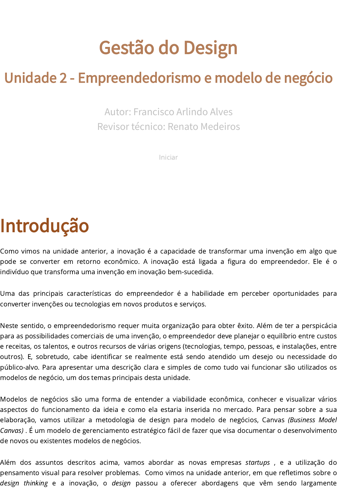 Gestão do Design Unidade 2 - Empreendedorismo e modelo de negócio Autor: Francisco Arlindo Alves Revisor técnico: Renato Medeiros Iniciar Introdução Como vimos na unidade anterior, a inovação é a capacidade de transformar uma invenção em algo que pode se converter em retorno econômico. A inovação está ligada a figura do empreendedor. Ele é o indivíduo que transforma uma invenção em inovação bem-sucedida. Uma das principais características do empreendedor é a habilidade em perceber oportunidades para converter invenções ou tecnologias em novos produtos e serviços. Neste sentido, o empreendedorismo requer muita organização para obter êxito. Além de ter a perspicácia para as possibilidades comerciais de uma invenção, o empreendedor deve planejar o equilíbrio entre custos e receitas, os talentos, e outros recursos de várias origens (tecnologias, tempo, pessoas, e instalações, entre outros). E, sobretudo, cabe identificar se realmente está sendo atendido um desejo ou necessidade do público-alvo. Para apresentar uma descrição clara e simples de como tudo vai funcionar são utilizados os modelos de negócio, um dos temas principais desta unidade. Modelos de negócios são uma forma de entender a viabilidade econômica, conhecer e visualizar vários aspectos do funcionamento da ideia e como ela estaria inserida no mercado. Para pensar sobre a sua elaboração, vamos utilizar a metodologia de design para modelo de negócios, Canvas (Business Model Canvas) . É um modelo de gerenciamento estratégico fácil de fazer que visa documentar o desenvolvimento de novos ou existentes modelos de negócios. Além dos assuntos descritos acima, vamos abordar as novas empresas startups , e a utilização do pensamento visual para resolver problemas. Como vimos na unidade anterior, em que refletimos sobre o design thinking e a inovação, o design passou a oferecer abordagens que vêm sendo largamente 1. Empreendedorismo A palavra empreender tem origem no latim " imprehendere " ou de " prehendere ", que tem o sentido de “tomar com as mãos”. Os termos geraram vocábulos derivados como "empresas" e "empreendimento". Já a expressão "empreendedorismo" é derivada do inglês entrepreneurship , esta, por sua vez, foi traduzida do francês " entrepreneur ", com origem no século XIV. A palavra remete a ideia de “intermediário” que seria um indivíduo que na idade média assinava contratos de risco com monarcas, para construir catedrais, ou fornecer suprimentos de um exército. O que é empreendedorismo? Existem algumas características comuns que estão ligadas às várias definições do que é empreendedorismo. Seguem abaixo algumas delas: Iniciativa para criação de algo diferenciado e que gere valor; Disponibilidade para assumir riscos financeiros e emocionais; Capacidade de perceber e aproveitar oportunidades, tendo como recompensa a satisfação econômica e pessoal; Visão para criar novas formas de uso para recursos existentes ou efetuar a recombinação com novos; Habilidade para explorar as mudanças, encarando-as como oportunidades. Você sabia? Marco Polo, foi um dos primeiros empreendedores da história. O explorador e mercador veneziano, Marco Polo (1254 - 1324) é uma das figuras mais antigas da história que serve como exemplo para definir o que é um empreendedor. Ele se propôs a um desafio de alto risco para as tecnologias e condições vigentes em seu tempo: estabelecer as primeiras rotas de comércio entre Europa e Extremo Oriente. Para realizar seu "empreendimento", assinou um contrato de risco por meio do qual obteve o dinheiro empregadas no campo dos negócios. São ferramentas estratégicas que valorizam o pensamento visual e sistêmico. O conceito Canvas remete ao pensamento visual do design para a geração de ideias. Através de sua metodologia, se chega a uma visualização rápida que pode transmitir vários elementos da complexidade de uma ideia que norteia determinado empreendimento. Todos estes conhecimentos ajudam na busca de soluções mais adequadas às exigências do mercado para alcançar eventuais vantagens competitivas em relação aos concorrentes. Bons estudos! emprestado para financiar suas viagens. Polo suportava os riscos físicos e emocionais e o financiador os riscos passivos. Após a conclusão bem-sucedida de cada jornada, a pessoa que emprestava o dinheiro tinha a maior parte dos lucros (até 75%), enquanto o aventureiro Marco Polo recebia com os 25% restantes. Figura 1 - Mosaico de Marco Polo existente no Palazzo Doria-Tursi, em Gênova, Itália. Fonte: Wikipédia, 2020. 1.1 O empreendedorismo e a atividade empresária O empreendedor pode ser um agente de mudança em toda a sociedade e economia. Segundo um dos mais importantes economistas do século XX, o austríaco, radicado nos EUA, Joseph Schumpeter, o empreendedor é quem inicia a mudança econômica. Os consumidores são de certa forma por ele ‘educados’, eles são ensinados "a desejar novas coisas, ou coisas que diferem de alguma forma daquelas que têm o hábito de consumir" (SCHUMPETER, 1982). Segundo esta visão, o empreendedorismo traz consigo um poder transformador que cria novos métodos de produção, novos bens, ou novas combinações de formas existentes provocando um processo que Schumpeter chamou de destruição criativa. Novos produtos e serviços nos despertam desejos, demandas e comportamentos inéditos, desencadeando mudanças radicais em cadeias produtivas, indústrias e serviços. Neste processo, ocorre uma substituição de antigos produtos e serviços tradicionais e estabelecidos. Eles ficam obsoletos e são "destruídos", ou seja, perdem espaço e mercado. De certa forma, é uma destruição de ideias antigas por novas ideias com inovações radicais. Como exemplos, podemos pensar como os carros substituíram as carruagens a cavalo, como as geladeiras substituíram as caixas de gelo. Ou como o desenvolvimento de celulares mudou radicalm