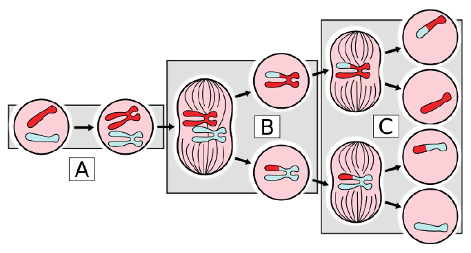 66 Ciências da Natureza Pró-Reitoria de Extensão – PROEX fi nal, uma célula diploide ou 2n (com dois lotes cromossômicos) produzirá quatro células haploides ou n (com um lote cromossômico único). Figura 45: Esquema com as principais etapas da meiose: A: duplicação do material genético; B: meiose I; C: meiose II. Observe que a meiose origina quatro células-fi lhas (que podem ser os gametas). Fonte:. Acesso em: 10 out. 2016. A meiose I é a etapa em que ocorre a redução do número de cromosso- mos, por isso é chamada de divisão reducional. É dividida em: prófase I, metáfase I, anáfase I e telófase I. Prófase I: é uma fase longa e bem mais complexa que a prófase da mi- tose. É subdividida em cinco subfases: leptóteno, zigóteno, paquíteno, diplóteno e diacinese. A prófase I é iniciada pela condensação dos cromossomos duplicados na interfase. Conforme os cromossomos homólogos duplicados vão se condensando (leptóteno), os mesmos vão se emparelhando ao longo de todo o comprimento (zi- góteno). O paquíteno é caracterizado pelo completo pareamento dos pares de homó- logos, sendo que estes se encontram espessos, uma vez que os fi lamentos estão muito condensados. É nessa fase que pode ocorrer o crossing-over (ou permutação). Este fenômeno gera grande variabilidade genética, pois existe troca de pedaços dos cro- mossomos, o que é muito importante para a espécie. No diplóteno, os cromossomos homólogos começam a se separar, no entanto, ainda, encontram-se unidos nos pon- tos das cromátides em que aconteceram as permutações. Esses pontos dão origem a fi guras em forma da letra X, denominadas quiasmas. A prófase I termina com a máxima condensação de cada cromossomo (ainda presos a seus homólogos pelos quiasmas) e o deslocamento deste em direção às extremidades do citoplasma. Na diacinese, ocorre a desintegração da carioteca, e os cromossomos iniciam o processo de ligação às fi bras do fuso.