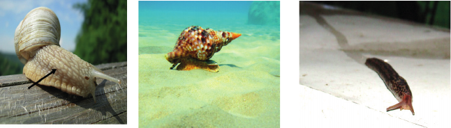 Biologia 191 Pró-Reitoria de Extensão – PROEX ganismos aderidos às superfícies (por meio da raspagem da rádula), de partículas alimentares em suspensão na água, e podem ser herbívoros, predadores, detritívoros e parasitas. A massa visceral acomoda parte dos sistemas circulatório, respiratório, digestório e reprodutivo. O manto (ou pálio), localizado dorsalmente no animal, é formado por dobras que delimitam a cavidade do manto (ou cavidade palial), onde estão os órgãos respiratórios do animal e as excretas dos metanefrídios. Uma concha pode ser secretada pelo manto sobre a massa visceral. A região cefalopediosa (cabeça e pé) inclui a cabeça e estruturas de locomoção (fi gura seguinte), representadas pelo pé muscular com formato de sola (que secreta um muco para facilitar o deslizamento do animal pelo substrato). Figura 129: (A) Molusco da espécie Helix pomatia, com destaque (seta) para a região cefalo- pediosa. (B) Molusco marinho. (C) Molusco deixando rastro de muco no trajeto percorrido Fonte://. Acesso em: 10 out. 2016. A maioria dos moluscos apresenta sistema circulatório aberto, embora em alguns trechos da rota passem por coração e vasos sanguíneos. Parte do trajeto realizado pelo líquido (denominado hemolinfa) ocorre no espaço interno do animal (fora dos vasos), a hemocele. As brânquias, denominadas ctenídios, realizam a res- piração. O líquido distribuído pelo corpo, após estar pobre em oxigênio, passa pelos ctenídios, de onde parte para o coração. Os caracóis (que são terrestres) são exceção: não respiram por brânquias, mas por pulmões formados na cavidade do manto. Em algumas lesmas, a respiração é cutânea. Polvo e lula possuem sistema circulatório fechado, ou seja, o sangue somente circula dentro de vasos sanguíneos. 192 Ciências da Natureza Pró-Reitoria de Extensão – PROEX Figura 130: Esquema da morfologia interna de um caracol, molusco terrestre hermafrodita, dotado de pulmão. Próximo ao oviducto localiza-se o “saco de dardo”, onde são produzidos os dardos (estiletes constituídos por quitina), que, ao serem inseridos no parceiro, têm a função de auxiliar a cópula. Há um poro respiratório, onde ocorrem as trocas gasosas com o meio. Fonte: . Acesso em: 10 out. 2016. Há três classes principais de moluscos: gastrópodes, bivalves e cefalópodes. • Gastrópodes: incluem caracóis, búzios, lesmas terrestres e marinhas e lebres- -do-mar. São moluscos que, quando possuem concha, se denominam uni- valves, ou seja, a concha é formada por uma única peça. Normalmente, são herbívoros e utilizam a rádula para retirar algas de substratos. Alguns podem ser carnívoros e outros, necrófagos. Há dois gastrópodes importantes para a saúde pública no Brasil: o caramujo africano Achatina fulica, que pode trans- mitir meningite a partir de vermes nematódeos que acometem a espécie, e o caramujo Biomphalaria glabrata, que transmite a esquistossomose. Figura 131: (A) Nembrotha kubaryana e (B) Glaucus atlanticus, duas espécies de lesma-do- -mar. (C) Búzio dotado de concha univalve, alimentando-se de uma estrela-do-mar Fonte: , ,. Acesso em: 10 out. 2016. • Bivalves: são moluscos que possuem duas peças (ou valvas) na constituição da concha. O grupo inclui os mexilhões, as ostras e os vôngoles. São fi ltradores e geram um fl uxo de água com partículas alimentares por movimentação das