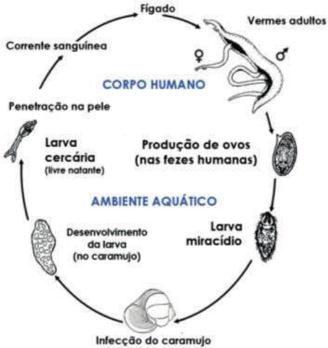 Biologia 183 Pró-Reitoria de Extensão – PROEX O diagnóstico é normalmente realizado por exame de fezes, e o tratamento se dá com a administração de remédios com substâncias tóxicas ao parasita. O sane- amento básico, o tratamento dos infectados e o controle da população de caramujos hospedeiros são as principais formas de prevenir a contaminação da doença. Figura 119: Esquema que representa o ciclo reprodutivo de Schistossoma mansoni. Os ovos produzidos no interior de um hospedeiro humano são eliminados com as fezes, que, em contato com águas de lagoas onde há caramujos, liberam a larva miracídio, que penetra no caramujo. Após uma fase de desenvolvimento, a larva é eliminada do caramujo na forma infectante, a larva cercária, que pode atravessar a pele e alcançar a corrente sanguínea. O parasita se aloja em veias do fígado e, quando maduros, migram para o intestino, onde pro- duzirão ovos por reprodução sexuada. Fonte: . Acesso em: 10 out. 2016. Teníase e cisticercose: ambas as doenças são causadas por solitárias do gênero Taenia. A Teníase pode ser causada tanto por Taenia solium quanto por Taenia saginata. A tênia parasita, além do homem, dois tipos de hospedeiro intermediários: o porco (T. solium) e o boi (T. saginata). Ela pode atingir alguns centímetros ou al- guns metros de comprimento no intestino humano. O corpo desse verme é formado por (a) escólex, uma estrutura que auxilia na fixação do parasita; (B) colo, uma seção não segmentada onde há rápida proliferação e crescimento; (c) e estróbilo: formado por anéis (segmentos) denominados proglótides, onde acontece a produção de ovos. 184 Ciências da Natureza Pró-Reitoria de Extensão – PROEX Figura 120: (A) Escólex de Taenia solium (microscopia). (B) Representação da estrutura cor- poral de Taenia saginata Fonte:,. Acesso em: 10 out. 2016. Teníase: uma pessoa contaminada elimina proglótides com ovos nas fezes, que, em um ambiente sem saneamento básico, podem contaminar águas e solos. Os animais que ingerem água ou alimentos com ovos do verme são invadidos por um estágio larval em células musculares. As larvas se alojam nos tecidos do animal e origi- nam o cisticerco, um cisto que contém a forma jovem da tênia. Se uma carne mal co- zida for ingerida por um humano, o cisto libera a tênia jovem, que, quando encontra o intestino, adere a ele com o escólex e passa a produzir ovos nas proglótides (que são hermafroditas). As proglótides são liberadas nas fezes, reiniciando o ciclo. Os sinto- mas da teníase incluem falta de apetite, diarreia, anemia, dor abdominal e fraqueza. As medidas profiláticas devem incluir a promoção de saneamento básico, a inspeção de carnes, a higiene com alimentos e o cozimento de carnes bovinas e suínas. Cisticercose: é uma doença grave, causada por ovos de T. solium. A cis- ticercose ocorre quando, acidentalmente, o ser humano ingere ovos da tênia, que estão em verduras mal lavadas ou na água (ao invés de ingerir a fase jovem); os teci- dos humanos são invadidos e neles se formam os cisticercos (que no ciclo anterior se formavam no porco). Normalmente, o cisticerco é formado nos olhos e no cérebro, o que torna a cisticercose uma doença perigosa em relação ao sistema nervoso, im- plicando risco de morte. Assim, a principal diferença da teníase para a cisticercose é a seguinte: na primeira, uma pessoa ingere cisticercos de carnes mal cozidas; na segunda, ela ingere os ovos (e não os cisticercos). Ou seja, na cisticercose, o cisticerco se forma no huma- no e não no hospedeiro intermediário (boi ou porco), como ocorre na teníase. 8.5.2.4 neMatódeos São vermes de corpo cilíndrico, que possuem sistema digestório comple- to (boca e ânus). Podem ser de vida livre (predadores ou saprófagos) ou parasitas,