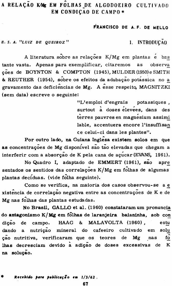 A RELAÇÃO K/Mg EM FÔLHAS DE ALGODOEIRO CULTIVADO EM CONDIÇÃO DE CAMPO * F R A N C I S C O D E A . F. D E M E L L O E. S. A. "LUIZ DE QUEIROZ " 1. INTRODUÇÃO A l i te ra tura s o b r e as r e l a ç õ e s K / M g e m plantas e ba_s tante vas ta . Apenas para e x e m p l i f i c a r , c i t a r e m o s as o b s e r v a ç ô e s de B O Y N T O N & C O M P T O N (1945) , M U L D E R (1950)e SMITH & R E U T H E R (1954) , s o b r e o s e fe i tos da adubaçao p o t a s s i c a no a g ravamen to das d e f i c i ê n c i a s de M g . A e s s e respei to , M A G N I T Z K I ( s e m data) e s c r e v e o seguinte : " L ' e m p l o i d ' eng ra i s po ta s s iques , surtout a d o s e s e l e v e e s , dans des t e r r e s pauvre s en m a g n e s i u m a s s i m i l ab le , a ccen tue r a e n c o r e l ' insuff isan c e c e l u i - c i dans l e s p lan tes" . P o r ou t ro l ado , na Guiana Inglesa e x i s t e m s o l o s e m que a s c o n c e n t r a ç õ e s de M g d i spon ive l sao tao e l evadas que c h e g a m a i n t e r f e r i r c o m a a b s o r ç ã o de K pe la cana de a ç ú c a r (EVANS, 1961) . No Quadro I, adaptado de E M M E R T (1961) , s ão apre sentados o s sen t idos das c o r r e l a ç õ e s K / M g e m folhas de a lgumas plantas d e c i d u a s . (v ide folha seguin te ) . C o m o se v e r i f i c a , na m a i o r i a dos c a s o s o b s e r v o u - s e a e x i s t enc ia de c o r r e l a ç ã o negativa entre as c o n c e n t r a ç õ e s de K e de M g nas fo lhas das plantas es tudadas . N o B r a s i l , G A L L O et a l . (1960) cons ta t a ram um pronuncia do an tagon i smo K / M g e m folhas de l a ran je i r a baianinha, s o b con d i ç ã o de c a m p o . HAAG & M A L A V O L T A (1960) , estu dando a nu t r ição m i n e r a l do c a f e e i r o cu l t ivado e m solu ç ã o nutri t iva, v e r i f i c a r a m que o s t e o r e s de M g nas fo lhas d e c r e s c i a m dev ido a a d i ç ã o de d o s e s e x c e s s i v a s de K na s o l u ç ã o . * Recebido para publicação em 1/3/62 C o m r e f e r e n d a ao a l g o d o e i r o nao e n c o n t r a m o s na l i t e r a tura nenhum t rabalho n e s s e sent ido , efetuado e m c o n d i ç ã o de c a m p o . E m vis ta d i s s o e cons ide rando a impor t ânc i a do c o n h e c i m e n to d e s s a r e l a ç ã o pa ra a d iagnose das d e f i c i ê n c i a s d e s s e s nutr ien t e s a p r e s e n t a m o s aqui o s r e su l t ados que o b t i v e m o s . * O sinal — significa correlação negativa: n significa qne não há correlação. 2. MATERIAL E MÉTODOS De um ensa io fa tor ia l NPK 3x3x3, c o m confundimento e c o m duas r e p e t i ç õ e s de t ra tamentos ( v e r adubaçao no Quadro I I ) , efetuado e m um s o l o a r e n o s o f o r a m co lh idas sepa radamente , no i n i c i o do f l o r e s c i m e n t o das plantas ( P R E V O T , 1953), fo lhas r e c é m maduras ( P R E V O T & O L L A G N I E R , 1956) l o c a l i z a d a s s o b r e r amos p rodu t ivos e s o b r e o c a u l e . Pa ra fac i l idade de e x p o s i ç ã o denomi n a m o s , a s p r i m e i r a s , fo lhas p rodu t ivas e as u l t imas fo lhas nao p rodu t ivas . O a l g o d o e i r o u t i l izado fo i o G o s s y p i u m h i r su tum L . , var. IAC 817 . O s l i m b o s das fo lhas f o r a m s e c o s e m estufa a 7 0 - 8 0 9 C e m o i d o s e m m i c r o mo inho W i l e y p r o v i d o de pene i r a de malha 30 . E m ex t ra tos n í t r i c o s p e r c l ó r i c o s d o s m a t e r i a i s ( T O T H et a l . , 1948) f o r a m d o s a d o s K, p e l o f o t o m e t r o de chama Beckman, m o delo B e magnésio conforme as r ecomendações de L O T T et a l . ( 1 9 5 6 ) . 3. RESULTADOS E DISCUSSÃO No Quadro III a p a r e c e m o s t e o r e s de K e de M g encont ra d o s na mater ia fceca das fo lhas , (v ide pagina segu in te ) . V e r i f i c a - s e que o s t e o r e s de K e de M g das fo lhas v a r i a m i n v e r s a m e n t e . O s c o e f i c i e n t e s de c o r r e l a ç ã o e n c o n t r a d o s f o r a m al tamente s ign i f i ca t ivos e nega t ivos c o m o se v e no Quadro IV, o que s u g e r e uma for te a ç ã o inibi do ra do p r i m e i r o s o b r e a a b s o r ç ã o do segundo , de v e z que nao f o r a m fei tas adubaçoes m a g n e s i a n a s . COEFICIENTES DE C O R R E L A Ç Ã O E N C O N T R A D O S E N T R E OS T E O R E S DE K E D E M g DA M A T E R I A SECA DAS F O L H A S . C o n f o r m e fo i pub l i cado e m out ro l o c a l ( M E L L O et a i , 1960) no ensa io de c a m p o de onde p r o v e i o o m a t e r i a l u t i l izado rto p r e sen t e t rabalho houve r e a ç ã o bastante f a v o r á v e l a adubação po t a s s i c a , se ja no que c o n c e r n e a o aumento de p r o d u ç ã o , se ja no que se r e f e r e * e l e v a ç ã o do t e o r do e l emen to nas fo lha s . C o m o a p rodução t e ó r i c a m a x i m a nas c o n d i ç õ e s e m que o ensa io foi r ea l i zado , s e r i a obtida c o m a a p l i c a ç ã o de 128, 05 kg de K^O p o r hec ta r e e p o s s i v e l que a a d i ç ã o de 150 kg p o r h e c t a r e tenha s ido a lgo e x c e s s i v a a ponto de p r e j u d i c a r a a b s o r ç ã o de M g p e l a s p lan tas . Dai o dec l ín io de p r o d u ç ã o , e m r e l a ç ã o a m a x i m a t e ó r i c a , obt ida c o m e s s e n íve l de adubação . O sinal *** indica significando ao nt'vel de l por 1.000 . T E O R E S DE K E D E M g NA M A T É R I A SECA DAS F O L H A S . 4. RESUMO E CONCLUSÕES Nes te t rabalho p r o c u r o u - s e es tudar a s r e l a ç õ e s entre o s t e o r e s de K e de M g e m do i s t ipos de fo lhas de a l g o d o e i r o re¬ c é m maduras p roven ien te s de u m ensa io fa tor ia l N P K 3 x 3 x 3 : a - F ô l h a s l o c a l i z a d a s s o b r e r a m o s p rodu t ivos (fô¬ lhas p rodu t ivas ) ; b - F ô l h a s na sc ida s d i re tamente do caule ( fôlhas não p rodu t ivas ) . V