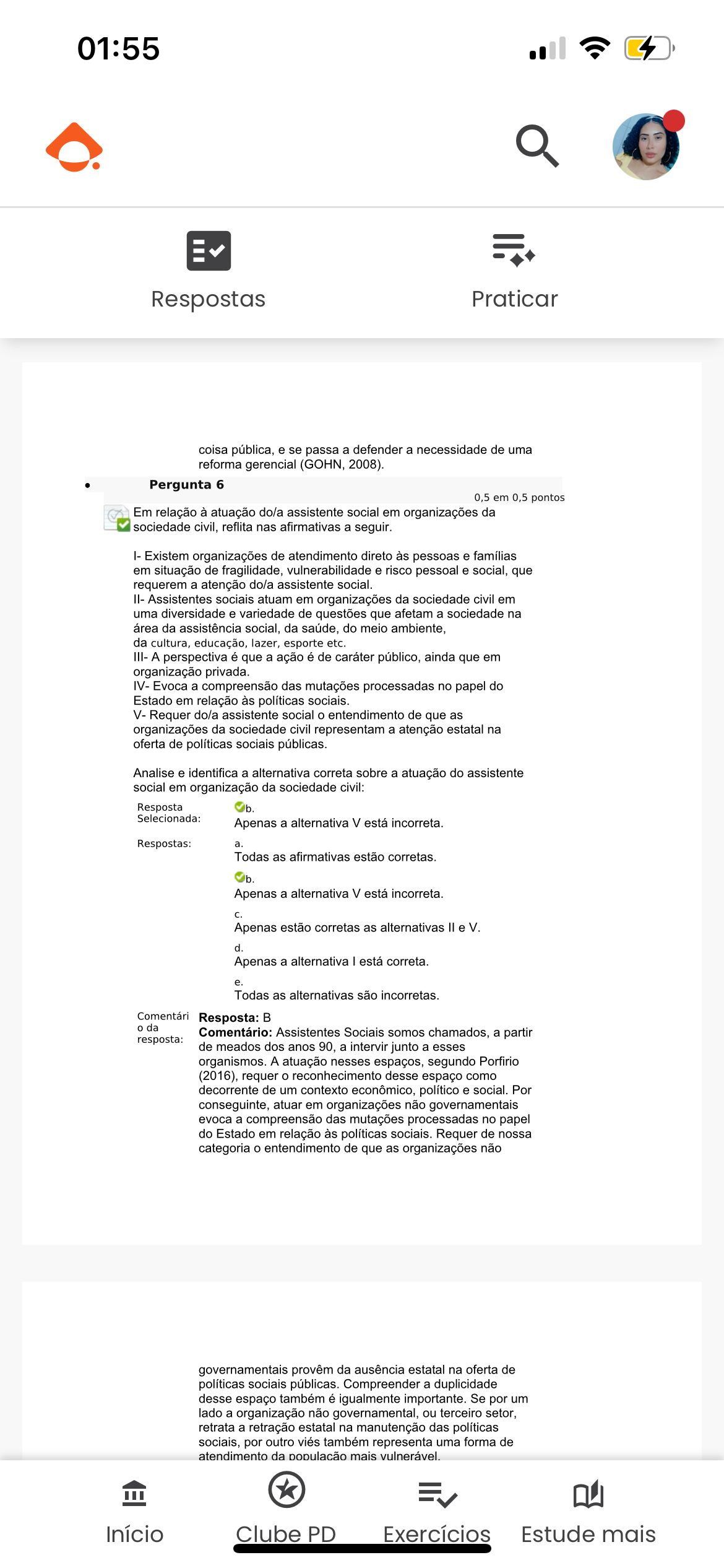 01:55 Respostas Praticar coisa pública, e se passa a defender a necessidade de uma reforma gerencial (GOHN, 2008). Pergunta 6 0,5 em 0,5 pontos Em relação à atuação do/a assistente social em organizações da sociedade civil, reflita nas afirmativas a seguir. I- Existem organizações de atendimento direto às pessoas e famílias em situação de fragilidade, vulnerabilidade e risco pessoal e social, que requerem a atenção do/a assistente social. II- Assistentes sociais atuam em organizações da sociedade civil em uma diversidade e variedade de questões que afetam a sociedade na área da assistência social, da saúde, do meio ambiente, da cultura, educação, lazer, esporte etc. III- A perspectiva é que a ação é de caráter público, ainda que em organização privada. IV- Evoca a compreensão das mutações processadas no papel do Estado em relação às políticas sociais. V- Requer do/a assistente social entendimento de que as organizações da sociedade civil representam a atenção estatal na oferta de políticas sociais públicas. Analise e identifica a alternativa correta sobre a atuação do assistente social em organização da sociedade civil: Resposta Selecionada: Apenas a alternativa V está incorreta. Respostas: a. Todas as afirmativas estão corretas. Apenas a alternativa V está incorreta. C. Apenas estão corretas as alternativas e V. d. Apenas a alternativa está correta. e. Todas as alternativas são incorretas. Comentári Resposta: da Comentário: Assistentes Sociais somos chamados, a partir resposta: de meados dos anos 90, a intervir junto a esses organismos. A atuação nesses espaços, segundo Porfirio (2016), requer reconhecimento desse espaço como decorrente de um contexto econômico, político e social. Por conseguinte, atuar em organizações não governamentais evoca a compreensão das mutações processadas no papel do Estado em relação às políticas sociais. Requer de nossa categoria entendimento de que as organizações não governamentais provêm da ausência estatal na oferta de políticas sociais públicas. Compreender a duplicidade desse espaço também é igualmente importante. Se por um lado a organização não governamental, ou terceiro setor, retrata a retração estatal na manutenção das políticas sociais, por outro viés também representa uma forma de atendimento da população mais vulnerável. Início Clube PD Exercícios Estude mais