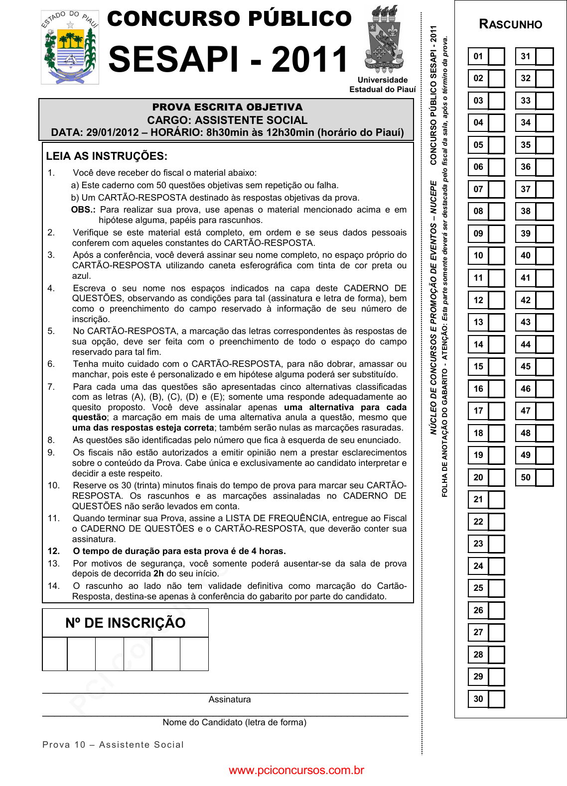 pcimarkpci MDAwMDowMDAwOjAwMDA6MDAwMDowMDAwOmZmZmY6OTU0ZTpiOWI2:U3VuLCAyMiBKdW4gMjAyNSAxNDoxODowOCAtMDMwMA== www.pciconcursos.com.br Prova 10 – Ass is tente Soc ia l 1 PROVA ESCRITA OBJETIVA CARGO: ASSISTENTE SOCIAL DATA: 29/01/2012 – HORÁRIO: 8h30min às 12h30min (ho rário do Piauí) LEIA AS INSTRUÇÕES: 1. Você deve receber do fiscal o material abaixo: a) Este caderno com 50 questões objetivas sem repetição ou falha. b) Um CARTÃO-RESPOSTA destinado às respostas objetivas da prova. OBS.: Para realizar sua prova, use apenas o material mencionado acima e em hipótese alguma, papéis para rascunhos. 2. Verifique se este material está completo, em ordem e se seus dados pessoais conferem com aqueles constantes do CARTÃO-RESPOSTA. 3. Após a conferência, você deverá assinar seu nome completo, no espaço próprio do CARTÃO-RESPOSTA utilizando caneta esferográfica com tinta de cor preta ou azul. 4. Escreva o seu nome nos espaços indicados na capa deste CADERNO DE QUESTÕES, observando as condições para tal (assinatura e letra de forma), bem como o preenchimento do campo reservado à informação de seu número de inscrição. 5. No CARTÃO-RESPOSTA, a marcação das letras correspondentes às respostas de sua opção, deve ser feita com o preenchimento de todo o espaço do campo reservado para tal fim. 6. Tenha muito cuidado com o CARTÃO-RESPOSTA, para não dobrar, amassar ou manchar, pois este é personalizado e em hipótese alguma poderá ser substituído. 7. Para cada uma das questões são apresentadas cinco alternativas classificadas com as letras (A), (B), (C), (D) e (E); somente uma responde adequadamente ao quesito proposto. Você deve assinalar apenas uma alternativa para cada questão ; a marcação em mais de uma alternativa anula a questão, mesmo que uma das respostas esteja correta ; também serão nulas as marcações rasuradas. 8. As questões são identificadas pelo número que fica à esquerda de seu enunciado. 9. Os fiscais não estão autorizados a emitir opinião nem a prestar esclarecimentos sobre o conteúdo da Prova. Cabe única e exclusivamente ao candidato interpretar e decidir a este respeito. 10. Reserve os 30 (trinta) minutos finais do tempo de prova para marcar seu CARTÃO- RESPOSTA. Os rascunhos e as marcações assinaladas no CADERNO DE QUESTÕES não serão levados em conta. 11. Quando terminar sua Prova, assine a LISTA DE FREQUÊNCIA, entregue ao Fiscal o CADERNO DE QUESTÕES e o CARTÃO-RESPOSTA, que deverão conter sua assinatura. 12. O tempo de duração para esta prova é de 4 horas . 13. Por motivos de segurança, você somente poderá ausentar-se da sala de prova depois de decorrida 2h do seu início. 14. O rascunho ao lado não tem validade definitiva como marcação do Cartão- Resposta, destina-se apenas à conferência do gabarito por parte do candidato. Nº DE INSCRIÇÃO ____________________________________________________________ Assinatura ____________________________________________________________ Nome do Candidato (letra de forma) Universidade Estadual do Piauí N Ú C LE O D E C O N C U R S O S E P R O M O Ç Ã O D E E V E N T O S – N U C E P E C O N C U R S O P Ú B LI C O S E S A P I - 2 01 1 F O LH A D E A N O T A Ç Ã O D O G A B A R IT O - A T E N Ç Ã O : E st a pa rt e so m en te d ev er á se r de st ac ad a pe lo fi sc al d a sa la , a pó s o té rm in o da p ro va . CONCURSO PÚBLICO SESAPI - 2011 RASCUNHO 01 31 02 32 03 33 04 34 05 35 06 36 07 37 08 38 09 39 10 40 11 41 12 42 13 43 14 44 15 45 16 46 17 47 18 48 19 49 20 50 21 22 23 24 25 26 27 28 29 30 www.pciconcursos.com.br pcimarkpci MDAwMDowMDAwOjAwMDA6MDAwMDowMDAwOmZmZmY6OTU0ZTpiOWI2:U3VuLCAyMiBKdW4gMjAyNSAxNDoxODowOCAtMDMwMA== www.pciconcursos.com.br Prova 10 – Ass is tente Soc ia l 2 N º D E I N S C R I Ç Ã O www.pciconcursos.com.br pcimarkpci MDAwMDowMDAwOjAwMDA6MDAwMDowMDAwOmZmZmY6OTU0ZTpiOWI2:U3VuLCAyMiBKdW4gMjAyNSAxNDoxODowOCAtMDMwMA== www.pciconcursos.com.br Prova 10 – Ass is tente Soc ia l 3 CONHECIMENTOS GERAIS Língua Portuguesa TEXTO 1 Algumas características do léxico do português brasileiro . (1) O português do Brasil tem um léxico de uso corrente de cerca de sessenta e cinco mil palavras. É claro que esse número se refere aos usuários do português brasileiro em seu conjunto. O vocabulário que cada falante domina passivamente (isto é, que ele sabe interpretar, se for o caso) é apenas uma parte do léxico da língua, e o vocabulário que cada um utiliza, ativamente, em seus próprios enunciados, é ainda mais reduzido do que esse vocabulário passivo. Os estudos de natureza estatística vêm mostrando, já há algum tempo, que há grande variação na frequência de uso de vários itens do vocabulário. (2) Analisado do ponto de vista histórico, o léxico do português brasileiro aparece como resultado de um longo processo, no qual muitas palavras antigas se perdem ou só sobrevivem com novas funções e novos valores, ao mesmo tempo em que novas palavras vão sendo constantemente criadas. Para entender melhor esse processo, podemos distinguir no léxico do português do Brasil quatro grandes conjuntos de palavras e expressões: a) as que remontam ao latim vulgar, como resultado de seu desenvolvimento fonético; b) os empréstimos recebidos das línguas com que o português teve contato; c) palavras eruditas, tiradas diretamente do latim e do grego clássicos; d) criações vernáculas, isto é, palavras criadas no interior da própria língua com base em palavras preexistentes. (...) (3) Detendo-nos no que se refere aos empréstimos, podemos lembrar que muitas palavras do português brasileiro que têm sua origem em línguas estrangeiras chegaram ao Brasil através do português europeu. Não poderia ter sido de outro modo, porque, durante todo o período colonial, os contatos do Brasil passavam obrigatoriamente por Portugal. Entrementes, na situação de multilinguismo que caracterizou o Brasil-Colônia, o portugu
