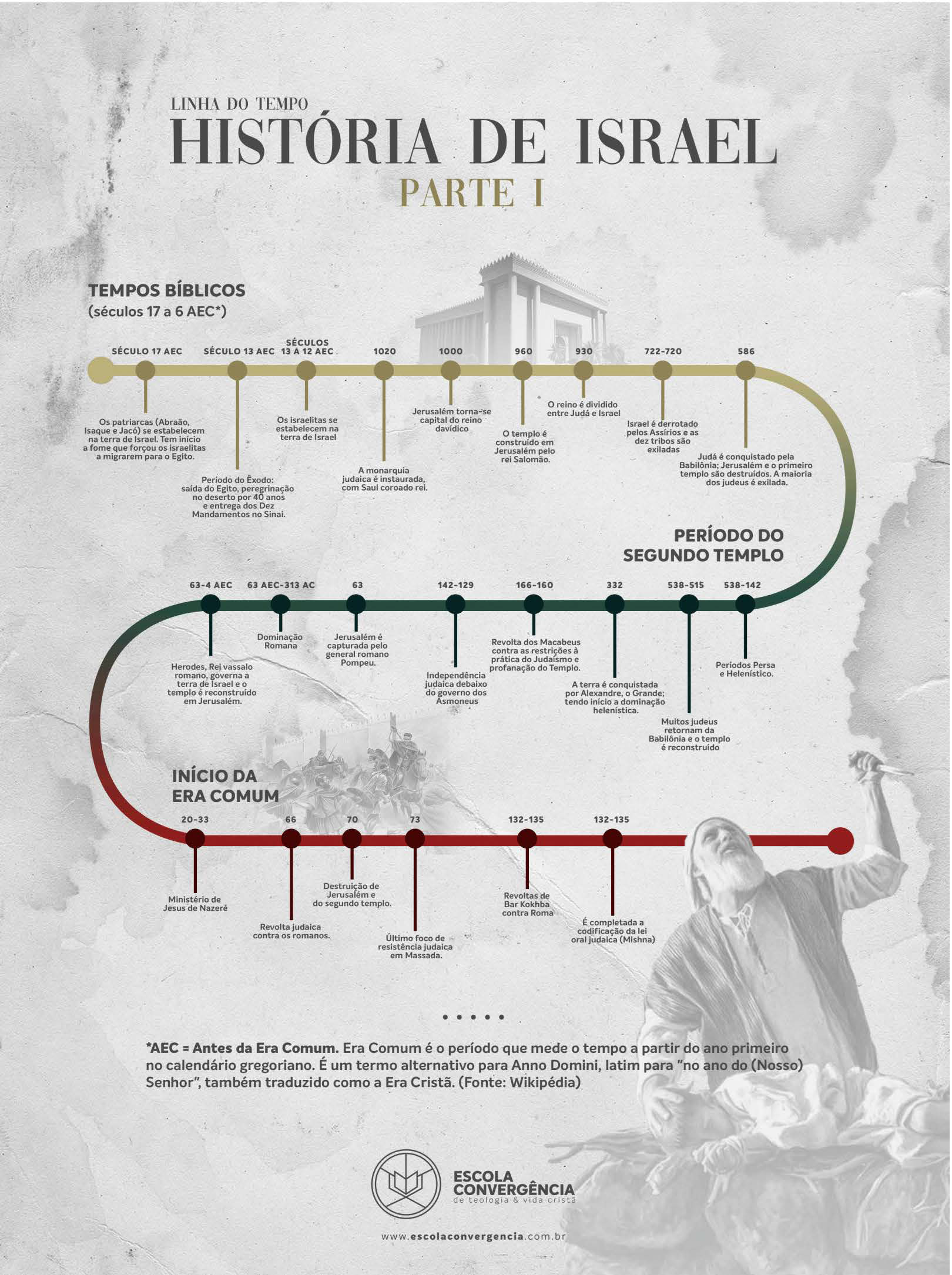 LINHA DO TEMPO HISTÓRIA DE ISRAEL PARTE I TEMPOS BÍBLICOS (séculos 17 a 6 AEC*) SÉCULOS SÉCULO 17 AEC SÉCULO 13 AEC 13 A 12 AEC 1020 1000 960 930 722-720 586 reino é dividido Jerusalém torna-se entre Judá e Israel Os patriarcas (Abraão, Os israelitas se capital do reino Israel é derrotado Isaque e Jacó) se estabelecem estabelecem na davídico na terra de Israel. Tem início terra de Israel templo é pelos Assírios e as construído em dez tribos são a fome que forçou os israelitas Jerusalém pelo exiladas a migrarem para Egito. rei Salomão. Judá é conquistado pela Babilônia; Jerusalém e primeiro A monarquia templo são destruídos. A maioria Período do Êxodo: judaica é instaurada, dos judeus é exilada. saída do Egito, peregrinação com Saul coroado rei. no deserto por 40 anos e entrega dos Dez Mandamentos no Sinai. PERÍODO DO SEGUNDO TEMPLO 63-4 AEC 63 AEC-313 AC 63 142-129 166-160 332 538-515 538-142 Dominação Jerusalém é Romana capturada pelo Revolta dos Macabeus general romano contra as restrições à Pompeu. prática do Judaismo e Herodes, Rei vassalo profanação do Templo. Persa romano, governa a Independência e Helenístico. terra de Israel e judaica debaixo A terra é conquistada templo é do governo dos por Alexandre, em Jerusalém. Asmoneus tendo a dominação helenística. Muitos judeus retornam da Babilônia e O templo é reconstruído INÍCIO DA ERA COMUM 20-33 66 70 73 132-135 132-135 Destruição de Jerusalém e Ministério de Revoltas de Jesus de Nazeré do segundo templo. Bar Kokhba contra Roma É completada a Revolta judaica codificação da lei contra os romanos. Último foco de oral judaica (Mishna) resistência judaica em Massada. *AEC = Antes da Era Comum. Era Comum é o período que mede o tempo a partir do ano primeiro no calendário gregoriano. É um termo alternativo para Anno Domini, latim para "no ano do (Nosso) Senhor", também traduzido como a Era Cristã. (Fonte: Wikipédia) ESCOLA CONVERGÊNCIA de teologia & vida www.escolaconvergencia.com.br