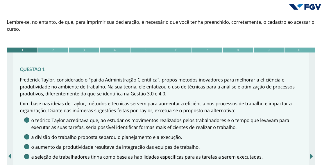 FGV Lembre-se, no entanto, de que, para imprimir sua declaração, é necessário que você tenha preenchido, corretamente, cadastro ao acessar curso. 1 2 3 4 5 6 7 8 9 10 QUESTÃO 1 Frederick Taylor, considerado da Administração Científica", propôs métodos inovadores para melhorar a eficiência e produtividade no ambiente de trabalho. Na sua teoria, ele enfatizou uso de técnicas para a análise e otimização de processos produtivos, diferentemente do que se identifica na Gestão 3.0 e 4.0. Com base nas ideias de Taylor, métodos e técnicas servem para aumentar a eficiência nos processos de trabalho e impactar a organização. Diante das inúmeras sugestões feitas por Taylor, excetua-se proposto na alternativa: O teórico Taylor acreditava que, ao estudar os movimentos realizados pelos trabalhadores e O tempo que levavam para executar as suas tarefas, seria possível identificar formas mais eficientes de realizar trabalho. a divisão do trabalho proposta separou planejamento e a execução. aumento da produtividade resultava da integração das equipes de trabalho. a seleção de trabalhadores tinha como base as habilidades específicas para as tarefas a serem executadas.