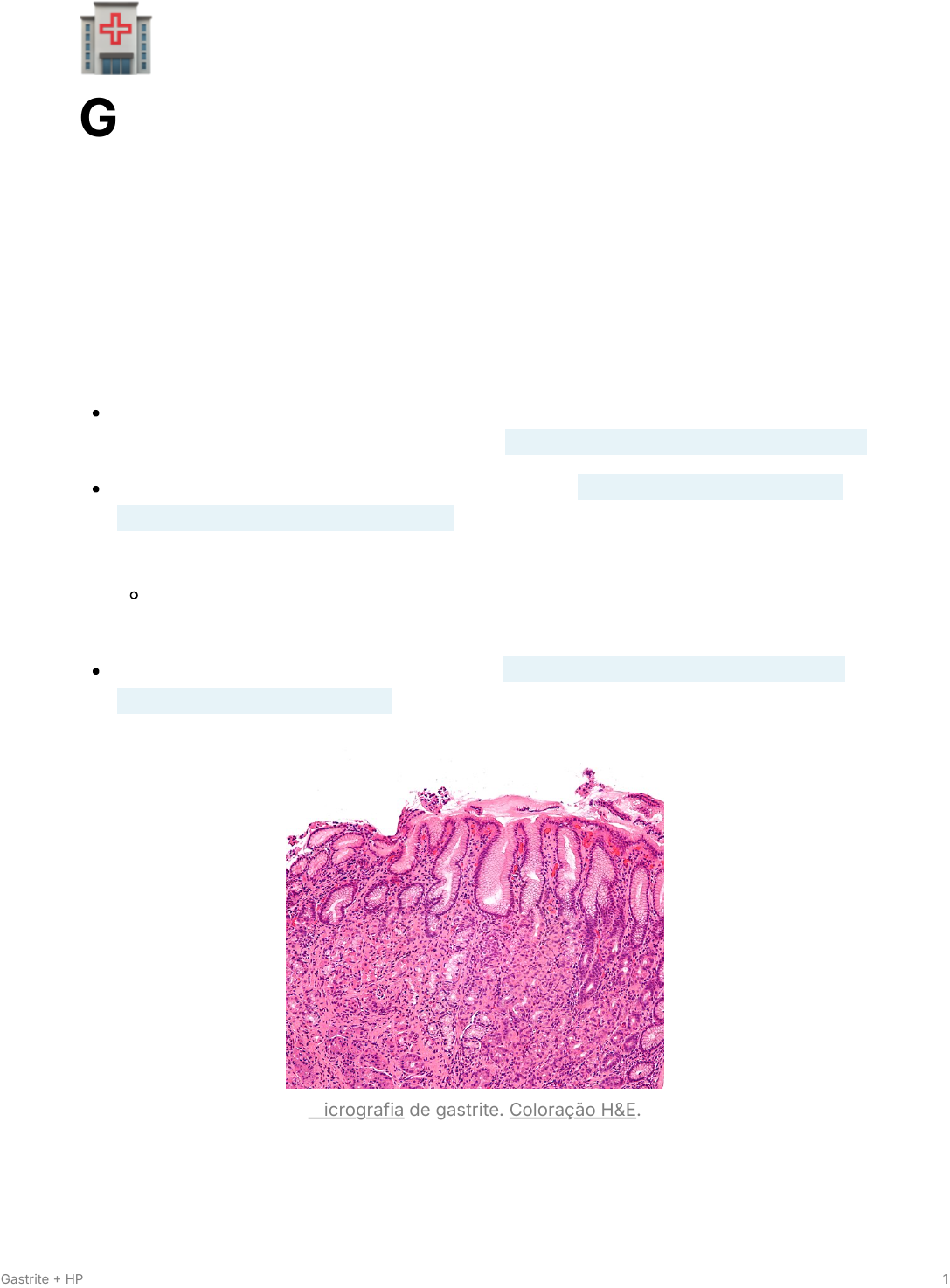 🏥 Gastrite + HP Morgana R. Duarte- TXI 1) Introdução Termo "gastrite": usado de forma ambígua e confusa por diferentes profissionais e leigos. Leigos e alguns clínicos: utilizam "gastriteˮpara descrever sintomas inespecíficos, hoje classificados como dispepsia funcional ou não ulcerosa. Endoscopistas: usam o termo para descrever alterações macroscópicas (hiperemia, enantema da mucosa), que não necessariamente indicam inflamação verdadeira. Alterações que podem ser causadas por hemorragia subepitelial, dilatação capilar e depleção de mucina. Patologistas: definem gastrite como a presença de inflamação aguda ou crônica da mucosa gástrica, observada ao exame histológico. Micrografia de gastrite. Coloração H&E. Gastrite HP 1 https://pt.wikipedia.org/wiki/Micrografia https://pt.wikipedia.org/wiki/Colora%C3%A7%C3%A3o_H%26E 💡 Contraste importante: mucosa aparentemente normal na endoscopia pode, ao exame histológico, apresentar inflamação extensa. 2) Classificação Gastrite HP 2 A) Gastrites agudas 1- Gastrite aguda por Helicobacter pylori Transmissão e patogênese: transmitido por via oral → a bactéria penetra o muco gástrico e entra em contato íntimo com as células epiteliais. Efeitos no epitélio: depleção de mucina, esfoliação celular e alterações regenerativas sinciciais. Resposta inflamatória inicial H. pylori libera agentes quimiotáticos que penetram o epitélio lesado e induzem a migração de polimorfonucleares para a lâmina própria. Ativação de mastócitos → desgranulação → liberação de substâncias que aumentam a permeabilidade vascular, expressão de moléculas de adesão nos endotélios e favorecem a migração de leucócitos. Gastrite HP 3 Mediadores imunes envolvidos: estímulo da produção de interleucina-8 IL8 pelo epitélio gástrico → potencializada por TNF-a e IL1. Estímulo imune é capaz de eliminar a infecção, exceto em algumas crianças. Evolução da infecção A fase aguda é curta 3 a 4 semanas): aumento progressivo de células inflamatórias crônicas, transição de gastrite aguda neutrofílica para gastrite ativa crônica. A primoinfecção geralmente é assintomática → quando sintomática 37 dias de incubação). Manifestações clínicas 1 a 2 semanas): dor ou mal-estar epigástrico, pirose, náuseas e vômitos, flatulência, sialorreia, halitose, cefaleia, astenia. Achados endocópicos: extremamente variáveis, desde enantema leve até erosões, úlceras ou lesões pseudotumorais. Na maioria dos casos, lesões se concentram no antro, podendo atingir o corpo gástrico. Diagnóstico laboratorial Histologia, teste respiratório com carbono-12 ou carbono-14, cultura, teste rápido da urease e sorologia (pode dar falso-negativo em infecção recente). Gastrite HP 4 Tratamento Realizado com esquemas usuais de erradicação. A hipocloridria pode facilitar a resposta ao tratamento. Às vezes, são necessários vários ciclos de tratamento. Se não tratada, a infecção persistente indefinidamente e leva à gastrite crônica histológica. 2- Gastrite flegmonosa aguda ou supurativa Definição e características gerais: entidade rara, podendo ocorrer inclusive em pacientes pediátricos. Caracteriza-se por: infecção bacteriana da muscularis mucosa e submucosa do estômago, com infiltração de células plasmáticas, linfócitos e polimorfonucleares. Gastrite HP 5 Mucosa gástrica geralmente pouco acometida. Inflamação costuma não ultrapassar o cárdia e o piloro. Etiologia e condições associadas Frequentemente complicação de doenças sistêmicas ou septicemia. Associada a: empiema, meningite e endocardite pneumocócica. Quando causada por germes formadores de gás, denomina-se gastrite enfisematosa. Fatores predisponentes: cirurgia gástrica prévia, hipocloridria, câncer gástrico, úlcera gástrica e gastrite pré-existente. Agentes infecciosos comuns: principalmente GRAM Streptococcus spp. Outros agentes relatados Pneumococcus spp., Staphylococcus spp., Proteus vulgaris, E. coli e Clostridium welchii (associado à formação de gás). Quadro clínico Evolução rápida. Sintomas frequentes: dor epigástrica intensa, náuseas, vômitos purulentos. Em alguns casos: sinais de irritação peritoneal. Leucocitose com desvio à esquerda é quase sempre presente. Amilase sérica geralmente normal. Diagnóstico Radiografia simples de abdome: pode mostrar gás na submucosa gástrica (sugere infecção por Clostridium welchii). Estudo contrastado do estômago: espessamento das pregas gástricas e redução da distensibilidade antral. Biópsia convencional: muitas vezes não é suficiente (mucosa poupada) → necessário material da submucosa gástrica. Diagnóstico frequentemente feito por: laparotomia exploradora ou autópsia (em casos fatais). Tratamento e prognóstico Gastrite HP 6 Inclui ATB de amplo espectro, drenagem cirúrgica ou endoscópica da parede gástrica. Em casos graves: pode ser necessária cirurgia de ressecção gástrica. Prognóstico: altamente letal, mortalidade geral de 67%. 3- Gastrite aguda hemorrágica/ erosiva aguda Também chamada de Lesão Aguda da Mucosa Gastroduodenal LAMGD. Conhecida como úlcera de estresse. Ocorre nas primeiras horas após grandes traumas ou doenças sistêmicas graves. Regiões mais afetadas: estômago proximal (mais comum) e eventualmente o antro gástrico, duodeno e esôfago distal. Características Características histológicas: lesões hemorrágicas puntiformes, alterações da superfície epitelial e edema da mucosa. Complicações clínicas: hemorragia digestiva alta, perda aguda de sangue (embora poucos apresentem instabilidade hemodinâmica). Pacientes críticos UTI estão em alto risco. Patogenia: mecanismos exatos não são totalmente compreendidos, provavelmente relacionados a alterações nos mecanismos de defesa da mucosa gastroduodenal. Dados epidemiológicos e endoscópicos Endoscopias até 72h após: traumatismo cranioencefálico ou