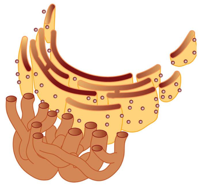 Retículo endoplasmático O retículo endoplasmático é um dos órgãos celulares dos eucariotos, e é um sistema de membrana reticulada ou em forma de placa circundada por uma única membrana biológica. Ele está conectado à membrana externa da membrana nuclear. Sua existência foi claramente reconhecida pela observação com um microscópio eletrônico. Estrutura Ele é um tubo de filme inflado e na membrana nuclear a cisterna forma uma (estrutura em forma de grande saco das vesículas do que) formas de citoesqueleto, o tecido é (citoesqueleto) reticulado. A membrana forma um espaço vazio separado do citoplasma, formando o lúmen de Sisterna. Parte do retículo endoplasmático está conectado à membrana externa da membrana nuclear, de modo que a irmã ou lúmen do retículo endoplasmático é conectado ao espaço entre as camadas interna e externa da membrana nuclear. Figura 1: Retículo endoplasmático Parte dos ribossomos do retículo endoplasmático são cobertos com, (ribossomos ao longo das direções dos aminoácidos nucleares reunidos em proteína serão sintetizados.) Quando o microscópio eletrônico chamado, porque a superfície áspera parece superfície áspera coberta com ribossomos ER ER. A parte sem ribossomos, ao contrário, parece lisa e é chamada de vesícula lisa. Os ribossomos na vesícula rugosa movem a proteína recém-sintetizada para a próxima etapa, o retículo endoplasmático. Essa proteína é então transportada para o aparelho de Golgi. Vesículas ásperas e vesículas lisas diferem não apenas na forma, mas também na função. Vesícula bruto (ou vesícula áspero) Ela sintetiza e transporta proteínas para serem usadas nas membranas celulares, organelas e proteínas para serem secretadas para fora das células. A tradução do mRNA para a proteína é feita por ribossomos presos à vesícula rugosa. Pouco depois de a proteína ser sintetizada, a maior parte dela passa pelas vesículas para o aparelho de Golgi. O retículo endoplasmático rugoso coopera com o aparelho de Golgi para direcionar a proteína para que ela possa entrar no lugar. Vesículas superfície lisa (ou vesículas) de superfície lisa Ela executa várias funções metabólicas, dependendo do tipo de célula. Ele está envolvido na síntese de vários lipídios, incluindo fosfolipídios em membranas celulares, ácidos gordos, e esteroides, tais como hormônios, e também desempenha um papel importante no metabolismo de hidratos de carbono, desintoxicação de citotoxicidade, e de cálcio de armazenamento. As vesículas lisas são bem desenvolvidas em células que produzem hormônios esteroides, células do fígado que realizam desintoxicação e células musculares (repositório de íons de cálcio como substâncias de sinalização). Também é responsável por transportar moléculas de nutrientes dentro da célula. / Como as vesículas lisas têm uma grande área de superfície, elas podem promover o armazenamento e a função de enzimas importantes e seus produtos. Vesícula muscular As vesículas musculares existem no músculo estriado transverso (rabdomiose) entre as células musculares e são especializadas no armazenamento e liberação de íons de cálcio durante a contração muscular. O processo de liberação é obtido por um canal de cálcio controlado por voltagem, e o armazenamento é obtido pela Ca ATPase bombeada para as vesículas mioplasmáticas. Nos músculos filamentosos, as vesículas musculares circundam as miofibrilas. Funções O retículo endoplasmático desempenha uma série de funções, incluindo a promoção do processamento de proteínas e o transporte do saco de armazenamento da proteína resultante chamada Sisterna. A formação da estrutura 2,3-dimensional da proteína na estrutura primária da proteína dissulfeto topoisomerase recentemente produzida (PDI , Proteína dissulfeto isomerase), grupo Hsc70 , anexina de faca , Calle chá kyulrin ou família de peptidilpropil isomerase realizada pela proteína do retículo endoplasmático, como . Apenas proteínas formadas corretamente podem ser transportadas da vesícula para o aparelho de Golgi. Transporte de proteínas As proteínas secretadas viajam através da membrana do retículo endoplasmático. As proteínas transportadas do retículo endoplasmático para várias células são marcadas com um endereço de destino denominado rótulo de proteína. Vários aminoácidos na cadeia polipeptídica N-terminal servem para indicar o endereço de destino e são removidos na chegada ao destino. As proteínas a serem transportadas para fora do retículo endoplasmático são embaladas na vesícula e viajam ao longo do citoesqueleto até seu destino. Outras características Inserção de proteínas na membrana do retículo endoplasmático - Como a proteína intrínseca deve ser inserida na membrana do retículo endoplasmático após a síntese, é necessária uma sequência topogênica correta (uma sequência de algumas proteínas indicando o destino da proteína dentro do retículo endoplasmático). A formação e o rearranjo de ligações dissulfeto estabilizam as estruturas terciária e quaternária das proteínas. Armazenamento de cálcio: A vesícula lisa é usada principalmente como um local para armazenar / liberar íons de cálcio no espaço intercelular. A função de armazenamento de cálcio das vesículas lisas é essencial para manter os músculos transversos estriados (rabdomios) contraídos. Bibliografia: https://edisciplinas.usp.br/mod/book/view.php?id=2433755&chapterid=19637 acesso em 27 de setembro de 2020. https://edisciplinas.usp.br/mod/book/view.php?id=2433755&chapterid=19637 Reforçando o aprendizado Retículo endoplasmático O retículo endoplasmático é um dos órgãos celulares dos eucariotos, e é um sistema de membrana reticulada ou em forma de placa circundada por uma única membrana biológica. Ele está conectado à membrana externa da membrana nuclear. Sua existência foi clarame