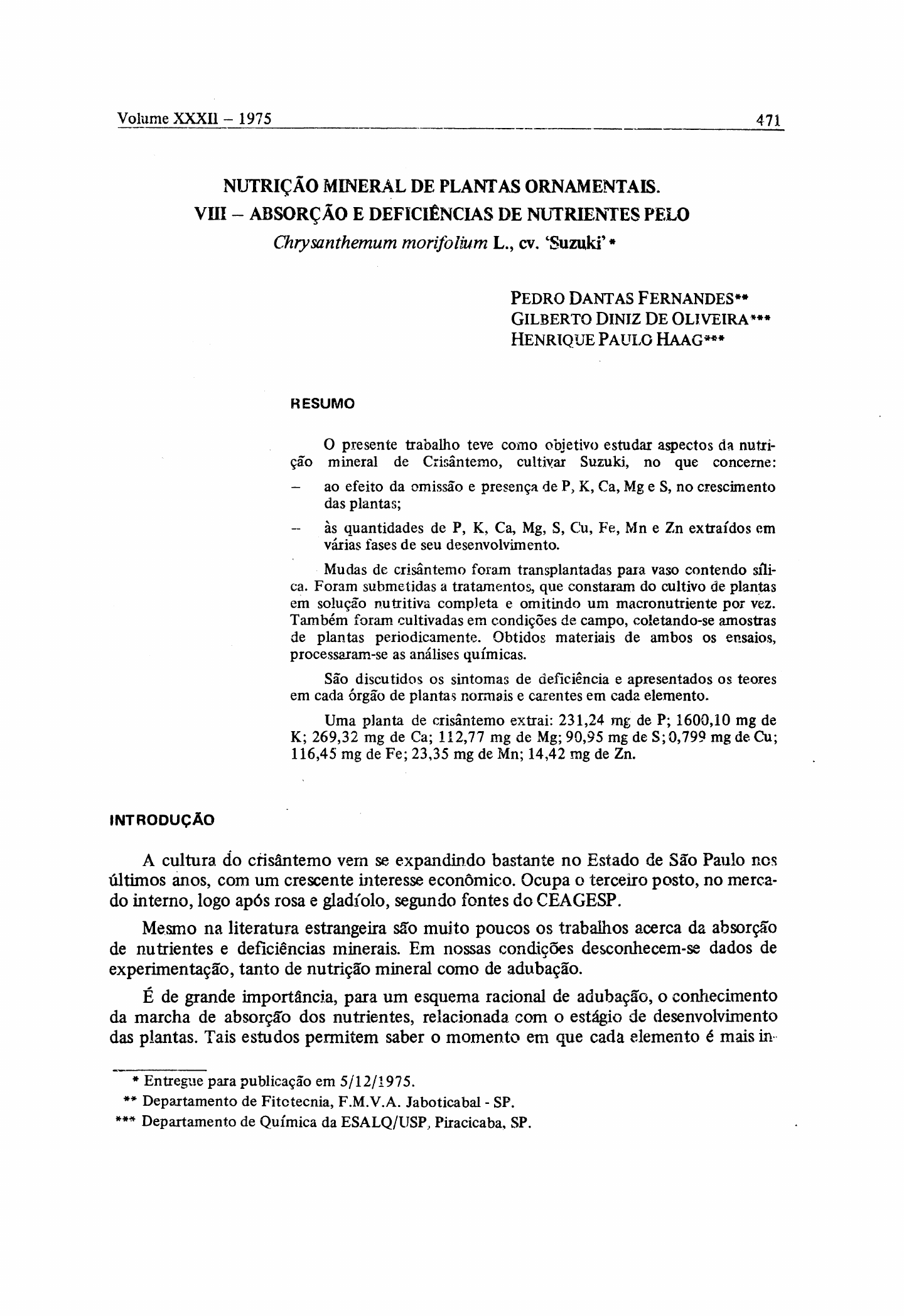 N U T R I Ç Ã O M I N E R A L D E P L A N T A S O R N A M E N T A I S . V I I - A B S O R Ç Ã O Ε D E F I C I Ê N C I A S D E N U T R I E N T E S P E L O Chrysanthemum morifolium L . , cv, 'Suzuki' * P E D R O D A N T A S F E R N A N D E S * * G I L B E R T O D I N I Z D E O L I V E I R A * * * H E N R I Q U E P A U L O H A A G * * * RESUMO O presente trabalho teve como objetivo estudar aspectos da nutri ção mineral de Crisântemo, cultivar Suzuki, no que concerne: - ao efeito da omissão e presença de Ρ, K, Ca, Mg e S, no crescimento das plantas; às quantidades de Ρ, K, Ca, Mg, S, Cu, Fe, Mn e Zn extraídos em várias fases de seu desenvolvimento. Mudas de crisântemo foram transplantadas para vaso contendo síli ca. Foram submetidas a tratamentos, que constaram do cultivo de plantas em solução nutritiva completa e omitindo um macronutriente por vez. Também foram cultivadas em condições de campo, coletando-se amostras de plantas periodicamente. Obtidos materiais de ambos os ensaios, processaram-se as análises químicas. São discutidos os sintomas de deficiência e apresentados os teores em cada órgão de plantas normais e carentes em cada elemento. Uma planta de crisântemo extrai: 231,24 mg de P; 1600,10 mg de K; 269,32 mg de Ca; 112,77 mg de Mg; 90,95 mg de S; 0,799 mg de Cu; 116,45 mg de Fe; 23,35 mg de Mn; 14,42 mg de Zn. INTRODUÇÃO A cultura do crisântemo vem se expandindo bastante no Estado de Sâo Paulo nos últimos anos, com um crescente interesse econômico. Ocupa o terceiro posto, no merca do interno, logo após rosa e gladiolo, segundo fontes do CEAGESP. Mesmo na literatura estrangeira são muito poucos os trabalhos acerca da absorção de nutrientes e deficiências minerais. Em nossas condições desconhecem-se dados de experimentação, tanto de nutrição mineral como de adubação. É de grande importância, para um esquema racional de adubação, o conhecimento da marcha de absorção dos nutrientes, relacionada com o estágio de desenvolvimento das plantas. Tais estudos permitem saber o momento em que cada elemento é mais in * Entregue para publicação em 5/12/1975. ** Departamento de Fitctecnia, F.M.V.A. Jaboticabal - SP. *** Departamento de Química da ESALQ/USP, Piracicaba, SP. tensamente absorvido, dando uma indicação sobre a época mais indicada para seu forne cimento. Também, de capital interesse, são os estudos de carências minerais, permitindo a a- valiação do estado nutricional da cultura, que, pelo sistema de cultivo e colheita, é mui to sujeita a desarranjos nutricionais. Os objetivos deste trabalho, através de estudos em condições de campo e em casa- -de-vegetaçâo, foram: a — verificar o efeito da omissão e presença dos macronutrientes, no crescimento do cri- sântemo; b — avaliar as quantidades de macronutrientes e de alguns micronutrientes extraídos, nas diversas fases de desenvolvimento da cultura; c — obter um quadro sintomatológico das deficiências dos macronutrientes; d — verificar o efeito da omissão de cada nutriente, sobre seu teor, em várias partes da planta. REVISÃO DE L I T E R A T U R A Não foram encontradas na literatura disponível, referências a estudos de marcha de absorção de nutrientes para a cultura de crisântemo. HEENEY et al. (1960), cultivando a variedade "Shasta" em casa-de-vegetação, ve rificaram que para boas produções, os teores de nitrogênio e potássio nas folhas devem estar numa relação de 1:2, respectivamente. JOINER e SMITH (1962) testando diferentes níveis de nitrogênio e de potássio, en contraram, nas plantas mais produtivas, teores de 4—5% para Ν e 5—6% de Κ. A varieda de com que trabalharam foi "Bluechip". Teores também diferentes foram encontrados por WATERS (1965), relacionados com altas produções de crisântemo; nas folhas, nitrogênio estava entre 3,5 e 4,5% e potássio entre 3,5—6,0%, enquanto que nas flores os níveis eram 1,5% de Ν e 2,5% de K. Sintomas associados à deficiência de nitrogênio, foram descritos por HILL et al. (1934), MESSING e OWEN (1954) e por LUNT et al. (1963). Em geral suas descrições são concordantes entre si e em resumo consistem em: de início, uma leve clorose das fo lhas mais velhas e redução em tamanho das mais novas; logo que as folhas novas se de senvolvem, elas assumem uma posição ereta e adquirem uma tonalidade pálida; as fo lhas mais velhas ficam amarelas, com pigmentos vermelhos nas margens, e na fase aguda caem prematuramente; a redução do crescimento ocorre muito cedo e este é o primeiro sinal da deficiência; não ocorre desenvolvimento de gemas laterais; a abertura das flores é atrasada por 3 a 5 semanas e o seu diâmetro se reduz à metade das flores de uma planta normal; as pétalas mostram-se normais. A deficiência de fósforo foi estudada por HILL et al. (1934), MESSING e OWEN (1954), LUNT et al. (1963) e por WATERS (1964), e os sintomas podem ser resumidos no seguinte: redução da taxa de crescimento e menor tamanho de folhas novas que fi cam formando um ângulo agudo em relação ao eixo principal da planta, os internódios não são encurtados e os tecidos ficam fracos; em geral não há perda de coloração e, num estágio seguinte, toda a planta adquire uma coloração verde pálida; posteriormente o- corre amarelecimento, bronzeamento e secagem das folhas velhas; pigmentos vermelho- -apurpurado aparecem em algumas variedades; há retardamento de abertura dos botões florais e redução no tamanho das inflorescências, sem ocorrer efeitos sobre a textura das pétalas. Os sintomas de carência de potássio foram descritos por HILL et al. (1934), MES SING e OWEN (1954) e por LUNT et al. (1963). Os sintomas diferem bastante de uma estação para outra e de variedade para variedade. A idade da planta, no momento em que surge a deficiência é provavelmente o fator que mais afeta o aparecimento dos sin tomas e as condições gerais de toda a planta. Os primeiros sintomas surgem nas