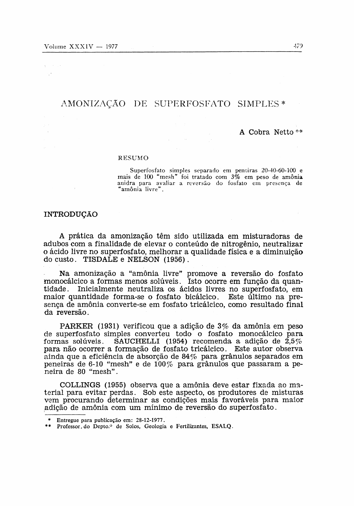 AMONIZAÇÃO DE SUPERFOSFATO SIMPLES* A Cobra Netto** RESUMO Superfosfato simples separado em peneiras 20-40-60-100 e mais de 100 "mesh" foi tratado com 3% em peso de amônia anidra para avaliar a reversão do fosfato em presença de "amônia livre". INTRODUÇÃO A prática da amonização têm sido utilizada em misturadoras de adubos com a finalidade de elevar o conteúdo de nitrogênio, neutralizar o ácido livre no superfosfato, melhorar a qualidade física e a diminuição do custo. TISDALE e NELSON (1956) . Na amonização a "amônia livre" promove a reversão do fosfato monocálcico a formas menos solúveis. Isto ocorre em função da quan tidade. Inicialmente neutraliza os ácidos livres no superfosfato, em maior quantidade forma-se o fosfato bicálcico. Este último na pre sença de amônia converte-se em fosfato tricálcico, como resultado final da reversão. PARKER (1931) verificou que a adição de 3% da amônia em peso de superfosfato simples converteu todo o fosfato monocálcico para formas solúveis. SAUCHELLI (1954) recomenda a adição de 2,5% para não ocorrer a formação de fosfato tricálcico. Este autor observa ainda que a eficiência de absorção de 84% para grânulos separados em peneiras de 6-10 "mesh" e de 100% para grânulos que passaram a pe neira de 80 "mesh". COLLINGS (1955) observa que a amônia deve estar fixada ao ma terial para evitar perdas. Sob este aspecto, os produtores de misturas vem procurando determinar as condições mais favoráveis para maior adição de amônia com um mínimo de reversão do superfosfato. * Entregue para publicação em: 28-12-1977. ** Professor, do Depto.° de Solos, Geologia e Fertilizantes, ESALQ. Neste ensaio, supeffosfato simples foi fracionado em peneiras e tratado com amônia anidra para verificar a diminuição da fração so lúvel em água. MATERIAL Ε MÉTODO Súperfosfato simples encontrado no comércio foi colocado em um conjunto de peneiras U.S. Standart de 20, 40, 60 e 100 "mesh". As frações obtidas foram transferidas para frasco hermético, dos quais re tirou-se amostras, para a determinação de umidade a 100°C e o teor de fósforo solúvel em água. As características das frações encontram-se no Quadro 1. A amônia anidra necessária para o tratamento foi dosada com au xílio de uma proveta de aço, especialmente construída para esta fina lidade. As frações granulométricas foram tratadas na proporção de 3% em peso de amônia para o superfosfato com a umidade original. A mistura foi procedida em cilindro de aço, com tampa para fechamento hermético, para carga e descarga do material e na outra extremidade uma conexão para adaptar a proveta com quantidade conhecida de amônia anidra. O conjunto estava colocado sobre rolos motores, a exemplo de um misturador de adubos, com rotação de 30-40 RPM, durante 10 minutos, após o início da amonização. O material tratado foi transferido para frascos fechados hermeticamente e de onde foram retiradas amostras para dosagem do fósforo solúvel em água conforme a técnica descrita em A.O.A.C. (1970). RESULTADOS Ε DISCUSSÃO No quadro 2 estão representadas as médias do material fracionado, os teores de fósforo solúvel em água antes e depois do tratamento com amônia anidra, as quantidade de nitrogênio adicionado por unidade de P 2 0 5 do material, o teor de amônia recuperada no produto e a porcen tagem de reversão. A quantidade de 3% de arnônia anidra adicionada por 100 gramas de superfosfato simples promoveu a diminuição no teor de fósforo so lúvel em água. A adição desta quantidade de "arnônia livre", segundo PARKER (1931), ocaciona a transformação do fosfato monocálcico em fosfatos monoamônico, bicálcieo, tricálcico e sulfato de amônio. Em relação ao conteúdo original as quantidades de fosfatos bi e tricálcico elevaram-se de 2,5 a 8 vezes, respectivamente. PARKER (1931), SAUCHELLI (1954) mostram que doses de até 2% de arnônia aumenta o teor de fosfato bicálcieo e diminui para doses maiores, porém, eleva a quantidade de fosfato tricálcico. A diminuição do teor do fósforo solúvel em água na fração retida em peneira de 100 e a que ultrapassou pode ser atribuída a presença de resíduo que resistiu a ação do ácido sulfúrico no processo de fabri cação . O cálculo da quantidade de arnônia por unidade de P 2O s mostra que houve uma variação de 2,67 a 3,82 de modo a elevar a reversão. Assim sendo, procedeu-se análise de correlação e regressão entre o teor existente de fósforo nas frações e as quantidades de arnônia adicionada por unidade de P 2 0 5 solúvel em água. Dentro destes limites foi obtido um coeficiente de correlação (r = -0,96) com uma proporcionalidade para Y = 24,344-4,732 χ de modo a indicar uma diminuição estequio- métrica na solubilidade do superfosfato e a "arnônia livre" adicionada. A quantidade de arnônia recuperada mostrou-se satisfatória con siderando-se o processo utilizado no ensaio e de modo a indicar a efi ciência da absorção da arnônia anidra pelo superfosfato simples. CONCLUSÕES a) As quantidades de 2,7 e 3,8% de amônia anidra adicionada provocou uma diminuição no teor solúvel de 44,6 a 57,9%. b) A amonização produziu uma reversão proporcional a quanti dade de amônia anidra adicionada. A M M O N I A T I O N O F O R D I N A R Y S U P E R P H O S P H A T E Ordinary superphosphate run through 20 — 40 — 60 — 100 and plus mesh sieves were treated with 3 per cent (weight basis) of anhydrous ammonia in special aparattus. This amount reacting with normal superphosphate caused reversion in water soluble phosphate. The rate of ammoniation varied from 2,7 to 3,8% per unit of P^O- considering the fraction before the t reatment . The reversion range was from 44,6 to 57,9% of water soluble phosphate . The rate of correlation between solubility and ammonia dosis was -0,96 and the linear regression obtained was Y = 24,344-4,732x. L I T E R A T U R A C I T A D A