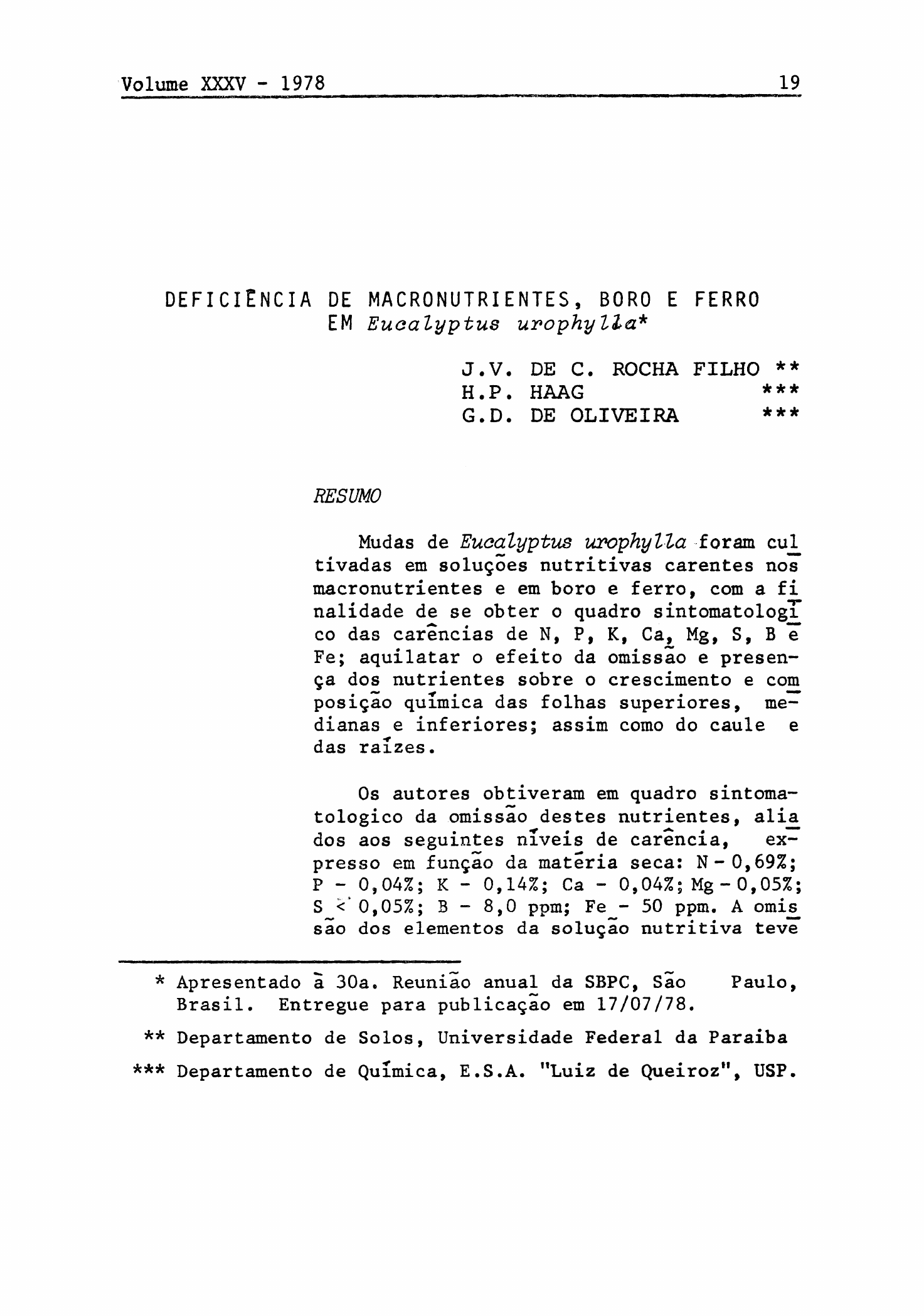 DEFICIÊNCIA DE MACRONUTRIENTES, BORO Ε FERRO EM Eucalyptus urophylla* J.V. DE C. ROCHA FILHO ** H.P. HAAG *** G.D. DE OLIVEIRA *** RESUMO Mudas de Eucalyptus urophylla foram cul¬ tivadas em soluções nutritivas carentes nos macronutrientes e em boro e ferro, com a fi¬ nalidade de se obter o quadro sintomatologi¬ co das carências de Ν, P, K, Ca, Mg, S, Β e Fe; aquilatar o efeito da omissão e presen ça dos nutrientes sobre o crescimento e com¬ posição química das folhas superiores, me dianas e inferiores; assim como do caule e das raízes. Os autores obtiveram em quadro sintoma¬ tologico da omissão destes nutrientes, alia¬ dos aos seguintes níveis de carência, ex presso em função da materia seca: Ν - 0,69%; Ρ - 0,04%; Κ - 0,14%; Ca - 0,04%; Mg - 0,05%; S < 0,05%; Β - 8,0 ppm; Fe - 50 ppm. A omis¬ são dos elementos da solução nutritiva teve * Apresentado à 30a. Reunião anual da SBPC, São Paulo, Brasil. Entregue para publicação em 17/07/78. ** Departamento de Solos, Universidade Federal da Paraiba *** Departamento de Química, E.S.A. "Luiz de Queiroz", USP. efeito depressivo no crescimento do Eucalyp¬ tus, com exceção do tratamento - S que não deferiu do tratamento completo. INTRODUÇÃO O crescimento e o desenvolvimento da industria madereira do País, nesses últimos anos, vêm exi gindo uma maior exploração econômica para a produ ção de madeira, fato este, evidenciado pela utili zação de solos de baixa fertilidade para a forma ção de povoamentos artificiais de Eucalyptus e ou tras essências florestais, A utilização desses solos, devido as suas lo calizações dos grandes centros consumidores aliado a uma topografia plana, reúne condições que mini- niza os custos de produção, desde que se utilizem técnicas agrícolas capazes de propiciar ao solo condições de boa fertilidade. No entanto, atualmente tem sido constatado di versos problemas nutricionais ligados a macro e mi cronutrientes, em povoamentos de Eucalyptus , im plantados nesses solos. Os sintomas de deficiências nutricionais do Eu calyptus tem sido pesquisado por diversos autores, devido a importância que representa para a Silvi- cultura, essa essência florestal. Assim, KARSCHON (1956) , apresentou uma chave para a identificação de sintomas conseqüentes da carência de ferro, observadas em Eucalyptus gom- phocephala, cultivados em solos de Israel. Segundo esse autor, a carência desse micronutriente, seria produzida pela presença de altas concentrações de cálcio e magnêsio, nos solos calcãreos de algumas regiões daquele Pais. MELLO et alii (I960), cultivando Eucalyptus al ba e Ε. grandis em condições de campo obtiveram valores porcentuais para Ν, Ρ, K, Ca e Mg em dife rentes partes da planta. HAAG et alii (1961), cultivando E. alba em va sos e irrigados com solução nutritiva, obtiveram sintomas de deficiência dos macronutrientes, sem obter entretanto, evidências sintomatologicas da carência de potássio. Esses autores, observaram que seus teores quantitativos de elementos mine rais foram concordantes com os obtidos por MELLO et alii (1961), com exceção feita para o cálcio. WILL (1961)fcultivando E. saligna, E. botryoi- des e E. pilularis, em solução nutritivas, con cluiu que as carências de nutrientes (N e P) podem suprimir completamente a formação de ramos, enquan to que a carência potãssica provoca a diminuição do comprimento dos entre-nos e o aparecimento de galhos de la. e 2a. ordens. A carência de Mg nas espécies E. botryoides e E. saligna provocou o de£ dobramento dos galhos e aumento no numero de fo lhas; enquanto, na carência de cálcio o crescimen to foi normal durante algumas semanas, mas foi in terrompido bruscamente, seguido de um secamento e morte das folhas. Na espécie E. pilularis apare ceram brotos axilares. BHYMAYA & KAUL (1966) , observaram, em condi ções de campo, sintomas de deficiências de alguns macro e micronutrientes em E. carnaldulensis, cul tivados em diferentes localidades da India e de terminaram os níveis de elementos nutrientes nas plantas sadias e nas que apresentavam sintomas de deficiência. KAUL et alii (1966) , estudaram as necessidades nutricionais de Ν, Ρ e Κ em "plântulas" de Euca lyptus. As plantas cultivadas na ausência de ni trogênio ou fósforo, mostraram sintomas bem defini dos. 0 potássio não apresentou efeito significati vo no desenvolvimento das plantas. SAVORY (1962) , observou, em florestas implan tadas de Pinus e Eucalyptus sintomas de deficiên cia de boro, os quais foram corrigidos, através de aplicação de fertilizantes contendo boro. Poste - riormente outros autores, tais como COOLING & JO NES (1970); TOKESHI et alii (1976); BARRET etJLIÍÍ (19 75) , detectaram também sintomas de deficiência de boro, em diferentes espécies de Eucalyptus. MUNÕZ - COBO & LANUZA (1970), estudando a^ nu trição de E. globulus em seus primeiros estágios de desenvolvimento e cultivados em solução nutri tiva, determinaram a variação da quantidade total e da concentração de Ν, Ρ, K, Ca, Mg, Fe, Mn e Zn, nas distintas partes da planta, principalmente,cau le e raízes. ACORSI et alii (1961) e HAAG et alii (1965), ob tiveram deficiências de micronutrientes em diferen tes espécies de Eucalyptus , quando cultivados em solução nutritiva e, determinaram a variação dos teores de micronutrientes existentes entre plantas deficientes, para boro, cobre, ferro, manganês, mo libdênio e zinco. HAAG et alii (1976) , apresentaram resultados analíticos de folhas, dos teores de macro e micro nutrientes em diferentes espécies de Eucalyptus cultivados em diferentes solos do Estado de São Paulo. HAGG et alii (1977) , determinaram os teores de nutrientes em folhas de E. citriodora cultivado no Estado de São Paulo e apôs observações comparati - vas, concluíram tratar-se de plantas que apresenta vam um estado generalizado de desnutrição mineral. O presente trabalho, teve o objetivo de e