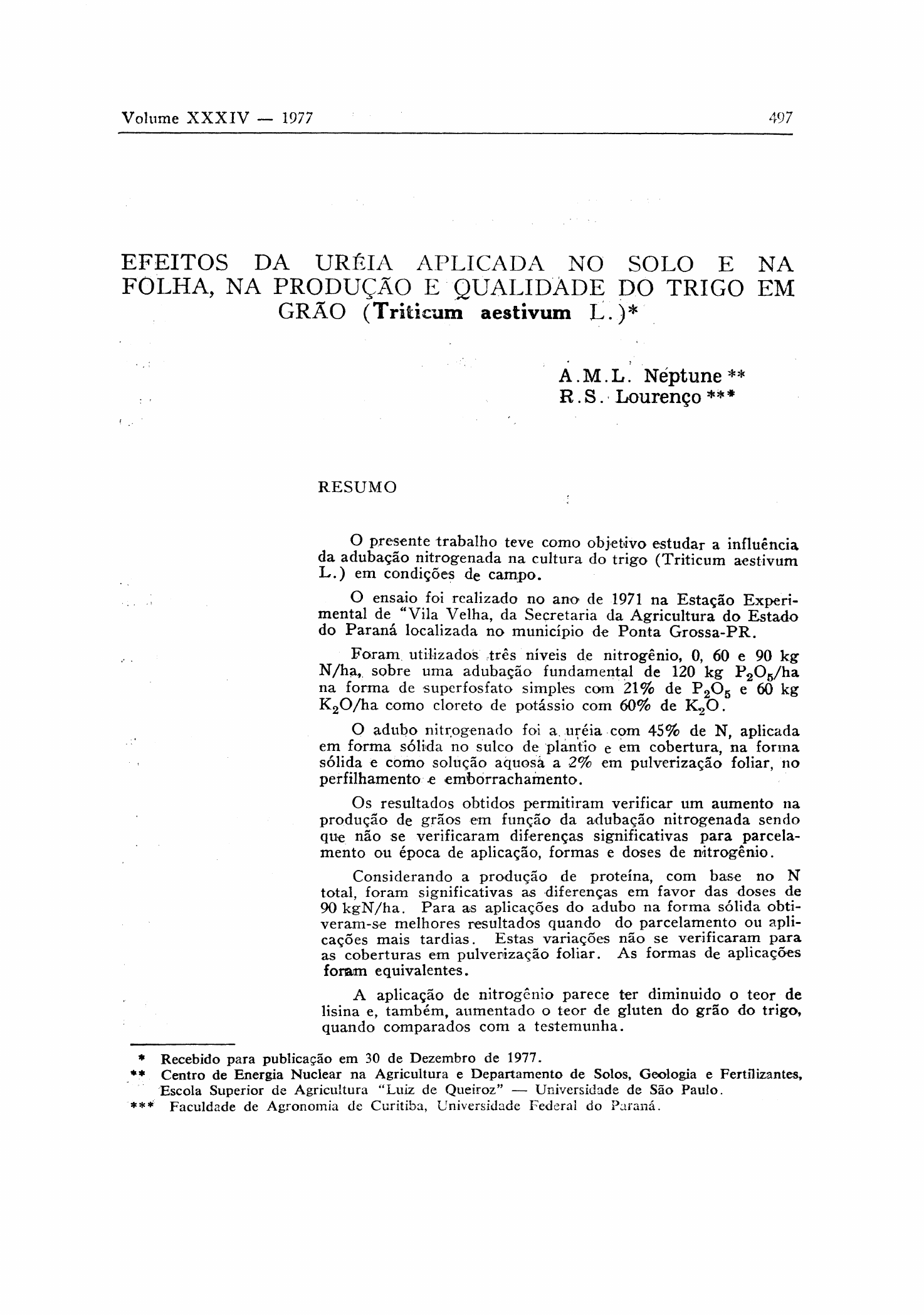N E P T U N E , A . M . L . e J . F . P A T E L L A , 1970. Efficiency of fertilizer nitrogen sources