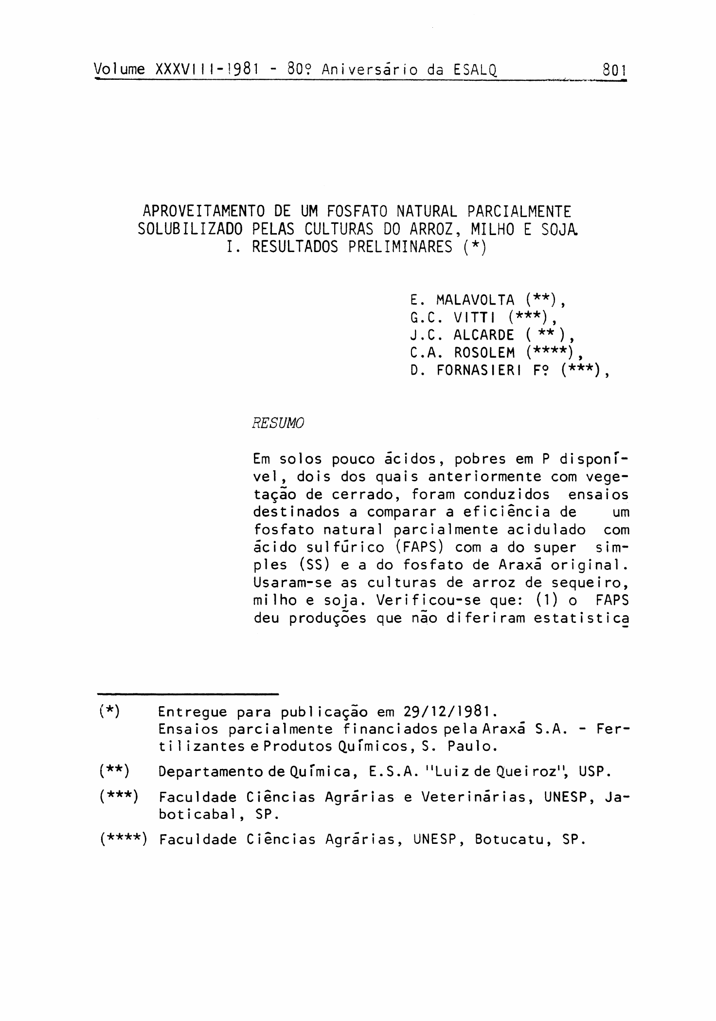 APROVEITAMENTO DE UM FOSFATO NATURAL PARCIALMENTE SOLUBILIZADO PELAS CULTURAS DO ARROZ, MILHO E SOJA. I . RESULTADOS PRELIMINARES (*) E. MALAVOLTA (**), G.C. VITTI (***), J.C. ALCARDE (**), C A . ROSOLEM (****), D. FORNASIERI Fº (***), RESUMO Em solos pouco ácidos, pobres em P disponí vel, dois dos quais anteriormente com vege¬ tação de cerrado, foram conduzidos ensaios destinados a comparar a eficiência de um fosfato natural parcialmente acidulado com ácido sulfúrico (FAPS) com a do super sim ples (SS) e a do fosfato de Araxá original. Usaram-se as culturas de arroz de sequeiro, milho e soja. Verificou-se que: ( 1 ) o FAPS deu produções que não diferiram estatística (*) Entregue para publicação em 2 9 / 1 2 / 1 9 8 1 . Ensaios parcialmente financiados pela Araxá S.A. - Fer¬ tilizantes e Produtos Químicos, S. Paulo. (**) Departamento de Química, E.S.A. "Luiz de Queiroz", USP. (***) Faculdade Ciências Agrárias e Veterinárias, UNESP, Ja¬ boticabal, SP. (****) Faculdade Ciências Agrárias, UNESP, Botucatu, SP. mente das obtidas com o SS sendo maiores que as conseguidas com o FA; ( 2 ) os resulta¬ dos das análises de solos e da diagnose fo liar indicam que o FAPS funcionou como fon te de P, Ca e S. INTRODUÇÃO 0 fósforo (P) é reconhecidamente o macronutriente que com mais freqüência limita por sua falta nos solos brasilei ros a produçio das diferentes culturas, particu1armente as não perenes. As necessidades do elemento vem sendo supridas graças a utilizaçio das reservas de fosfatos do Brasil Central, sendo o mercado dominado por dois produtos - o superfosfato triplo e os fosfatos de amônio. Aplica-se ao País, principalmente ao Planalto Central, área "core" do cerrado o que disse D. Mc Cune do IFDC no ano passado: "I do not think we know which are the major nutrients for the tropics. We realise that nitrogen is probab1y the most important and phosphorus second, but sulphur maybe more important than potash". De fato, é muito possível que no Brasil os macronutrien tes sejam necessários na seguinte ordem decrescente: P, N, S, K, Mg, Ca; o enxofre (S), em termos gerais ê o terceiro elemento que com mais freqüência limita a colheita. Os adubos erroneamente ditos "concentrados", super tri plo e fosfatos de amônio não contêm enxofre, embora esse ele mento tenha participado do processo de fabricaçio. A produção do super simples que possui enxofre (co mo gesso) deverá ser estabilizada nos próximos anos e a do sulfato de amônio outra importante fonte de S, nio cres cera s i gn i f i cat i vãmente. Com isso crescerá o déficit de enxofre na adubaçio (= di ferença entre uso e necessidade) com reflexos certamente des favoráveis na produtividade agrícola. A experiência acumulada nos últimos anos tem demonstra do como regra que os sulfatos naturais brasileiros nio podem competir com os fosfatos solubi1izados (por via térmica ou via ácida) como fonte de P2O5 para as plantas devendo o seu uso concentrar-se principalmente na adubaçio corretiva (MALA- VOLTA, 1 9 8 1 ; GOEDERT, 1 9 8 1 ) . A literatura disponível sobre o valor agrícola dos fos fatos naturais parcialmente acidulados nio é muito abundante, podendo ser resumida como se segue, COOKE ( I 9 5 6 ) , reuniu os resultados de ensaios em vasos conduzidos na França em que o fosfato parcialmente atacado deu 67¾ da produção obtida com superfosfato. TERMAN ( 1 9 7 1 ) relatou que os produtos parcialmente aci dulados e granulados mostraram-se,inferiores ao superfosfato como fonte de P para o milho. 0 fosfato natural parcialmente acidulado nio granulado foi, entretanto, superior ao superfos fato em pó em solos muito ácidos. Acredita que a eficiência seja diminuída pela granulaçio que dificultaria a disponíbiM dade de fração não transformada pelo ácido. KHASAWNEH S DOLL (1978) fizeram uma revisão de traba lhos a respeito do valor agrícola dos fosfatos naturais par cialmente acidulados (FNPA): em k6 de um total de 53 ensaios conduzidos em Ohio, E.U.A., as colheitas obtidas com o produ to 20¾ acidulado foram maiores ou iguais as conseguidas com o superfosfato; em experimentos em vasos conduzidos pela T.V. A. a eficiência do FNPA mostrou-se menor que a do superfosfa to; depois de relatar mais resultados experimentais concluem que os dados sobre a eficiência desses produtos são conflitan tes o que pode ser atribuído a diferenças na granulometria, grau de acidulação, dose, tipo de solo. WERNER ( I978) escreve que o FNPA pode ter eficiência i- gual i metade da do superfosfato; entretanto em um solo cas tanho ácido o produto obtido a partir de rocha mole deu resu] tado igual ao do superfosfato. SHINDE et alii (1978) demonstraram que o FNPA ( 5 0 ¾ ) com H C 1 ou ^SOjj foi adequado para o arroz irrigado por inundaçla DASH et alii ( 1 9 8 1) mostraram que o FNPA (50-75¾) foi tio bom quanto o superfosfato nas culturas do arroz irrigado por inundação e na do trigo em condições aeróbicas, nos dois casos em solos ácidos. FRANCO ( 1977 ) estudou o aproveitamento do FNPA usando produtos com diferentes graus de acidulaçao ( 5 , 1 5 e 75¾) por ácido clorídrico, sulfürico ou fosfórico; sorgo foi a oi anta reagente cultivada em vasos com solo pobre em P e que recebeu calagem até pH 7 , 0 . Os produtos foram aplicados em 3 doses: 0 , 2 5 ; 0 , 5 0 ; 1 ,00 da capacidade máxima de fixação de fósforo (CMFA) do solo ( 1 , 0 0 = 0 , 3 ^ mg P/g de solo). As rochas fosfa tadas que deram origem aos produtos utilizados foram as de Araxá e de Patos, ambas do Estado de Minas Gerais. Na compara çio entraram super triplo e as rochas fosfatadas. 0 FNPA pro duzido com fosfato de Araxá usando H^SOij e 25¾ de acidulaçao, continha 3% de P2OC solúvel em água e 21¾ de P2O5 total. Os dados de produção ae matéria seca total foram os seguintes- (g/vaso): Verificou-se ainda que a solubilidade dos produtos em ácido cítrico a 2¾ e ácido fórmico a 1¾ para as relações 1 : 100 e 
