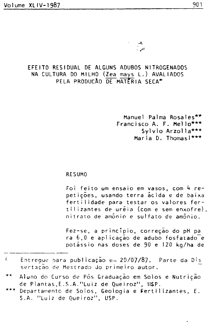 EFEITO RESIDUAL DE ALGUNS ADUBOS NITROGENADOS NA CULTURA DO MILHO (Zea mays L.) AVALIADOS PELA PRODUÇÃO DE MATÉRIA SECA* Manuel Palma Rosales** Francisco A. F. Mello*** Sylvio Arzolla*** Maria D. Thomasi*** RESUMO Foi feito um ensaio em vasos, com 4 re petições, usando terra ácida e de baixa fertilidade para testar os valores fer tilizantes de uréia (com e sem enxofre), nitrato de amônio e sulfato de amônio. Fez-se, a princípio, correção do pH pa¬ ra 6,0 e aplicação de adubo fosfatado e potássio nas doses de 90 e 120 kg/ha de * Entregue para publicação em 2 0 / 0 7 / 8 7 . Parte da Dis¬ sertação de Mestrado do primeiro autor. ** Aluno do Curso de Pôs Graduação em Solos e Nutrição de Plantas,E.S.A."Luiz de Queiroz", USP. *** Departamento de Solos, Geologia e Fertilizantes, E. S.A. "Luiz de Queiroz", USP. P205 K 2 0 , respectivamente. As doses de N foram de 0, 120 e 240 kg/ha. A planta teste foi o milho. No ano seguinte o ensaio foi repetido, mas sem calagem e sem adição dos fe r t i ¬ lizantes nitrogenados. No ano subsequente repetiu-se o ensaio anterior fazendo-se, porém, calagem em duas repetições de cada tratamento. Após a colheita do milho estudaram-se os efeitos residuais dos adubos nitro genados em competição tomando-se como parâmetros de avaliação a produção de massa de matéria seca de partes aéreas e de plantas inteiras e conteúdos de nitrogênio das mesmas As principais conclusões gerais são: a. No que concerne à produção de maté ria seca de partes aéreas e de plantas inteiras não houve efeito residual de N, exceto nos tratamentos corresponden¬ tes às partes aéreas de plantas que não receberam calagem. b. Não houve efeito residual das fontes nitrogenadas quando se tomou como par⬠metro de avaliação o conteúdo de N das plantas. INTRODUÇÃO Freqüentemente são efetuados ensaios para se ve rificar o efeito residual de fertilizantes fosfatados, tomando-se como parâmetro de avaliação geralmente as produções das culturas. Experimentos dessa natureza ra ramente são feitos com adubos potãssicos e quase nunca com adubos nitrogenados. Contudo, como parte do chamado Projeto Uréia, UIT Protocolo firmado entre Petrof er t i 1 / N i trof er t i 1 - N E / Ultrafertil S.A. e Escola Superior de Agricultura "Luiz de Queiroz", foi realizado um ensaio oe competição de fontes nitroqenadas usando o milho como planta teste (THOMAZI, 1 9 § 3 ) . A seguir, utilizando-se as mesmas terra-, e vasos estudaram-se os efeitos residuais das mesmas fontes de ní\rogênio (MELLO & ARZOLLA, 1 9 8 3 ) . E, finalmente, ainda nas mesmas terras e vasos, foi instalado um terceiro ensaio para avaliar os efei tos residuais dos mesmos fertilizantes nitrogenados (uréia com e sem enxofre, nitrato de amônio e sulfato de amônio) tomando-se como parâmetros de avaliação a produ ção de massa de partes aéreas e de plantas inteiras de~~ milho e conteúdos de N das mesmas. REVISÃO DA LITERATURA Trabalhos referentes à ação residual do nitrogê nio nas plantas são poucos . Em experimentos realizados em vasos SMIRNOV & S I O V ( 1 9 7 0 ) constataram que o 15N utilizado pela aveia apôs o 1º a o de aplicação foi 1 - 2 % do N originalmente aplicado. A utilização no 2º ano foi 50% menor. Uma rea¬ plicação de N praticamente dobou a utilização do ferti lizante nitrogenado previamente fixado em formas orgâ nicas. Em condições de campo as plantas utilizaram do N aplicado, aproximadamente 20% foi perdido e 3 0 - 4 0 % permaneceu no solo na forma orgânica. KOREN´KOV et alii ( 1 9 7 6 ) observaram nos seus tra¬ balhos que os fertilizantes nitrogenados possuem geral mente pequeno efeito residual devido ao fato que o N é quase todo utilizado pela primeira cultura. O re velou que boa parte do N é fixado em formas orgânicas no solo. O baixo efeito residual pode ser explicado pe la baixa disponibilidade às plantas do N imobilizado. SMIRNOV ( 1 9 6 9 ) , TURCHIN ( 1 9 6 4 ) e ANDREYEVA & SOHEGLOVA ( 1 9 7 2 ) afirmaram que o efeito residual dos fertilizantes nitrogenados é insignificante mas segundo SMIRNOV et alii ( 1 9 7 2 ) o grau de mineralização do N imo¬ bilizado e 5 - 6 vezes maior que o N da matéria orgânica. SMIRNOV & SUKOV ( 1 9 7 0 ) opinam que no primeiro ano do efeito residual, uma boa parte do fertilizante nitrogenado fixado no solo provavelmente permanece na forma orgânica, a qual se decompõe facilmente, e só uma parte dela é formada por substâncias húmicas pouco hi¬ drolizáveis em água. Parte do N imibilizado está presen¬ te nas regiões periféricas das moléculas de substâncias húmicas o que facilita a mineralização. Como as substân¬ cias húmicas formam compostos cíclicos o N nas partes periféricas das moléculas formam ligações cíclicas e, sua estabilidade aumenta quando a mineralização diminue. Isto explica o baixo uso do N imobilizado no segundo ano e anos subsequentes. MATERIAIS E MÉTODOS A terra utilizada é proveniente de solo de tabu leiro de Maceió (Rio Largo), Alagoas, e a planta teste foi o milho (Zea mays L.) c.v. Piranio. Algumas caracte rísticas q'j'micas do solo estão na Tabela 1 . Um trabalho foi conduzido durante 3 anos em casa de vegetação. Foram utilizados vasos com 3 , 0 kg de ter ra. No primeiro ano, as terras dos vasos foram submeti das aos tratamentos Tabela 2 , sendo os adubos bem misturados a elas e plantado milho. No 2 ? e 3 ? anos foi omitido o nitrogênio apenas e o enxofre, 0 fósforo foi utilizado como superfosfato triplo (**5% de ?2®c)> n o s tratamentos 9 e 1 0 , potássio e enxo fre foram utilizados como K^SO^ . Nos outros tratamen tos, o potássio foi utilizado na forma de K C 1 . Nns tra tamentos 1 1 e 1 2 , o enxofre foi aplicado na forma de gesso. Descrições mais detalhada dos dois primeiros en saios são apresentadas por THOMAZI ( 1 9 8 3 ) e MELLO & AR- ZOLLA (1 983) . Antes de fazer a terceira semeadura ( 0 2 / 0 1 / 8 3 ) , foram determinados os va