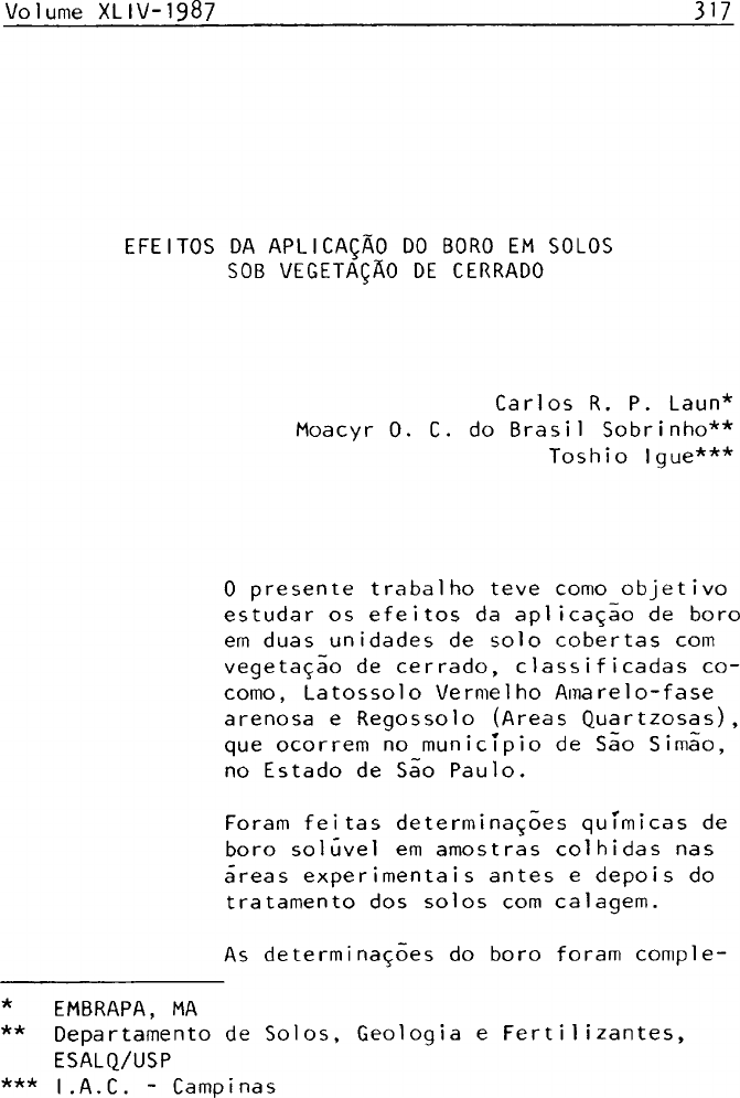 E F E I T O S DA A P L I C A Ç Ã O DO BORO EM SOLOS SOB VEGETAÇÃO DE CERRADO C a r l o s R . P . L a u n * Moacy r O. C . do B r a s i l S o b r i n h o * * T o s h i o I g u e * * * O p r e s e n t e t r a b a l h o t e v e como o b j e t i v o e s t u d a r o s e f e i t o s da a p l i c a ç ã o de b o r o em d u a s u n i d a d e s de s o l o c o b e r t a s com v e g e t a ç ã o de c e r r a d o , c l a s s i f i c a d a s co- como , L a t o s s o l o V e r m e l h o A m a r e l o - f a s e a r e n o s a e R e g o s s o l o ( A r e a s Q u a r t z o s a s ) , que o c o r r e m no m u n i c í p i o de S ã o S i m ã o , no E s t a d o de S ã o P a u l o . Fo ram f e i t a s d e t e r m i n a ç õ e s q u í m i c a s de b o r o s o l ú v e l em a m o s t r a s c o l h i d a s n a s á r e a s e x p e r i m e n t a i s a n t e s e d e p o i s do t r a t a m e n t o d o s s o l o s com c a l a g e m . A s d e t e r m i n a ç õ e s do b o r o f o r a m c o m p l e ¬ * EMBRAPA, MA * * D e p a r t a m e n t o de S o l o s , G e o l o g i a e F e r t i l i z a n t e s , E S A L Q / U S P * * * I . A . C . - C a m p i n a s m e n t a d o s com t e s t e s b i o l ó g i c o s do g i r a s ¬ sol ( H e l i a n t h u s a n n u u s L . ) . S i m u l t a n e a m e n t e f o r a m c o n d u z i d o s e n s a i o s de campo p a r a e s t u d o s s o b r e a a p l i c a ç ã o de d o s e s c r e s c e n t e s de b o r o no f e i j o e i ¬ r o ( P h a s e o l u s v u l g a r i s L . ) . A s c o n c l u s õ e s do t r a b a l h o f o r a m a s se¬ g u i n t e s : 1 - O t e s t e do g i r a s s o l a p r e s e n t o u boa c o n c o r d â n c i a com o s t e s t e s q u í m i c o s , in¬ d i c a n d o que a s d u a s u n i d a d e s de s o l o s ã o l i g e i r a m e n t e d e f i c i e n t e s ou não d e f i c i e n t e s em b o r o . 2 - O s o l o c l a s s i f i c a d o como R e g o s s o l o ( A r e i a s Q u a r t z o s a s ) m o s t r o u - s e m a i s ele¬ v a d o em b o r o do que o L a t o s s o l V e r m e l h o A m a r e l o - f a s e a r e n o s a . 3 - Não h o u v e e f e i t o da a p l i c a ç ã o de b o r o na p r o d u ç ã o do f e i j o e i r o . e e c o n ô m i c a s p a r a o s e u a p r o v e i t a m e n t o r a c i o n a l . No E s t a d o de S a o P a u l o , d e f i c i ê n c i a s de b o r o tem o c o r r i d o em a l g u m a s c u l t u r a s t a i s como a l g o d o e i r o , c a - f e e i r o , c i t r u s , e u c a l i p t o s , m a m o e i r o , P i n u s e em h o r t a l i ç a s com m a i o r f r e q ü ê n c i a . Os s o l o s s o b v e g e t a ç ã o de c e r r a d o , c o n f o r m e o s e u m a t e r i a l de o r i g e m e o s p r o c e s s o s de s u a f o r m a ç ã o , f o r mam s o l o s m u i t o d i f e r e n t e s um do o u t r o , d e s d e a s A r e i a s Q u a r t z o s a s a t é s o l o s p o d z o l i z a d o s ou l a t o s s o l o s v e r m e l h o s , c o m r e a ç õ e s p e c u l i a r e s a a d i ç ã o de f e r t i l i z a n t e s L e v a n d o em c o n t a a n e c e s s i d a d e de c o n t r i b u i r p a r a o m e l h o r c o n h e c i m e n t o d e s s e s s o l o s , e l a b o r o u - s e o p r e s e n t e t r a b a l h o , c u j o o b j e t i v o p r e c i p u o f o i e s t u d a r , a t r a v é s de e n s a i o s de l a b o r a t ó r i o , c a s a de v e g e t a ç ã o e de c a m p o , o s e f e i t o s da a p l i c a ç ã o do m i c r o n u t r i e n t e b o r o em m i1 ho e f e i j a o . E s s a s c u l t u r a s f o r a m e s c o l h i d a s d e v i d o a s u a g r a n d e i m p o r t â n c i a na r e g i ã o . F o r a m u t i l i z a d a s d u a s u n i d a d e s de s o l o s s o b c e r r a d o , c l a s s i f i c a d a s como L a t o s s o l o V e r m e l h o A m a r e l o - f a s e a r e n o s a e R e g o s s o l o que o c o r r e m no M u n i c í p i o de S ã o S i m ã o , e em o u t r a s á r e a s do E s t a d o de S ã o P a u l o , p e r f a z e n d o 6¾ da s u p e r f í c i e t o t a l d e s t e ú l t i m o , s e n d o n e - — c e s s á r i o r e s s a l t a r que a s e g u n d a e n t i d a d e de s o l o a p e s a r de c o n t r i b u i r com a p e n a s 0 , 9 ¾ da s u p e r f í c i e do E s t a do , tem a s s u a s m a i o r e s m a n c h a s c o n c e n t r a d a s no M u n i c T p i o de S a o S i m ã o e r e g i õ e s c i r c u n v i z i n h a s . ~~ R E V I S Ã O DE L I T E R A T U R A S a o r e l a t i v a m e n t e p o u c o s o s t r a b a l h o s s o b r e r e a ç ã o ã b o r o n o s s o l o s do E s t a d o de S ã o P a u l o . S a b e - s e que d e t e r m i n a d a s p l a n t a s teem a p r e s e n t a d o d e f i c i ê n c i a de b o r o , t a i s c o m o , h o r t a l i ç a s , a l g o d o e i r o , c a f e e i r o , c i t r u s e e u c a l i p t u s . B R A S I L SOBRINHO ( 1 9 6 5 ) , CASAGRANDE ( 1 9 7 8 ) , A L - CARDE ( 1 9 6 9 ) , CATANI e t a i i i ( 1 9 7 0 ) r e a l i z a r a m e s t u d o s p r o c u r a n d o d e t e r m i n a r o s t e o r e s de b o r o s o l ú v e l n o s s o l o s do E s t a d o e s e l e c i o n a r o s s o l o s com p r o v á v e i s d e f i c i ê n c i a s do e l e m e n t o . E S P I R O N E L L O ( I 9 7 2 ) e s t u d o u a r a ç ã o da c a n a de a ç ú c a r a a d i ç ã o de B o r o em s o l o s do m u n i c í p i o de Pirac_i_ c a b a . A p e s a r de s e r e m c o n d i d e r a d o s b a i x o s o s t e o r e s de b o r o e n c o n t r a d o s não h o u v e r e a ç ã o da c a n a ã a d i ç ã o do b o r o . CARVALHO ( I 9 8 I b ) , em a l g o d o e i r o , e n c o n t r o u b o a s r e a ç õ e s ã a d i ç ã o de b o r o em L . V . E . , f a s e o r t o da r e g i ã o de Leme ( S P ) . CARVALHO ( I 9 8 I a ) e n c o n t r o u r e a ç ã o no p l a n t i o de e u c a l i p t o s em s o l o s , p r i m i t i v a m e n t e , c o b e r t o s com v e g e t a ç ã o de c e r r a d o . A s s i m