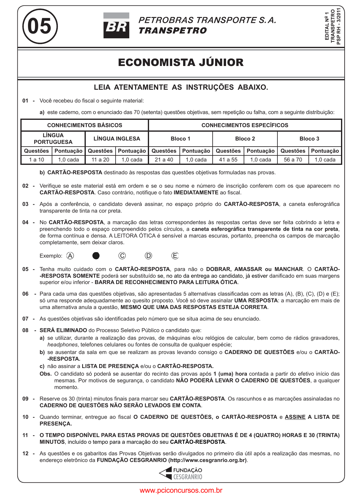 pcimarkpci MDAwMDowMDAwOjAwMDA6MDAwMDowMDAwOmZmZmY6MmQ4YzpjMGE1:U2F0LCAyOCBKdW4gMjAyNSAxMDoxMTo1NSAtMDMwMA== www.pciconcursos.com.br ECONOMISTA JÚNIOR1 LEIA ATENTAMENTE AS INSTRUÇÕES ABAIXO. 01 - Você recebeu do fiscal o seguinte material: a) este caderno, com o enunciado das 70 (setenta) questões objetivas, sem repetição ou falha, com a seguinte distribuição: b) CARTÃO-RESPOSTA destinado às respostas das questões objetivas formuladas nas provas. 02 - Verifique se este material está em ordem e se o seu nome e número de inscrição conferem com os que aparecem no CARTÃO-RESPOSTA. Caso contrário, notifique o fato IMEDIATAMENTE ao fiscal. 03 - Após a conferência, o candidato deverá assinar, no espaço próprio do CARTÃO-RESPOSTA, a caneta esferográfica transparente de tinta na cor preta. 04 - No CARTÃO-RESPOSTA, a marcação das letras correspondentes às respostas certas deve ser feita cobrindo a letra e preenchendo todo o espaço compreendido pelos círculos, a caneta esferográfica transparente de tinta na cor preta, de forma contínua e densa. A LEITORA ÓTICA é sensível a marcas escuras, portanto, preencha os campos de marcação completamente, sem deixar claros. Exemplo: 05 - Tenha muito cuidado com o CARTÃO-RESPOSTA, para não o DOBRAR, AMASSAR ou MANCHAR. O CARTÃO- -RESPOSTA SOMENTE poderá ser substituído se, no ato da entrega ao candidato, já estiver danificado em suas margens superior e/ou inferior - BARRA DE RECONHECIMENTO PARA LEITURA ÓTICA. 06 - Para cada uma das questões objetivas, são apresentadas 5 alternativas classificadas com as letras (A), (B), (C), (D) e (E); só uma responde adequadamente ao quesito proposto. Você só deve assinalar UMA RESPOSTA: a marcação em mais de uma alternativa anula a questão, MESMO QUE UMA DAS RESPOSTAS ESTEJA CORRETA. 07 - As questões objetivas são identificadas pelo número que se situa acima de seu enunciado. 08 - SERÁ ELIMINADO do Processo Seletivo Público o candidato que: a) se utilizar, durante a realização das provas, de máquinas e/ou relógios de calcular, bem como de rádios gravadores, headphones, telefones celulares ou fontes de consulta de qualquer espécie; b) se ausentar da sala em que se realizam as provas levando consigo o CADERNO DE QUESTÕES e/ou o CARTÃO- -RESPOSTA. c) não assinar a LISTA DE PRESENÇA e/ou o CARTÃO-RESPOSTA. Obs. O candidato só poderá se ausentar do recinto das provas após 1 (uma) hora contada a partir do efetivo início das mesmas. Por motivos de segurança, o candidato NÃO PODERÁ LEVAR O CADERNO DE QUESTÕES, a qualquer momento. 09 - Reserve os 30 (trinta) minutos finais para marcar seu CARTÃO-RESPOSTA. Os rascunhos e as marcações assinaladas no CADERNO DE QUESTÕES NÃO SERÃO LEVADOS EM CONTA. 10 - Quando terminar, entregue ao fiscal O CADERNO DE QUESTÕES, o CARTÃO-RESPOSTA e ASSINE A LISTA DE PRESENÇA. 11 - O TEMPO DISPONÍVEL PARA ESTAS PROVAS DE QUESTÕES OBJETIVAS É DE 4 (QUATRO) HORAS E 30 (TRINTA) MINUTOS, incluído o tempo para a marcação do seu CARTÃO-RESPOSTA. 12 - As questões e os gabaritos das Provas Objetivas serão divulgados no primeiro dia útil após a realização das mesmas, no endereço eletrônico da FUNDAÇÃO CESGRANRIO (http://www.cesgranrio.org.br). ECONOMISTA JÚNIOR 05 ED IT A L N o 1 TR A N SP ET R O PS P R H - 3/ 20 11 CONHECIMENTOS BÁSICOS CONHECIMENTOS ESPECÍFICOS LÍNGUA PORTUGUESA LÍNGUA INGLESA Bloco 1 Bloco 2 Bloco 3 Questões Pontuação Questões Pontuação Questões Pontuação Questões Pontuação Questões Pontuação 1 a 10 1,0 cada 11 a 20 1,0 cada 21 a 40 1,0 cada 41 a 55 1,0 cada 56 a 70 1,0 cada www.pciconcursos.com.br pcimarkpci MDAwMDowMDAwOjAwMDA6MDAwMDowMDAwOmZmZmY6MmQ4YzpjMGE1:U2F0LCAyOCBKdW4gMjAyNSAxMDoxMTo1NSAtMDMwMA== www.pciconcursos.com.br ECONOMISTA JÚNIOR 2 LÍNGUA PORTUGUESA Um pouco de silêncio Nesta trepidante cultura nossa, da agitação e do barulho, gostar de sossego é uma excentricidade. Sob a pressão do ter de parecer, ter de participar, ter de adquirir, ter de qualquer coisa, assumimos uma infinidade de obrigações. Muitas desnecessárias, ou- tras impossíveis, algumas que não combinam conos- co nem nos interessam. Não há perdão nem anistia para os que ficam de fora da ciranda: os que não se submetem mas ques- tionam, os que pagam o preço de sua relativa auto- nomia, os que não se deixam escravizar, pelo menos sem alguma resistência. O normal é ser atualizado, produtivo e bem-in- formado. É indispensável circular, estar enturmado. Quem não corre com a manada praticamente nem existe, se não se cuidar botam numa jaula: um animal estranho. Acuados pelo relógio, pelos compromissos, pela opinião alheia, disparamos sem rumo – ou em trilhas determinadas – feito hamsters que se alimentam de sua própria agitação. Ficar sossegado é perigoso: pode parecer doença. Recolher-se em casa, ou dentro de si mesmo, ame- aça quem leva um susto cada vez que examina sua alma. Estar sozinho é considerado humilhante, sinal de que não se arrumou ninguém – como se amizade ou amor se “arrumasse” em loja. [...] Além do desgosto pela solidão, temos horror à quietude. Logo pensamos em depressão: quem sabe terapia e antidepressivo? Criança que não brinca ou salta nem participa de atividades frenéticas está com algum problema. O silêncio nos assusta por retumbar no vazio dentro de nós. Quando nada se move nem faz baru- lho, notamos as frestas pelas quais nos espiam coi- sas incômodas e mal resolvidas, ou se enxerga outro ângulo de nós mesmos. Nos damos conta de que não somos apenas figurinhas atarantadas correndo entre casa, trabalho e bar, praia ou campo. Existe em nós, geralmente nem percebido e nada valorizado, algo além desse que paga contas, transa, ganha dinheiro, e come, envelhece, e um dia (mas isso é só para os outros!) vai morrer. Quem é esse que afinal sou eu? Quais seus desejos e medos, seus projetos e sonhos? No susto que essa ideia prov
