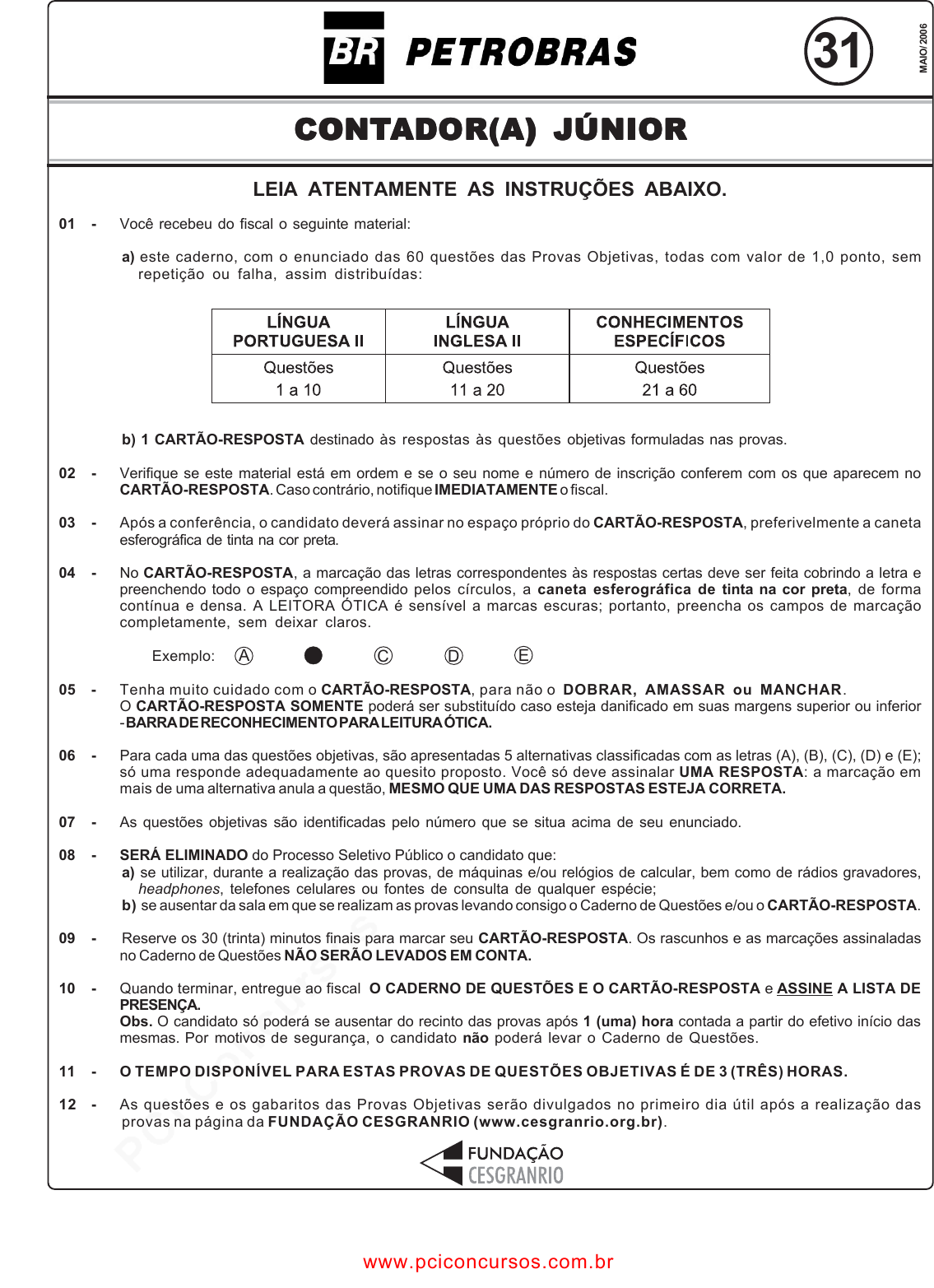 pcimarkpci MDAwMDowMDAwOjAwMDA6MDAwMDowMDAwOmZmZmY6MmQ4YzpjMGE1:U2F0LCAyOCBKdW4gMjAyNSAxMDowNzoxMiAtMDMwMA== www.pciconcursos.com.br CONTCONTCONTCONTCONTADOR(A) JÚNIORADOR(A) JÚNIORADOR(A) JÚNIORADOR(A) JÚNIORADOR(A) JÚNIOR M AI O / 2 00 6 31 LEIA ATENTAMENTE AS INSTRUÇÕES ABAIXO. 01 - Você recebeu do fiscal o seguinte material: a) este caderno, com o enunciado das 60 questões das Provas Objetivas, todas com valor de 1,0 ponto, sem repetição ou falha, assim distribuídas: b) 1 CARTÃO-RESPOSTA destinado às respostas às questões objetivas formuladas nas provas. 02 - Verifique se este material está em ordem e se o seu nome e número de inscrição conferem com os que aparecem no CARTÃO-RESPOSTA. Caso contrário, notifique IMEDIATAMENTE o fiscal. 03 - Após a conferência, o candidato deverá assinar no espaço próprio do CARTÃO-RESPOSTA, preferivelmente a caneta esferográfica de tinta na cor preta. 04 - No CARTÃO-RESPOSTA, a marcação das letras correspondentes às respostas certas deve ser feita cobrindo a letra e preenchendo todo o espaço compreendido pelos círculos, a caneta esferográfica de tinta na cor preta, de forma contínua e densa. A LEITORA ÓTICA é sensível a marcas escuras; portanto, preencha os campos de marcação completamente, sem deixar claros. Exemplo: 05 - Tenha muito cuidado com o CARTÃO-RESPOSTA, para não o DOBRAR, AMASSAR ou MANCHAR. O CARTÃO-RESPOSTA SOMENTE poderá ser substituído caso esteja danificado em suas margens superior ou inferior - BARRA DE RECONHECIMENTO PARA LEITURA ÓTICA. 06 - Para cada uma das questões objetivas, são apresentadas 5 alternativas classificadas com as letras (A), (B), (C), (D) e (E); só uma responde adequadamente ao quesito proposto. Você só deve assinalar UMA RESPOSTA: a marcação em mais de uma alternativa anula a questão, MESMO QUE UMA DAS RESPOSTAS ESTEJA CORRETA. 07 - As questões objetivas são identificadas pelo número que se situa acima de seu enunciado. 08 - SERÁ ELIMINADO do Processo Seletivo Público o candidato que: a) se utilizar, durante a realização das provas, de máquinas e/ou relógios de calcular, bem como de rádios gravadores, headphones, telefones celulares ou fontes de consulta de qualquer espécie; b) se ausentar da sala em que se realizam as provas levando consigo o Caderno de Questões e/ou o CARTÃO-RESPOSTA. 09 - Reserve os 30 (trinta) minutos finais para marcar seu CARTÃO-RESPOSTA. Os rascunhos e as marcações assinaladas no Caderno de Questões NÃO SERÃO LEVADOS EM CONTA. 10 - Quando terminar, entregue ao fiscal O CADERNO DE QUESTÕES E O CARTÃO-RESPOSTA e ASSINE A LISTA DE PRESENÇA. Obs. O candidato só poderá se ausentar do recinto das provas após 1 (uma) hora contada a partir do efetivo início das mesmas. Por motivos de segurança, o candidato não poderá levar o Caderno de Questões. 11 - O TEMPO DISPONÍVEL PARA ESTAS PROVAS DE QUESTÕES OBJETIVAS É DE 3 (TRÊS) HORAS. 12 - As questões e os gabaritos das Provas Objetivas serão divulgados no primeiro dia útil após a realização das provas na página da FUNDAÇÃO CESGRANRIO (www.cesgranrio.org.br). A C D E www.pciconcursos.com.br pcimarkpci MDAwMDowMDAwOjAwMDA6MDAwMDowMDAwOmZmZmY6MmQ4YzpjMGE1:U2F0LCAyOCBKdW4gMjAyNSAxMDowNzoxMiAtMDMwMA== www.pciconcursos.com.br CONTADOR(A) JÚNIOR 2 LÍNGUA PORTUGUESA II A ciência da biodiversidade A fronteira da biodiversidade é azul. Atrás das ondas, mais do que em qualquer outro lugar do planeta, está o maior número de seres vivos a descobrir. Os mares parecem guardar a resposta sobre a origem da vida e uma potencial revolução para o desenvolvimento de medica- mentos, cosméticos e materiais para comunicações. Prova do mundo escondido na água é a identificação recente de lulas colossais com mais de dez metros, de polvos que brilham no escuro e de demônios-do-mar transparentes. No Brasil, será oficialmente anunciada em breve a identificação de mais uma espécie de baleia em nosso litoral. Cientistas descobriram no Rio de Janeiro uma nova espécie de arraia que vive nas trevas. E um inventário recém-concluído mostrará que Abrolhos tem a maior diversidade marinha de todo o Atlântico Sul. Conhecemos menos de 5% das criaturas marinhas. Das planícies abissais – o verdadeiro fundo do mar, que ocupa a maior parte da superfície da Terra – vimos menos de 1%. Sabemos mais sobre a superfície da Lua e de Marte do que do fundo do mar. Os oceanos são hoje o grande desafio para a conservação...[...] Uma das descobertas mais surpreendentes é o acréscimo de mais uma espécie à lista de baleias que ocorrem no litoral brasileiro. Com a baleia-bicuda-de-True encontrada em São Sebastião, São Paulo, sobe para 43 o número de espécies de baleias registradas na costa do Brasil. – Essa descoberta mostra que os oceanos são nossa última fronteira. Desconhecemos até o que existe na costa. O registro de mais uma espécie é um dos mais importantes dos últimos anos e muda o conhecimento sobre nossa fauna – afirma um dos autores da descoberta, o pesquisador Salvatore Siciliano. [...] A baleia-bicuda-de-True chega a ter seis metros de comprimento e não se imaginava que pudesse chegar ao litoral brasileiro. Seu registro sairá em breve na revista científica Global Marine Environment. Encontrar registros novos de animais tão grandes quanto baleias impressiona, mas não surpreende os cientistas. Nos últimos anos, descobriram-se não só novos registros mas novas espécies de peixes e invertebrados marinhos – como estrelas-do-mar, corais, lulas e crustáceos. Oficialmente, por exemplo, há 1.300 espécies de peixes marinhos no Brasil. Mas os especialistas sabem que esse número é muitas vezes maior. AZEVEDO, Ana Lucia, Revista O Globo, 19 mar. 2006 (com adaptações). 10 5 15 20 25 30 35 40 45 1 Indique a única opção que NÃO apresenta uma idéia contida no texto. (A) Há possibilidades de estar no fundo do mar matéria- prima para uma série