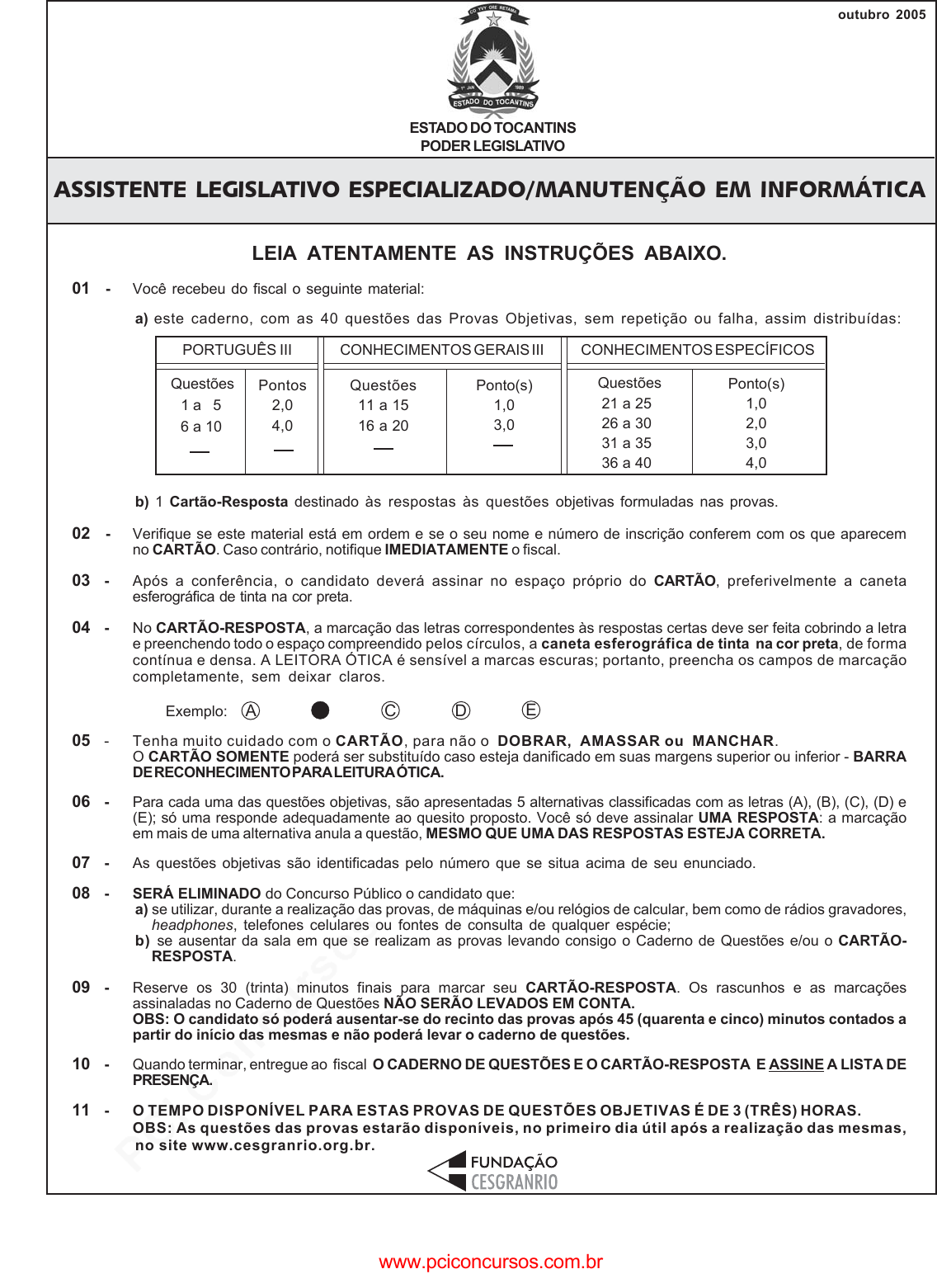 pcimarkpci MDAwMDowMDAwOjAwMDA6MDAwMDowMDAwOmZmZmY6MmQ4YzpjMGE1:U2F0LCAyOCBKdW4gMjAyNSAwOTo0MTowMCAtMDMwMA== www.pciconcursos.com.br outubro 2005 LEIA ATENTAMENTE AS INSTRUÇÕES ABAIXO. 01 - Você recebeu do fiscal o seguinte material: a) este caderno, com as 40 questões das Provas Objetivas, sem repetição ou falha, assim distribuídas: b) 1 Cartão-Resposta destinado às respostas às questões objetivas formuladas nas provas. 02 - Verifique se este material está em ordem e se o seu nome e número de inscrição conferem com os que aparecem no CARTÃO. Caso contrário, notifique IMEDIATAMENTE o fiscal. 03 - Após a conferência, o candidato deverá assinar no espaço próprio do CARTÃO, preferivelmente a caneta esferográfica de tinta na cor preta. 04 - No CARTÃO-RESPOSTA, a marcação das letras correspondentes às respostas certas deve ser feita cobrindo a letra e preenchendo todo o espaço compreendido pelos círculos, a caneta esferográfica de tinta na cor preta, de forma contínua e densa. A LEITORA ÓTICA é sensível a marcas escuras; portanto, preencha os campos de marcação completamente, sem deixar claros. Exemplo: A C D E 05 - Tenha muito cuidado com o CARTÃO, para não o DOBRAR, AMASSAR ou MANCHAR. O CARTÃO SOMENTE poderá ser substituído caso esteja danificado em suas margens superior ou inferior - BARRA DE RECONHECIMENTO PARA LEITURA ÓTICA. 06 - Para cada uma das questões objetivas, são apresentadas 5 alternativas classificadas com as letras (A), (B), (C), (D) e (E); só uma responde adequadamente ao quesito proposto. Você só deve assinalar UMA RESPOSTA: a marcação em mais de uma alternativa anula a questão, MESMO QUE UMA DAS RESPOSTAS ESTEJA CORRETA. 07 - As questões objetivas são identificadas pelo número que se situa acima de seu enunciado. 08 - SERÁ ELIMINADO do Concurso Público o candidato que: a) se utilizar, durante a realização das provas, de máquinas e/ou relógios de calcular, bem como de rádios gravadores, headphones, telefones celulares ou fontes de consulta de qualquer espécie; b) se ausentar da sala em que se realizam as provas levando consigo o Caderno de Questões e/ou o CARTÃO- RESPOSTA. 09 - Reserve os 30 (trinta) minutos finais para marcar seu CARTÃO-RESPOSTA. Os rascunhos e as marcações assinaladas no Caderno de Questões NÃO SERÃO LEVADOS EM CONTA. OBS: O candidato só poderá ausentar-se do recinto das provas após 45 (quarenta e cinco) minutos contados a partir do início das mesmas e não poderá levar o caderno de questões. 10 - Quando terminar, entregue ao fiscal O CADERNO DE QUESTÕES E O CARTÃO-RESPOSTA E ASSINE A LISTA DE PRESENÇA. 11 - O TEMPO DISPONÍVEL PARA ESTAS PROVAS DE QUESTÕES OBJETIVAS É DE 3 (TRÊS) HORAS. OBS: As questões das provas estarão disponíveis, no primeiro dia útil após a realização das mesmas, no site www.cesgranrio.org.br. PORTUGUÊS III Questões 1 a 5 6 a 10 Pontos 2,0 4,0 Questões 11 a 15 16 a 20 Ponto(s) 1,0 3,0 CONHECIMENTOS GERAIS III CONHECIMENTOS ESPECÍFICOS Questões 21 a 25 26 a 30 31 a 35 36 a 40 Ponto(s) 1,0 2,0 3,0 4,0 ESTADO DO TOCANTINS PODER LEGISLATIVO ASSISTENTE LEGISLATIVO ESPECIALIZADO/MANUTENÇÃO EM INFORMÁTICA www.pciconcursos.com.br pcimarkpci MDAwMDowMDAwOjAwMDA6MDAwMDowMDAwOmZmZmY6MmQ4YzpjMGE1:U2F0LCAyOCBKdW4gMjAyNSAwOTo0MTowMCAtMDMwMA== www.pciconcursos.com.br 2 ASSISTENTE LEGISLATIVO ESPECIALIZADO MANUTENÇÃO EM INFORMÁTICA PORTUGUÊS III Texto I Conta-se que, certa vez, ligaram para Brasília uns cientistas americanos intrigados com o que viram em algumas fotos de satélite. Eles queriam saber o que havia na região ao norte do Distrito Federal, porque as imagens mostravam um brilho intenso naquelas coordenadas, algo muito incomum. Bem, esse telefonema pode nem ter ocorrido, mas o certo é que a Chapada dos Veadeiros, a 230 quilômetros de Brasília, está sobre uma das mais generosas jazidas de cristal de que se tem notícia. Os tais cientistas americanos, caso tenham ligado mesmo, não estavam descobrindo nenhuma América, pois durante longo tempo a garimpagem do cristal movimentou a Chapada e seus arredores. Esse minério translúcido servia como matéria-prima para fabricação de componentes eletrônicos e de computador, em vista de sua altíssima condutividade. Com o tempo, os pesquisadores desenvolveram outros materiais em laboratório e o cava-cava acabou. Os místicos falam que há uma gigantesca placa de cristal sob toda a região. E sobre ela, como você pode imaginar, uma gigantesca massa de místicos. Atraídos pela inegável atmosfera divinal da Chapada, que é um manancial de água e luz (a solar, ok?) e com visuais que chamam à contemplação, milhares de terapeutas, psicólogos, massagistas e líderes espirituais se mudaram para lá, o que faz de Alto Paraíso e da vizinha vila de São Jorge um “território alto-astral” de fama internacional. RODRIGUES, Otávio. Viagem, Edição Especial (Ecoturismo) Ed. Abril – Edição 108-A. 1 “Conta-se que, certa vez, ligaram para Brasília uns cientis- tas americanos...” (l. 1-2) De acordo com o texto, pode-se afirmar que esse telefonema: (A) ocorreu, sem dúvida alguma. (B) foi o primeiro de vários sobre o mesmo assunto. (C) pode não ter acontecido. (D) é, com certeza, fruto da imaginação dos cientistas. (E) trouxe muitas novidades para Diamantina. 2 A abundância de cristal está configurada na expressão: (A) brilho intenso. (B) generosas jazidas. (C) minério translúcido. (D) atmosfera divinal. (E) altíssima condutividade. 5 10 15 20 25 3 A garimpagem acabou porque: (A) o turismo tornou-se atividade econômica mais lucrativa. (B) o cristal deixou de ser a matéria-prima de componentes eletrônicos. (C) a região adquiriu fama e prestígio internacional. (D) a exploração descontrolada das minas esgotou as reservas. (E) as reservas minerais atraíram a atenção de cientistas americanos. 4 De acordo com o texto, tanto o garimpo como o turismo mís- tico, atividades