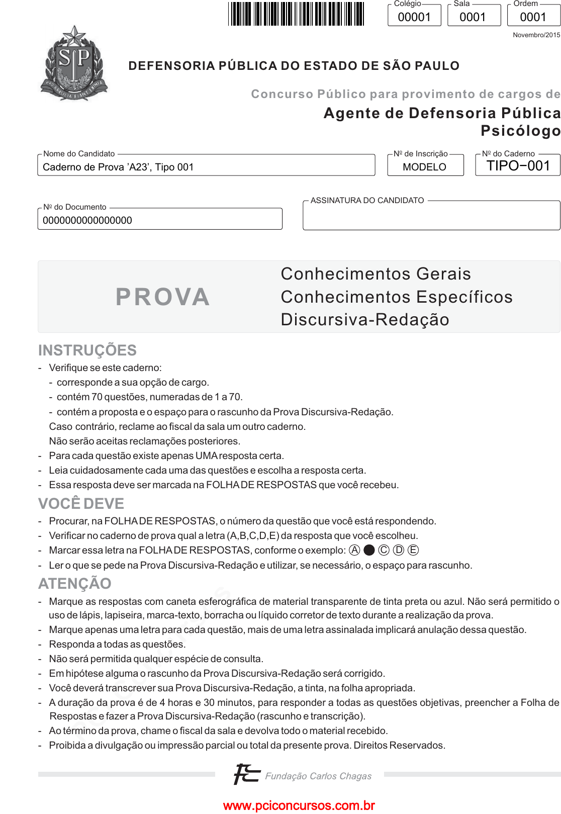 pcimarkpci MjgwNDowZDU1Ojg5ODI6YjUwMDoyMDk0OmI5MzY6MWY0NTphMTUy:U2F0LCAyOCBKdW4gMjAyNSAxNToyNDo1MSAtMDMwMA== www.pciconcursos.com.brwww.pciconcursos.com.br N do CadernooN de Inscriçãoo ASSINATURA DO CANDIDATO N do Documentoo Nome do Candidato Concurso Público para provimento de cargos de DEFENSORIA PÚBLICA DO ESTADO DE SÃO PAULO Novembro/2015 Colégio Sala Ordem PROVA Conhecimentos Gerais Conhecimentos Específicos Discursiva-Redação A C D E INSTRUÇÕES VOCÊ DEVE ATENÇÃO - Verifique se este caderno: - corresponde a sua opção de cargo. - contém 70 questões, numeradas de 1 a 70. - contém a proposta e o espaço para o rascunho da Prova Discursiva-Redação. Caso contrário, reclame ao fiscal da sala um outro caderno. Não serão aceitas reclamações posteriores. - Para cada questão existe apenas UMAresposta certa. - Leia cuidadosamente cada uma das questões e escolha a resposta certa. - Essa resposta deve ser marcada na FOLHADE RESPOSTAS que você recebeu. - Procurar, na FOLHADE RESPOSTAS, o número da questão que você está respondendo. - Verificar no caderno de prova qual a letra (A,B,C,D,E) da resposta que você escolheu. - Marcar essa letra na FOLHADE RESPOSTAS, conforme o exemplo: - Ler o que se pede na Prova Discursiva-Redação e utilizar, se necessário, o espaço para rascunho. - Marque as respostas com caneta esferográfica de material transparente de tinta preta ou azul. Não será permitido o uso de lápis, lapiseira, marca-texto, borracha ou líquido corretor de texto durante a realização da prova. - Marque apenas uma letra para cada questão, mais de uma letra assinalada implicará anulação dessa questão. - Responda a todas as questões. - Não será permitida qualquer espécie de consulta. - Em hipótese alguma o rascunho da Prova Discursiva-Redação será corrigido. - Você deverá transcrever sua Prova Discursiva-Redação, a tinta, na folha apropriada. - A duração da prova é de 4 horas e 30 minutos, para responder a todas as questões objetivas, preencher a Folha de Respostas e fazer a Prova Discursiva-Redação (rascunho e transcrição). - Ao término da prova, chame o fiscal da sala e devolva todo o material recebido. - Proibida a divulgação ou impressão parcial ou total da presente prova. Direitos Reservados. Agente de Defensoria Pública Psicólogo Caderno de Prova ’A23’, Tipo 001 MODELO 0000000000000000 TIPO−001 00001 0001 0001 pcimarkpci MjgwNDowZDU1Ojg5ODI6YjUwMDoyMDk0OmI5MzY6MWY0NTphMTUy:U2F0LCAyOCBKdW4gMjAyNSAxNToyNDo1MSAtMDMwMA== www.pciconcursos.com.brwww.pciconcursos.com.br 2 DPSPD-Conhecimentos Gerais1 CONHECIMENTOS GERAIS Língua Portuguesa Atenção: Para responder às questões de números 1 a 8, considere o texto abaixo. Em defesa da dúvida Numa época em que tantos parecem ter tanta certeza sobre tudo, vale a pena pensar no prestígio que a dúvida já teve. Nos diálogos de Platão, seu amigo Sócrates pulveriza a certeza absoluta de seus contendores abalando-a por meio de sucessivas perguntas, que os acabam convencendo da fragilidade de suas convicções. Séculos mais tarde, o filósofo Descartes ponderou que o maior estímulo para se instituir um método de conhecimento é considerar a presença desafiadora da dúvida, como um primeiro passo. Lendo os jornais e revistas de hoje, assistindo na TV a entrevistas de personalidades, o que não falta são especialistas infalíveis em todos os assuntos, na política, na ciência, na economia, nas artes. Todos têm receitas imediatas e seguras para a solução de todos os problemas. A hesitação, a dúvida, o tempo para reflexão são interpretados como incompetência, passividade, absenteísmo. É como se a velocidade tecnológica, que dá o ritmo aos nossos novos hábitos, também ditasse a urgência de constituirmos nossas certezas. A dúvida corresponde ao nosso direito de suspender a verdade ilusória das aparências e buscar a verdade funda daquilo que não aparece. Julgar um fato pelo que dele diz um jornal, avaliar um problema pelo ângulo estrito dos que nele estão envolvidos é submeter-se à força de valores já estabelecidos, que deixamos de investigar. A dúvida supõe a necessidade que tem a consciência de se afastar dos julgamentos já produzidos, permitindo-se, assim, o tempo necessário para o exame mais detido da matéria a ser analisada. A dúvida pode ser o primeiro passo para o caminho das afirmações que acabam sendo as mais seguras, porque mais refletidas e devidamente questionadas. (Cássio da Silveira, inédito) 1. A valorização da dúvida se deve ao fato de que ela (A) constitui o meio pelo qual se empreende uma contestação ilusória de verdades dadas como irrefutáveis. (B) vale-se astutamente de sua fragilidade como método para poder impor algumas verdades definitivas. (C) permite abrir um caminho para o conhecimento ao questionar verdades dadas como absolutas. (D) contribui para a valorização de verdades pré-estabelecidas por métodos seguros de conhecimento. (E) implica a tentativa de se chegar a um tipo de conhecimento cuja validade dispensa qualquer comprovação. 2. Diferentemente da maneira pela qual Sócrates e Descartes qualificavam a dúvida, o texto nos lembra que há (A) quem pulverize a certeza inabalável com que alguns afirmam seus pontos de vista, juízos e convicções. (B) aqueles que já de saída se apresentam como especialistas infalíveis em temas da política, da ciência, das artes. (C) aquele que se dispõe a se pronunciar sobre algum assunto depois de ter aberto várias hipóteses de abordagem. (D) quem sempre suspenda a verdade das aparências, não se furtando a questioná-las antes de aceitá-las. (E) quem se afaste de julgamentos definitivos para se deter sobre o que há de problemático numa matéria. 3. Considere as afirmações abaixo. I. Da leitura do 1 o parágrafo pode-se deduzir que o método de conhecimento no qual a dúvida exerce um papel importante passou a ser mais reconhecido e utilizado