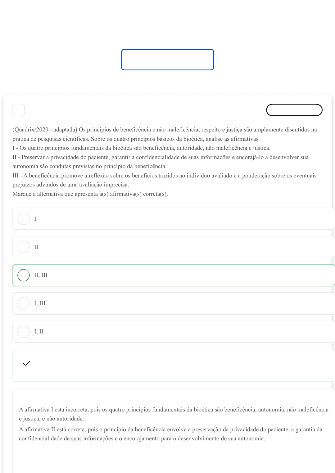 Você acertou 8 de 10 questões Verifique o seu desempenho e continue treinando! Você pode refazer o exercício quantas vezes quiser. Verificar Desempenho A B C D E 1 Marcar para revisão (Quadrix/2020 - adaptada) Os princípios de beneficência e não maleficência, respeito e justiça são amplamente discutidos na prática de pesquisas científicas. Sobre os quatro princípios básicos da bioética, analise as afirmativas. I - Os quatro princípios fundamentais da bioética são beneficência, autoridade, não maleficência e justiça. II - Preservar a privacidade do paciente, garantir a confidencialidade de suas informações e encorajá-lo a desenvolver sua autonomia são condutas previstas no princípio da beneficência. III - A beneficência promove a reflexão sobre os benefícios trazidos ao indivíduo avaliado e a ponderação sobre os eventuais prejuízos advindos de uma avaliação imprecisa. Marque a alternativa que apresenta a(s) afirmativa(s) correta(s). I II II, III I, III I, II Resposta correta Parabéns, você selecionou a alternativa correta. Confira o gabarito comentado! Gabarito Comentado A afirmativa I está incorreta, pois os quatro princípios fundamentais da bioética são beneficência, autonomia, não maleficência e justiça, e não autoridade. A afirmativa II está correta, pois o princípio da beneficência envolve a preservação da privacidade do paciente, a garantia da confidencialidade de suas informações e o encorajamento para o desenvolvimento de sua autonomia. 26/06/2025, 19:40 estacio.saladeavaliacoes.com.br/exercicio/685dc90b8131b5fe4ba6fb22/gabarito/ https://estacio.saladeavaliacoes.com.br/exercicio/685dc90b8131b5fe4ba6fb22/gabarito/ 1/9 A B C D E A afirmativa III também está correta, pois a beneficência promove a reflexão sobre os benefícios trazidos ao indivíduo avaliado e a ponderação sobre os eventuais prejuízos advindos de uma avaliação imprecisa. 2 Marcar para revisão A bioética é um campo interdisciplinar que aborda questões éticas, filosóficas e jurídicas relacionadas às ciências da vida e à saúde. A Bioética pode ser definida como padrão de moral e bons costumes. princípios éticos, de um estudo organizado da conduta humana. agir com maleficência e não se precaver. agir de forma ética apenas na profissão. forma de agir perante a população. Resposta correta Parabéns, você selecionou a alternativa correta. Confira o gabarito comentado! Gabarito Comentado Para a ética, a vida é uma teia, onde todos os fios são importantes, inseparáveis e coprodutores uns dos outros. Portanto, agir com ética é prezar pela saúde e pela vida do próximo, não esquecendo que você, enquanto profissional, também é humano, que passa por adversidades todos os dias, mas você escolheu como profissão o cuidar. É por isso que você precisa estar atento à manutenção de uma postura consciente, solidária e responsável. 3 Marcar para revisão (CESPE / CEBRASPE/2006 - adaptada) A ética deve ser universal e envolver a todos. Deve explicar as formas morais de modo objetivo e racional. A respeito da palavra ética, julgue as asserções I e II. I - A palavra "ética" é derivada do grego ethos e significa "modo de ser" ou "conduta". Porque II - A ética implica, necessariamente, um juízo de valor sobre os desvios atávicos da conduta do homem em sociedade. Marque a alternativa que apresenta a relação correta entre as asserções I e II. 26/06/2025, 19:40 estacio.saladeavaliacoes.com.br/exercicio/685dc90b8131b5fe4ba6fb22/gabarito/ https://estacio.saladeavaliacoes.com.br/exercicio/685dc90b8131b5fe4ba6fb22/gabarito/ 2/9 A B C D E A B C As asserções I e II são verdadeiras e a asserção II é uma justificativa para a asserção I. As asserções I e II são verdadeiras, mas a asserção II não é uma justificativa para a asserção I. A asserção I é verdadeira e a asserção II é falsa. A asserção I é falsa e a asserção II é verdadeira. As asserções I e II são falsas. Resposta correta Parabéns, você selecionou a alternativa correta. Confira o gabarito comentado! Gabarito Comentado A palavra "ética" realmente tem origem no termo grego ethos, que significa "modo de ser" ou "conduta". Portanto, a asserção I está correta. No entanto, a asserção II está incorreta. A ética não implica necessariamente um juízo de valor sobre os desvios atávicos da conduta do homem em sociedade. A ética é um campo de estudo que se preocupa com o que é moralmente bom ou mau, certo ou errado. Ela não se limita a julgar os desvios de conduta, mas busca entender e explicar as razões por trás das ações humanas. 4 Marcar para revisão (CESPE / CEBRASPE/2006 - adaptada) A ética ocupa-se basicamente de questões objetivas, concretas e essencialmente de interesse coletivo. Sobre a diferença entre ética e moral, analise as afirmativas abaixo. I - A ética é permanente enquanto a moral varia de acordo com a cultura. II - A ética tem origem na cultura e a moral varia de acordo com a cultura. III - A ética explica a moral de forma racional e a moral é algo de ordem prática. Marque a alternativa que apresenta a(s) afirmativa(s) correta(s). I II II, III 26/06/2025, 19:40 estacio.saladeavaliacoes.com.br/exercicio/685dc90b8131b5fe4ba6fb22/gabarito/ https://estacio.saladeavaliacoes.com.br/exercicio/685dc90b8131b5fe4ba6fb22/gabarito/ 3/9 D E A B C D E I, III III Resposta correta Parabéns, você selecionou a alternativa correta. Confira o gabarito comentado! Gabarito Comentado A afirmativa I está correta, pois a ética, de fato, é um conjunto de princípios universais e permanentes que guiam o comportamento humano, enquanto a moral pode variar de acordo com a cultura, o tempo e o espaço. Já a afirmativa III também está correta, pois a ética busca explicar e justificar a moral de forma racional, enquanto a moral se refere a normas, valores e comportamentos considerados corretos ou errados em uma determinada sociedade, 