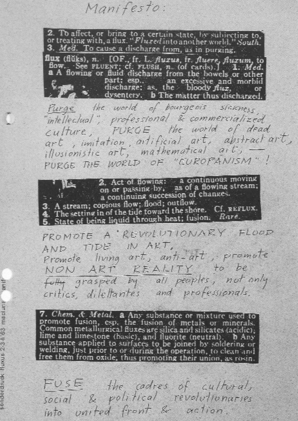 ZaniniGeorge Maciunas, Manifesto Fluxus, 1963* 11 Com fontes complexas e principais no futurismo italiano, em Dada (Marcel Duchamp, essencialmente) e surrealismo, no construtivismo soviético da “Levyj front iskusstv” (LEF) (“Frente de Esquerda das Artes”), em Erik Satie e John Cage, na filosofia Zen, a que se juntam os estímulos protoconceituais de Yves Klein - o Grupo Fluxus configurou-se como uma comunidade informal de músicos, artistas plásticos e poetas radicalmente contrários ao status quo da arte. Não obstante ainda hoje atraia detratores, a alternativa anticulto que o movimento revelou nos inícios da década de 1960 foi altamente contagiante, recebendo, em sua trajetória, consciente ou inconscientemente, o acatamento de múltiplos artistas espalhados pelo mundo. O debate sobre suas idéias não cessou quarenta anos depois e seqüências fluxistas são admitidas na arte mais atual. As várias heranças do grupo são notórias: quanto ao futurismo, o rela- cionamento das dimensões que separavam ancestralmente a arte da vida e a orientação para a síntese das artes; no que concerne a Dada, o seu choque com os dominantes hábitos da sociedade burguesa, em insólitos caminhos de liber- dade, a partir de demolidora filosofia anárquica, tendo Duchamp como guia conceitual; no que diz respeito ao construtivismo pós-revolucionário do grupo fundado por Vladimir Maiakovski em 1923 (dissolvido em 1925 e restaurado em 1927), a linha ideológica de uma criação coletiva. Somavam-se as incidên- cias posteriores e de forma notável a do ensinamento do indeterminismo e do acaso de John Cage em Black Mountain College e na New School of Social Research de Nova Iorque, assim como a influência da austeridade zen, central ao compositor. Prefigurando-se no final dos anos 50 e com um período de atuação de maior proeminência na contribuição às grandes transformações da arte que ocorrem nos anos 60 - concomitante a outros movimentos como Pop Art, Nouveau Réalisme e Internationale Situationniste, e antecipando-se ao mini- malismo e conceitualismo - foram essenciais a Fluxus os princípios de George Maciunas1 - aos quais não faltaram freqüentes contestações - mas que, de uma forma ou outra, receberam sustentação. A capacidade que demonstrou na orga- nização das atividades do grupo, por sua vez, foi comparada à de Sergei Diaghilev, o empresário dos Ballets Russos2. Sua atuação, ao lado de fortes e decisivas presenças solidárias, por entre efêmeras adesões, estendeu-se pelo decênio seguinte sem a intensidade anterior, até a sua morte em 1978, quando Fluxus ingressava em uma outra fase. O que George Maciunas pretendia, acima de tudo, na atmosfera poéti- ca do trabalho de que foi iniciador, era uma arte feita de simplicidade, antiinte- Walter Zanini AA AATTUUAALLIIDDAADDEE DDEE FFLLUUXXUUSS 1. KIRKEBY, Per. “George Maciunas, 1981”. In HENDRICKS, Jon (org.). O que é Fluxus? O que não é! O porquê. (What’s Fluxus? What’s Not! Why). Brasília, Rio de Janeiro: Centro Cultural Banco do Brasil / Detroit: The Gilbert and Lila Silverman Fluxus Collection Foundation, 2002, p. 129. 2. PINCUS-WITTEN, Robert. “An Introduction”. In HENDRICKS, Jon. Fluxus Codex. Nova Iorque: The Gilbert and Lila Silverman Fluxus Collection Foundation/ Harry Abrams, 1988, p.16. ZaniniGeorge Maciunas, Manifesto Fluxus, 1963* 11 Com fontes complexas e principais no futurismo italiano, em Dada (Marcel Duchamp, essencialmente) e surrealismo, no construtivismo soviético da “Levyj front iskusstv” (LEF) (“Frente de Esquerda das Artes”), em Erik Satie e John Cage, na filosofia Zen, a que se juntam os estímulos protoconceituais de Yves Klein - o Grupo Fluxus configurou-se como uma comunidade informal de músicos, artistas plásticos e poetas radicalmente contrários ao status quo da arte. Não obstante ainda hoje atraia detratores, a alternativa anticulto que o movimento revelou nos inícios da década de 1960 foi altamente contagiante, recebendo, em sua trajetória, consciente ou inconscientemente, o acatamento de múltiplos artistas espalhados pelo mundo. O debate sobre suas idéias não cessou quarenta anos depois e seqüências fluxistas são admitidas na arte mais atual. As várias heranças do grupo são notórias: quanto ao futurismo, o rela- cionamento das dimensões que separavam ancestralmente a arte da vida e a orientação para a síntese das artes; no que concerne a Dada, o seu choque com os dominantes hábitos da sociedade burguesa, em insólitos caminhos de liber- dade, a partir de demolidora filosofia anárquica, tendo Duchamp como guia conceitual; no que diz respeito ao construtivismo pós-revolucionário do grupo fundado por Vladimir Maiakovski em 1923 (dissolvido em 1925 e restaurado em 1927), a linha ideológica de uma criação coletiva. Somavam-se as incidên- cias posteriores e de forma notável a do ensinamento do indeterminismo e do acaso de John Cage em Black Mountain College e na New School of Social Research de Nova Iorque, assim como a influência da austeridade zen, central ao compositor. Prefigurando-se no final dos anos 50 e com um período de atuação de maior proeminência na contribuição às grandes transformações da arte que ocorrem nos anos 60 - concomitante a outros movimentos como Pop Art, Nouveau Réalisme e Internationale Situationniste, e antecipando-se ao mini- malismo e conceitualismo - foram essenciais a Fluxus os princípios de George Maciunas1 - aos quais não faltaram freqüentes contestações - mas que, de uma forma ou outra, receberam sustentação. A capacidade que demonstrou na orga- nização das atividades do grupo, por sua vez, foi comparada à de Sergei Diaghilev, o empresário dos Ballets Russos2. Sua atuação, ao lado de fortes e decisivas presenças solidárias, por entre efêmeras adesões, estendeu-se pelo decênio seguinte sem a intensidade anterior, até a sua morte em 1978, quando Fluxus ingressava em uma 