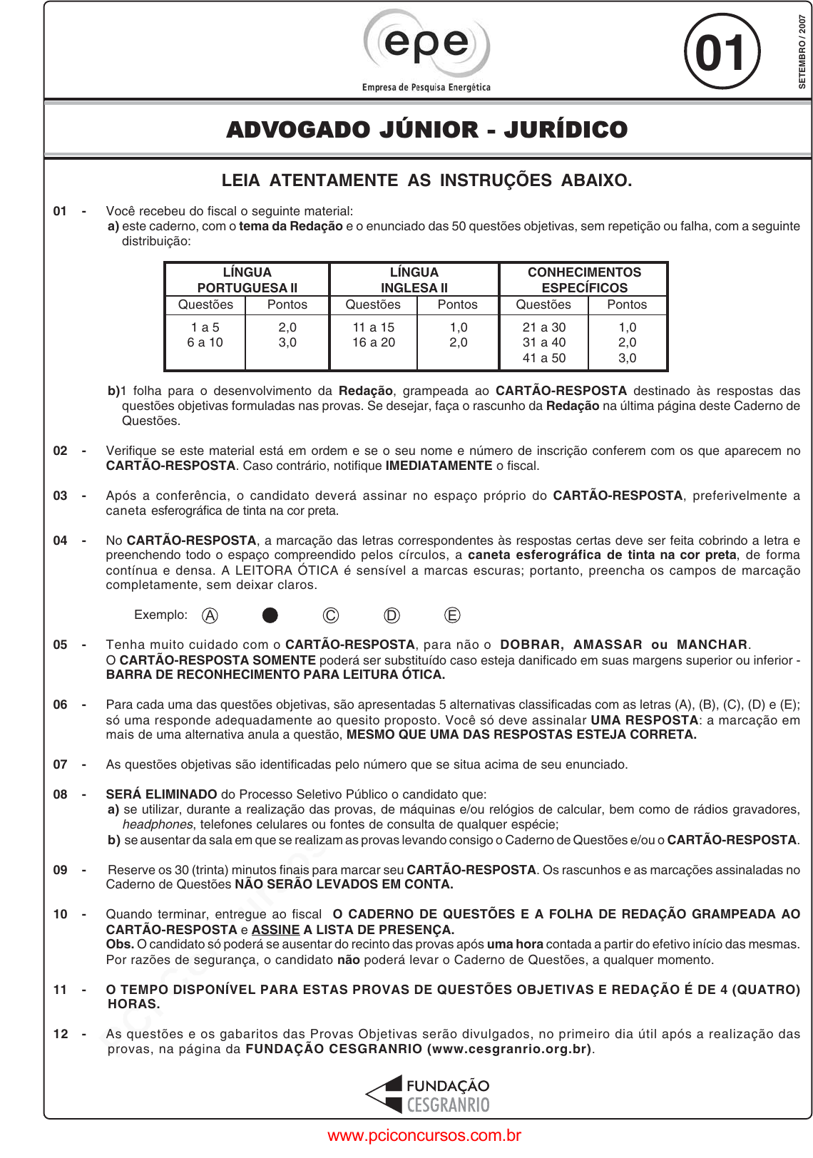 pcimarkpci MDAwMDowMDAwOjAwMDA6MDAwMDowMDAwOmZmZmY6OTU0ZTpiYjcw:RnJpLCAyNyBKdW4gMjAyNSAxMToxMTo0MSAtMDMwMA== www.pciconcursos.com.br 01 ADVOGADO JÚNIOR - JURÍDICO S E T E M B R O / 20 07 LEIA ATENTAMENTE AS INSTRUÇÕES ABAIXO. 01 - Você recebeu do fiscal o seguinte material: a) este caderno, com o tema da Redação e o enunciado das 50 questões objetivas, sem repetição ou falha, com a seguinte distribuição: b)1 folha para o desenvolvimento da Redação, grampeada ao CARTÃO-RESPOSTA destinado às respostas das questões objetivas formuladas nas provas. Se desejar, faça o rascunho da Redação na última página deste Caderno de Questões. 02 - Verifique se este material está em ordem e se o seu nome e número de inscrição conferem com os que aparecem no CARTÃO-RESPOSTA. Caso contrário, notifique IMEDIATAMENTE o fiscal. 03 - Após a conferência, o candidato deverá assinar no espaço próprio do CARTÃO-RESPOSTA, preferivelmente a caneta esferográfica de tinta na cor preta. 04 - No CARTÃO-RESPOSTA, a marcação das letras correspondentes às respostas certas deve ser feita cobrindo a letra e preenchendo todo o espaço compreendido pelos círculos, a caneta esferográfica de tinta na cor preta, de forma contínua e densa. A LEITORA ÓTICA é sensível a marcas escuras; portanto, preencha os campos de marcação completamente, sem deixar claros. Exemplo: 05 - Tenha muito cuidado com o CARTÃO-RESPOSTA, para não o DOBRAR, AMASSAR ou MANCHAR. O CARTÃO-RESPOSTA SOMENTE poderá ser substituído caso esteja danificado em suas margens superior ou inferior - BARRA DE RECONHECIMENTO PARA LEITURA ÓTICA. 06 - Para cada uma das questões objetivas, são apresentadas 5 alternativas classificadas com as letras (A), (B), (C), (D) e (E); só uma responde adequadamente ao quesito proposto. Você só deve assinalar UMA RESPOSTA: a marcação em mais de uma alternativa anula a questão, MESMO QUE UMA DAS RESPOSTAS ESTEJA CORRETA. 07 - As questões objetivas são identificadas pelo número que se situa acima de seu enunciado. 08 - SERÁ ELIMINADO do Processo Seletivo Público o candidato que: a) se utilizar, durante a realização das provas, de máquinas e/ou relógios de calcular, bem como de rádios gravadores, headphones, telefones celulares ou fontes de consulta de qualquer espécie; b) se ausentar da sala em que se realizam as provas levando consigo o Caderno de Questões e/ou o CARTÃO-RESPOSTA. 09 - Reserve os 30 (trinta) minutos finais para marcar seu CARTÃO-RESPOSTA. Os rascunhos e as marcações assinaladas no Caderno de Questões NÃO SERÃO LEVADOS EM CONTA. 10 - Quando terminar, entregue ao fiscal O CADERNO DE QUESTÕES E A FOLHA DE REDAÇÃO GRAMPEADA AO CARTÃO-RESPOSTA e ASSINE A LISTA DE PRESENÇA. Obs. O candidato só poderá se ausentar do recinto das provas após uma hora contada a partir do efetivo início das mesmas. Por razões de segurança, o candidato não poderá levar o Caderno de Questões, a qualquer momento. 11 - O TEMPO DISPONÍVEL PARA ESTAS PROVAS DE QUESTÕES OBJETIVAS E REDAÇÃO É DE 4 (QUATRO) HORAS. 12 - As questões e os gabaritos das Provas Objetivas serão divulgados, no primeiro dia útil após a realização das provas, na página da FUNDAÇÃO CESGRANRIO (www.cesgranrio.org.br). A C D E LÍNGUA PORTUGUESA II LÍNGUA INGLESA II CONHECIMENTOS ESPECÍFICOS Questões Pontos Questões Pontos Questões Pontos 1 a 5 6 a 10 2,0 3,0 11 a 15 16 a 20 1,0 2,0 21 a 30 31 a 40 41 a 50 1,0 2,0 3,0 www.pciconcursos.com.br pcimarkpci MDAwMDowMDAwOjAwMDA6MDAwMDowMDAwOmZmZmY6OTU0ZTpiYjcw:RnJpLCAyNyBKdW4gMjAyNSAxMToxMTo0MSAtMDMwMA== www.pciconcursos.com.br 2 ADVOGADO JÚNIOR JURÍDICO R E D A Ç Ã O Afinal, qual é o verdadeiro patrimônio do Brasil? Os economistas dizem ser nossas empresas, bancos, força de trabalho, produto interno bruto. Os ecologistas apontam para a Floresta Amazônica, a Mata Atlântica, praias, rios e mares. Os arquitetos, para nossas igrejas, cidades, patrimônio histórico, de Olinda a Brasília. Todos estão certos. Mas nosso patrimônio é mais. Não é apenas o que temos e possuímos. Como diz o samba: “A vida não é só isso que se vê. É um pouco mais. Que os olhos não conseguem perceber Que as mãos não ousam tocar Que os pés recusam pisar.” FALCÃO, Joaquim. 2000. Com base no texto acima, redija um texto dissertativo sobre o tema A verdadeira riqueza do homem no século XXI, segundo o seu ponto de vista. Construa o seu texto em prosa, com o mínimo de 20 e o máximo de 25 linhas. Dê um título à sua redação, que deve ser escrita a caneta esferográfica de tinta na cor preta (ou azul). www.pciconcursos.com.br pcimarkpci MDAwMDowMDAwOjAwMDA6MDAwMDowMDAwOmZmZmY6OTU0ZTpiYjcw:RnJpLCAyNyBKdW4gMjAyNSAxMToxMTo0MSAtMDMwMA== www.pciconcursos.com.br 3 ADVOGADO JÚNIOR JURÍDICO LÍNGUA PORTUGUESA II RECOMEÇAR! “Começar de novo, e contar “comigo”, vai valer a pena, ter amanhecido...” *Ivan Lins* 5 10 Ter coragem de recomeçar a cada vez...fácil de dizer, difícil de fazer. Todas as manhãs pelo mundo afora, pessoas acordam com essa meta, esse desejo de recomeço, enfrentando o dilema: Por onde e como encontrar forças pra recomeçar. É preciso enlaçar as tristezas, num laço apertado, e jogá-las no desfiladeiro, que só tem o eco como companheiro. É preciso enfrentar o inimigo maior, nosso eu interior, e torná-lo nosso cúmplice. É preciso que nos tornemos perdoadores de nós mesmos. Nosso eu é nosso carrasco maior, na maioria das vezes. Ninguém nos poderá ajudar nessa tarefa! É uma incumbência que só podemos delegar a nós mesmos. É preciso achar o trilho perdido, nesta nossa vidinha de cada dia, de estradas nem sempre tão planas, nem sempre bem sinalizadas, que se repartem em múltiplos caminhos sem setas de chegada. É necessário, muitas vezes, juntar os cacos partidos de um coração que de alguma forma foi estraçalhado. Abrir a janela e perceber que o sol brilha a cada manhã, não apenas por no