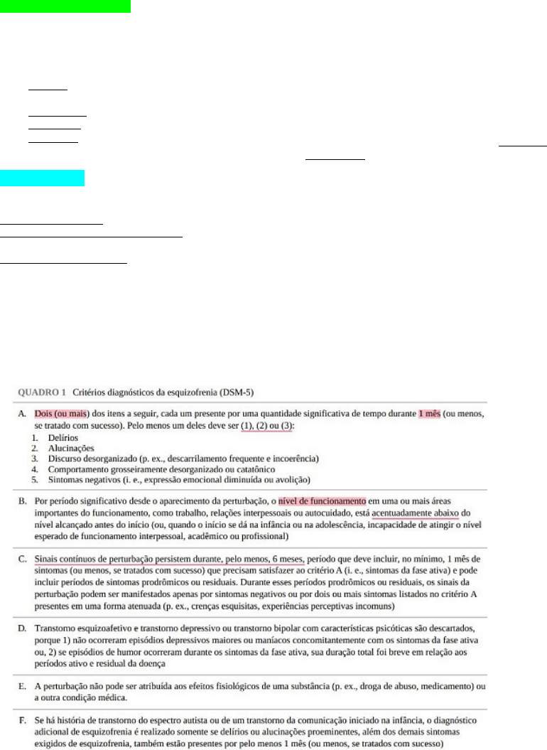 ☼Transtornos psicóticos☼ ●Psicose: distorções do: pensamento, sensopercepção, emoções, linguagem, sentimento do eu e comportamento ●Esquizofrenia o mais frequente destes transtornos ●transtornos psicóticos. Divididos em: Afetivos: ocorrem como manifestações de depressão maior e transtorno bipolar Não afetivos: esquizofrenia e outros. Funcionais (transtornos psiquiátricos). Orgânicos (secundários a problemas médicos não psiquiátricos) Esquizofrenia - mínimo de 1 mês ●Pico: M (risco ⬆) 15 e 25 | F 25 e 35 anos ●Causas: herdabilidade genética 60%.. 85% das pessoas com esquizofrenia não têm parentes de 1º grau com a doença. Fatores de risco ambientais: eventos pré-natais (hipóxia, infecção materna, estresse e má nutrição materna) e complicações obstétricas, adversidades precoces (negligência, abuso físico e/ou sexual na infância), uso de maconha na adolescência e situação de vulnerabilidade social (estresse psicológico relacionado a discriminação e exclusão social). Critérios Diagnósticos esquizofrenia: Exames complementares: neuroimagem de crânio (preferencialmente ressonância magnética), hemograma completo, função e marcadores hepáticos e pancreáticos, função renal e eletrólitos, função tireoidiana, sorologias para HIV, sífilis e hepatites e vitaminas (B12 e ácido fólico). Também é frequente solicitar exame toxicológico (maconha, cocaína/crack, metanfetaminas, LSD) e teste de gravidez ●Mecanismo: Multifatorial: Fatores genéticos e ambientais causam mudanças no desenvolvimento cerebral e desequilíbrios entre danos e reparação celular ao longo da vida. - Neuroimagem afetada: regiões/sistemas frontotemporoestriatais (não é patognomônico) 👉 Apresentam uma desregulação da liberação de dopamina por neurônios dopaminérgicos da via mesolímbica (que tem origem no mesencéfalo e termina no núcleo accumbens. Justifica →(delírios e alucinações) mas desconhecido o pq. 👉Via hipotálamo à hipófise. Quando os receptores de dopamina nesta glândula são bloqueados, a produção/liberação de prolactina aumenta. 👉 Via da substância negra ao núcleo estriado dorsal. Pode causar sintomas motores, como parkinsonismo e distonias agudas quando bloqueadas. ●Sintomas das Psicoses: - Sintomas positivos (ou psicóticos), como alucinações e delírios. - Sintomas negativos, como embotamento afetivo e empobrecimento volitivo. - Alterações neurocognitivas, como déficits de memória, atenção e funções executivas. - Desorganização do pensamento e do comportamento. - Sintomas afetivos, como humor depressivo ou eufórico. Tratamento ●antipsicótico de primeira linha em monoterapia ●preferência: antipsicóticos de 2ª geração Monitoração de resposta e ajuste de dose a cada 2 a 4 semanas ● Antipsicóticos de 1ª geração: ○ clorpromazina (100 a 1.000mg/dia), ○ haloperidol (5 a 10 mg/dia), ○ levomepromazina (100 a 1.000 mg/dia) e ○ trifluoperazina (5 a 20 mg/dia) síndromes extrapiramidais ● Antipsicóticos de 2ª geração: ○ risperidona (2 a 8 mg/dia), ○ olanzapina (10 a 30 mg/dia), ○ quetiapina (300 a 800 mg/dia), ○ aripiprazol (10 a 30 mg/dia), ○ amisulprida (200 a 1.200 mg/dia), ○ ziprasidona (120 a 160 mg/dia), ○ asenapina (40 a 160 mg/dia) e ○ clozapina (100 a 800 mg/dia) Ganho de peso e síndrome metabólica, por ventura Sin.extrap tbm. Obs: Todos antipsicóticos podem gerar alargamento do intervalo QTc. Neutropenia e agranulocitose: tipicamente a clozapina Exames de acompanhamento: perfil metabólico (glicemia de jejum, hemoglobina glicada, colesterol total e frações, triglicerídios) e eletrocardiografia, além de medidas de peso, pressão arterial e de circunferência abdominal Obs.: repetir a cada 6-12 meses. Falha de 2 antipsicóticos? (4 a 6 semanas) – REFRATÁRIO. ●Clozapina - monitoração com hemogramas (semanais por 6 meses, depois quinzenais por mais 6 meses e indefinidamente depois disso, com hemogramas mensais) - Mais eficaz em pacientes com esquizofrenia que apresentam risco de suicídio e/ou de heteroagressividade persistentes 👇👇👇👇👇👇👇👇👇👇 Falha ou contraindicação de clozapina? - eletroconvulsoterapia - ou a associação de outro antipsicótico - ou de lamotrigina à clozapina. Manutenção: Manter dose e ficar por 1 ano Dificuldades persistentes com adesão? Pensar usar medicações de depósito: ○ intramuscular quinzenal (risperidona) ○ haloperidol decanoato (mensal) ○ paliperidona (mensal) Transtorno Delirante Persistente image4.png image1.png image2.png image3.png