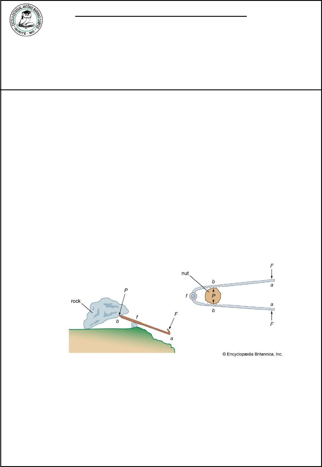 ESCOLA ESTADUAL ANTÔNIO MARINHO CAMPOS Rua Geraldo Pedro de Moraes, 220 – Monsenhor Horta – Ibirité FÍSICA 1° ano – Ensino Médio Professor: Diego França Máquinas Simples As máquinas simples são dispositivos que trouxeram grandes avanços para a humanidade e se tornaram base para todas as demais máquinas (menos ou mais complexas) criadas ao longo da história. São capazes de alterar forças (em direção, sentido ou módulo). Em toda máquina simples, estão associados três elementos: 1) Força potente ou potência (P) – Força capaz de produzir ou acelerar o movimento; 2) Força resistente ou resistência (R) – Força capaz de se opor ao movimento; 3) Elemento de ligação entre potência e resistência. Pode ser um ponto fixo, um eixo ou um plano. • Alavanca – usada para erguer ou deslocar um objeto, multiplicando-se a força aplicada. Figura 1 - Fonte: Encyclopaedia Britannica • Plano inclinado – usado para se empurrar um objeto para um ponto mais alto usando-se menos força. Figura 2 - Fonte: Encyclopaedia Britannica • Polia ou roldana – dispositivo que, com o auxílio de uma corda, é usado para mudar a direção ou o sentido de uma força. Figura 3 - Fonte: Encyclopaedia Brittanica • Cunha – dispositivo usado para dividir um objeto. Figura 4 - Fonte: Encyclopaedia Britannica • Parafuso – usado para fixar duas peças ou transmitir movimentos. Figura 5 - Fonte: Encyclopaedia Britannica • Roda e eixo – a roda é um objeto cilíndrico que gira em torno do eixo. O conjunto pode ser usado para transferir movimentos, mudar velocidade, mudar força. Figura 6 - Fonte: Encyclopaedia Britannica Referências: Amanda. [s.d.] “Máquinas Simples”. Apresentação. Física. Universidade Federal do Recôncavo da Bahia. Disponível em: https://www.ufrb.edu.br/pibid/documentos/category/72- apresentacoes?download=303:top-14-maq-simples-amanda&start=20. Acesso em 16 mar. 2025. SIMPLE machine. In: Encyclopaedia Britannica. [S. l.], 15 fev. 2025. Disponível em: https://www.britannica.com/technology/simple-machine. Acesso em: 16 mar. 2025.