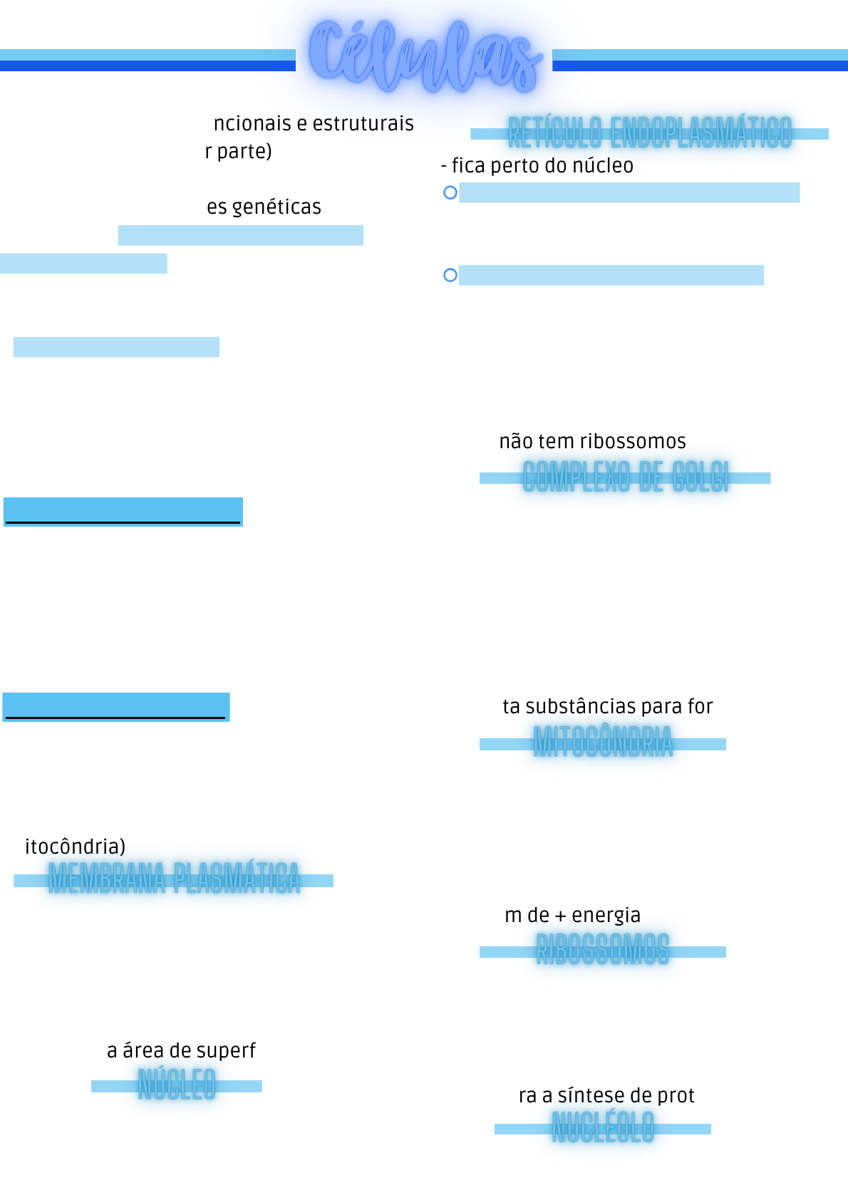 - fica perto do núcleo CÉLULA PROCARIONTE - menores unidades funcionais e estruturais dos seres vivos (menor parte) - unidade básica - carregam informações genéticas - podem ser procarionte ou eucarionte e animal ou vegetal ↳ tem citoplasma, membrana plasmática e ribossomos em comum - principais estruturas: núcleo, membrana plasmática e as organelas - um aglomerado de células forma tecido - a junção de tecidos origina o órgão - o conjunto de órgãos forma um sistema - os sistemas formam o corpo Células - não tem núcleo (membrana nuclear) ↳ material genético no citoplasma - não tem organelas membranosas (retículo endoplasmático, complexo de golgi, mitocôndria) - exemplo: bactérias CÉLULA EUCARIONTE - tem núcleo (membrana nuclear) ↳ material genético no núcleo - tem organelas membranosas (retículo endoplasmático, complexo de golgi, mitocôndria) - mosaico fluido - bicamada lipídica (parte hidrofílica e hidrofóbica) - fosfolipídeo, glicolipídeos e esteróis - transporte passivo e ativo - aumenta a área de superfície da célula MEMBRANA PLASMÁTICA NÚCLEO - onde fica o material genético (eucariontes) - onde acontece síntese da maior parte do DNA e RNA e tem informações genéticas RETÍCULO ENDOPLASMÁTICO RETÍCULO ENDOPLASMÁTICO RUGOSO ↳ síntese de proteínas ↳ tem ribossomos RETÍCULO ENDOPLASMÁTICO LISO ↳ síntese de lipídios ↳ síntese de hormônios e esteróis ↳ metabolismo de carboidratos ↳ inativação de substâncias tóxicas ↳ desintoxicação do organismo ↳ não tem ribossomos COMPLEXO DE GOLGI - secreção de proteínas - ¨detalhe¨, ¨finalização¨, ¨acabamento¨ - glicosilação (reações que ligam açúcares a outros componentes celulares) - armazena, empacota e transforma as moléculas produzidas pela célula - forma lisossomos - secreta substâncias para fora MITOCÔNDRIA - geração de energia (ATP) - usam O2 e liberam CO2 - tem DNA próprio - faz respiração - está mais presente nos locais que precisam de + energia RIBOSSOMOS - pequenas granulações livres no citoplasma ou juntas no RER - tem bastante RNA - decodifica as mensagens contidas no RNAm para a síntese de proteínas NUCLÉOLO - responsável pela produção de ribossomos - essencial na síntese de proteínas MICROTÚBULOS - exerce função esquelética - auxilia na manutenção da forma da célula CENTRÍOLOS - responsáveis pela formação dos cílios e flagelos - responsáveis pela organização do fuso acromático durante a divisão celular LISOSSOMOS - atuam em ph mais ácido - responsáveis pela digestão intracelular - podem destruir as células desgastadas para reciclá-las ou destruir completamente PEROXISSOMOS - tem função de degradação de água oxigenada e álcool - oxida substâncias orgânicas - precisa de muito O2, mas não produzem ATP CITOPLASMA - formado por um líquido gelatinoso - é aonde ficam as organelas - é diferente nas células eucariontes e procariontes ↳ nas procariontes é todo o conteúdo dentro da membrana plasmática ↳ nas eucariontes tem proteínas DNA - fita dupla - 22 pares autossômicos e 1 par de cromossomos sexuais - pentose (um carboidrato de 5 carbonos) - grupo fosfato - armazena e transmite informações genéticas - base nitrogenada - funciona como molde para a síntese da molécula de RNA REPLICAÇÃO - células que se multiplicam (se dividem) por meiose - é semiconservativa ↳ preserva as informações da molécula original TRANSCRIÇÃO - usam pedaços da fita, só a parte de interesse - forma o RNAm - fitas de DNA se ligam novamente TRADUÇÃO - DNA, RNA e proteína - tem aminoácido correspondente a trinca - síntese de proteínas