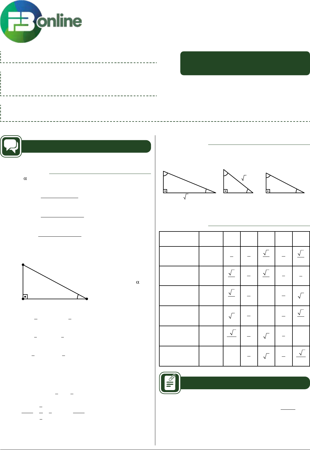 MATEMÁTICA F B O N L I N E . C O M . B R ////////////////// Professor(a): Fabrício Maia assunto: TrigonoMeTria no Triângulo reTângulo, arcos noTáveis frente: MaTeMáTica i 001.759_128111/18 AULAS 01 E 02 EAD – ITA/IME Resumo Teórico Razões Trigonométricas Se é um ângulo de um triângulo retângulo, firmamos as definições a seguir: sen m m m α α α α = → = = −(cateto oposto) (hipotenusa) (sen ) cos (c 1 cossec aateto ) (hipotenusa) (cos ) sec (cateto opo adjacente m tg m → = = −α α α 1 ssto) ( ) ( ) cotg m cateto adjacente tg→ =−α α1 Pondo em prática as definições acima, dispomos de: a a b cA C B a: hipotenusa b: cateto oposto a c: cateto adjacente a a sen b a a b c a a c tg b c g c b α α α α α α = → = = → = = → = cossec cos sec cot Consequentemente, • + = → + = → + = • = b c a b a c a sen sen b a c 2 2 2 2 2 2 21 1α α α α cos cos aa b c tg sen = → =α α αcos Ângulos notáveis Os ângulos agudos especiais de 30º, 37º, 45º, 53º e 60º têm razões trigonométricas cujos valores podem ser calculados de modo exato ou aproximado, a partir dos triângulos retângulos a seguir: 2k k 30º 60º (ângulos exatos) (ângulos exatos) (ângulos aproximados) k 3 5k 3k 37º 53º k 4k k 45º 45º k 2 Tabela Trigonométrica Razões Trigonométricas Notação 30º 37º 45º 53º 60º seno sen 1 2 3 5 2 2 4 5 3 2 cosseno cos 3 2 4 5 2 2 3 5 1 2 tangente tg 3 3 3 4 1 4 3 3 cotangente cotg 3 4 3 1 3 4 3 3 secante sec 2 3 3 5 4 2 5 3 2 cossecante cossec 2 5 3 2 5 4 2 3 3 Exercícios 01. A área de um triângulo é dada pela fórmula A a b= +2 2 4 onde a e b são dois de seus lados. Determine (em graus) a medida do maior dos ângulos do triângulo. A) 120º B) 90º C) 75º D) 60º E) 45º 2F B O N L I N E . C O M . B R ////////////////// Módulo de estudo 001.759_128111/18 02. Calcule o valor de cossec6 10º – cotg6 10º – 3 · cossec2 10º · cotg2 10º. A) 1 B) –1 C) 2 D) 1 2 E) 1 3 03. Observe a figura a seguir. C α θ A D B O Nessa figura, O é o centro do semicírculo de diâmetro AD, AC = CO, BAD = e BCD = . Demonstre que 1 1 2 2 tg tg tgα α θ + = . 04. Considere o triângulo ABC de lados a = BC, b = AC e c = AB e ângulo internos α = CÂB, β = ABC e γ = BCA. Sabendo-se que a equação x2 – 2bx cos a + b2 – a2 = 0, admite c como raiz dupla, pode-se afirmar que A) a = 90º B) β = 60º C) γ = 60º D) O triângulo é retângulo apenas se a = 45º. E) O triângulo é retângulo e b é hipotenusa. 05. Considere a figura a seguir. B A d 1 d 2 CD α β A área do triângulo BDC é A) d d1 2+ −cotg cotgα β B) d d1 2 2 ⋅ +(cotg cotg )α β C) d d g g 1 2 2 + −(cot cot )α β D) d d1 2 2 ⋅ −cotg cotgα β E) d d1 2 2 ⋅ −(cotg cotg )α β 06. Em um triângulo ABC retângulo em A, seja D a projeção de A sobre CB. Sabendo que o segmento BD mede l cm e que o ângulo DÂC mede θ graus, então a área do triângulo ABC vale: A) l2 2 sec θ θ⋅ tg B) l2 2 2 sec θ θ⋅ tg C) l2 2 2 sec θ θ⋅ tg D) l2 2 cossec θ θ⋅ cotg E) l2 2 2 cossec θ θ⋅ cotg 07. Se em um quadrilátero convexo de área S, o ângulo agudo entre as diagonais mede π 6 radianos, então o produto do comprimento dessas diagonais é igual a A) S B) 2S C) 3S D) 4S E) 5S 08. Um triângulo ABC apresenta lados a, b e c. Sabendo que B e C são, respectivamente, os ângulos opostos aos lados b e c, o valor de tgB tgC é A) a b c a b c c b 2 2 2 2 2 2 − + + − ⋅ B) a b c a b c 2 2 2 2 2 2 + − − + C) a b c a b c 2 2 2 2 2 2 – + + − D) a b c a b c c b 2 2 2 2 2 2 + − + ⋅ – E) b c 09. Em um triângulo de vértice A, B e C são dados B C = = π π 2 3 , e o lado BC = 1 cm. Se o lado AB é o diâmetro de uma circunferência, então a área da parte do triângulo ABC externa à circunferência, em cm2, é A) π 8 3 3 16 − B) 5 3 4 2 − π C) 5 8 3 3 4 π − D) 5 3 16 8 − π E) 5 8 3 3 16 π − 3 F B O N L I N E . C O M . B R ////////////////// 001.759_128111/18 Módulo de estudo 10. Considere um ponto P em uma circunferência de raio r no plano cartesiano. Seja Q a projeção ortogonal de P sobre o eixo x, como a figura a seguir, e suponha que o ponto P percorra, no sentido anti-horário, uma distância d44 45� � � �S AC BD Resposta: D 08. Diante, tem-se: A H CB c b a h x a – x i) Pitágoras → b2 – (a – x)2 = c2 – x2 → x a c b a � � �2 2 2 2 ii) tgB tgC h x h a x a x x a a c b a a c b a tgB tgC a b ˆ ˆ ˆ ˆ � � � � � � � � � � � � � 2 2 2 2 2 2 2 2 2 2 cc a b c 2 2 2 2� � Resposta: B 09. No problema em questão, tem-se: 2 B A 30º 30º 120º 60º3 2 3 2 3 2 C w T 1 S T S W sen W W � � � � � � � � � � �� � � �� � � � � � 3 1 2 3 2 3 2 120 2 1 6 3 2 3 2 3 3 16 3 24 3 2 2 � � WW W cm � � � � � � � �� � � �� 3 2 3 3 16 8 5 3 16 8 2 � � Resposta: D S 6F B O N L I N E . C O M . B R ////////////////// Módulo de estudo 001.759_128111/18 10. Nestas condições, temos: y x P P Q Q’ k d k r α r – k i) d = α · r, α em radiamos ii) cos α = −r k r Segue que, r cos α = r – k k = r (1 – cos α) k r d r = − 1 cos Resposta: B 11. Do enunciado, tem-se: R r rrrr r 1 n π sen n r r sen n r sen n r r sen nπ π π π = + → + = → = 1 1−− sen n π Então, R = 1 + r + r R = 1 + 2r = 1 + 2 1 sen n sen n π π − R sen n sen n sen n R sen n = − + − = + − 1 2 1 1 1 π π π π ssen n π Resposta: A 12. Nestas condições, temos: i) CA B a c b cotg cotgC B b c c b + = + = 4 4 b2 + c2 = 4bc a2 = 4bc ii) Assim, Exp. = 16 · senB ^ · senC ^ · senB ^ · senC ^ Exp. = 16 4 1 2 2 · b a c a c a b a bc a ⋅ ⋅ ⋅ = = Resposta: B 13. Nestas condições, temos: B E A D a b x y y a b – a 2 θ θ 4 θ 2 θ 4 θ • Pitágoras → (b – a)2 + x2 = a2 → x2 = 2ab –b2 • Pitágoras → y2 = b2 + x2 = b2 + 2ab – b2 → y2 = 2ab 7F B O N L I N E . C O M . B R ////////////////// MÓDULO DE E