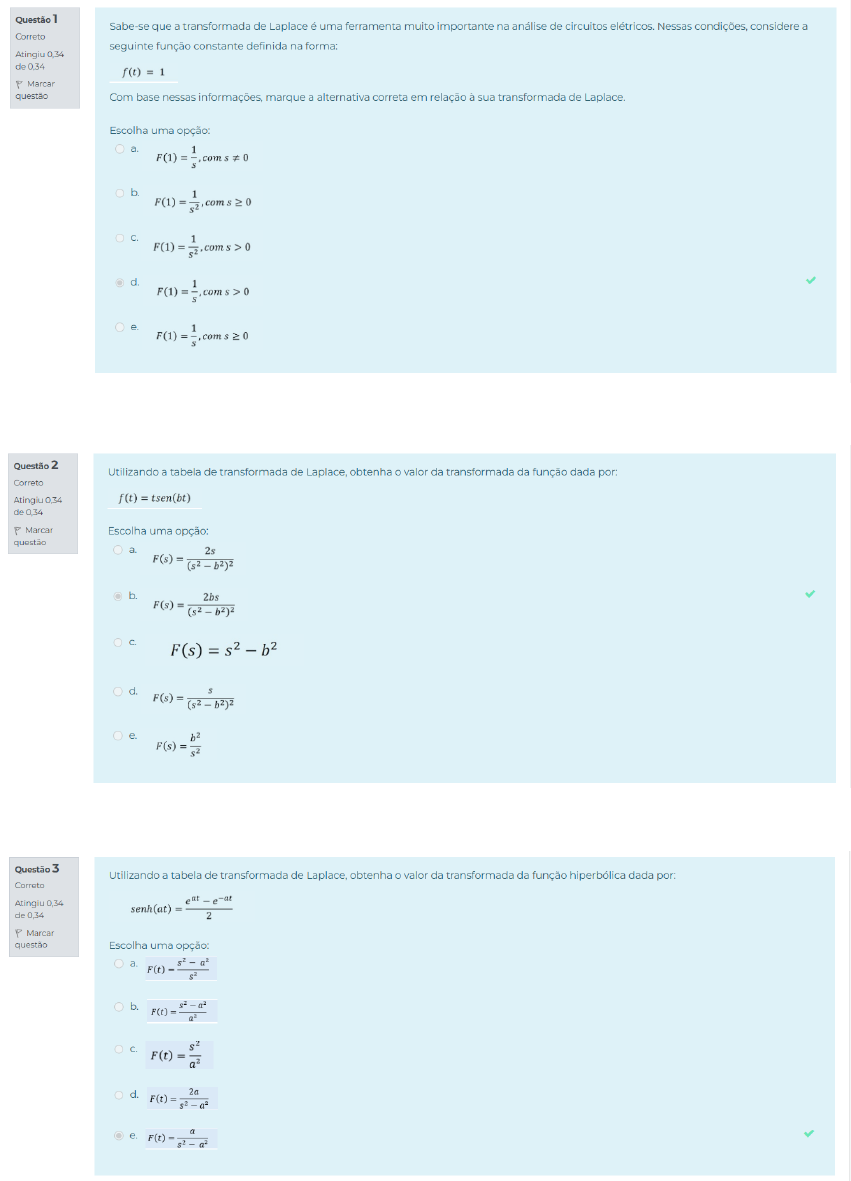 Questão 1 Sabe-se que a transformada de Laplace é uma ferramenta muito importante na análise de circuitos elétricos. Nessas condições, considere a Correto seguinte função constante definida na forma: Atingiu 0,34 de 0,34 P Marcar questão Com base nessas informações, marque a alternativa correta em relação à sua transformada de Laplace. Escolha uma opção: a. com b. 1 F(1) com ≥ 0 C. com d. 1 F(1) S com > 0 e. Questão 2 Utilizando a tabela de transformada de Laplace, obtenha valor da transformada da função dada por: Correto Atingiu 0,34 f(t) tsen(bt) de 0,34 P Marcar Escolha uma opção: questão a. b. 2bs C. d. e. F(s) = Questão 3 Utilizando a tabela de transformada de Laplace, obtenha valor da transformada da função hiperbólica dada por: Correto Atingiu 0,34 senh(at) de 2 P Marcar questão Escolha uma opção: a. b. F(t) C. s² F(t) = d. 2a F(t) F(t) - aQuestão 4 Considere uma função seno definida da seguinte maneira com dependência da frequência angular e do tempo: Correto Atingiu 0,34 = sen(wt) de 0,34 P Marcar questão Com base nessas informações, marque a alternativa correta sobre sua transformada de Laplace. Escolha uma opção: a. b. C. d. F(t) = Questão 5 Considere a seguinte equação diferencial e O problema de valor inicial dado por: Incorreto Atingiu 0,00 = de 0,34 P Marcar questão x'(0) = 1 Nesse contexto, marque a alternativa correta sobre sua solução. Escolha uma opção: a. x(t) = cos(t) sen(t) b. x(t) sen(t) C. x(t) = 2t + 2 cos(t) sen(t) d. x(t) = + sen(t) e. x(t) + cos(t)