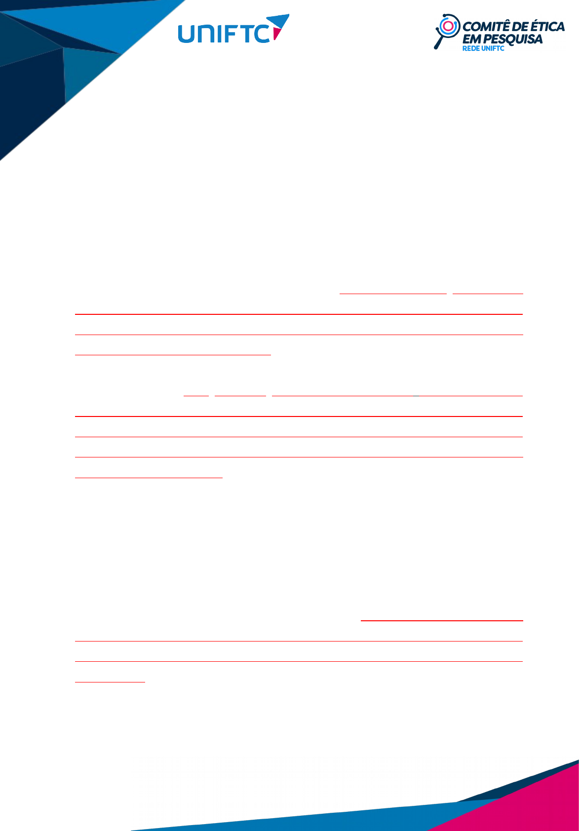 TCLE - TERMO DE CONSENTIMENTO LIVRE E ESCLARECIDO O Sr.(a) está sendo convidado(a) para participar da pesquisa “TITULO DA PESQUISA”. Nesta pesquisa pretendemos “OBJETIVO”. O motivo que nos leva a estudar “JUSTIFICATIVA DA PESQUISA”. Para esta pesquisa adotaremos os seguintes procedimentos: “DESCREVER OS PROCEDIMENTOS METODOLÓGICOS” (De acordo com a Resolução 466/12, deve-se detalhar os métodos a serem utilizados, informando a possibilidade de inclusão em grupo controle ou experimental, quando aplicável. Lembramos que a metodologia deve ser clara e de fácil compreensão, descrevendo todos os procedimentos, de preferência na ordem temporal/cronológica de acontecimentos, aos quais os participantes serão submetidos.) “EXPLICAR OS RISCOS, DESCONFORTOS E BENEFÍCIOS” (De acordo com a Resolução 466/12 toda pesquisa possui riscos. Assim, o pesquisador deve estar sempre atento aos potenciais riscos que a pesquisa pode acarretar aos participantes, em decorrência dos procedimentos da pesquisa, bem como deve esclarecer quais medidas de precaução e proteção serão adotadas para minimizar estes riscos. Adicionalmente, o pesquisador deve também esclarecer sobre a forma de acompanhamento e assistência a que terão direito os participantes da pesquisa, inclusive considerando benefícios e acompanhamentos posteriores ao encerramento e/ ou a interrupção da pesquisa). “EXPLICITAR RESSARCIMENTO” Para participar deste estudo o(a) Sr.(a) não terá nenhum custo, nem receberá qualquer vantagem financeira. No entanto, caso o o(a) Sr.(a), e seu acompanhante, tenha qualquer gasto... A Resolução CNS N° 466 de 2012, item II.21, define ressarcimento como compensação material, exclusivamente, de despesas do participante e seus acompanhantes, quando necessário. Lembre-se que é necessário explicitar que se o participante tiver algum gasto pela sua participação na pesquisa, este deverá ser ressarcido pelo pesquisador, como por exemplo, gastos com alimentação e deslocamento). “INDENIZAÇÃO Caso o(a) Sr.(a) venha a sofrer qualquer tipo de dano resultante de sua participação na pesquisa o(a) Sr.(a) tem direito à indenização. (A Resolução CNS N° 466 de 2012 (item IV.3) define que “os participantes da pesquisa que vierem a sofrer qualquer tipo de dano resultante de sua participação na pesquisa, previsto ou não no Termo de Consentimento Livre e Esclarecido, têm direito à indenização, por parte do pesquisador, do patrocinador e das instituições envolvidas nas diferentes fases da pesquisa” (item V.7). O Sr.(a) terá o esclarecimento sobre o estudo em qualquer aspecto que desejar e estará livre para participar ou recusar-se a participar. Poderá retirar seu consentimento ou interromper a participação a qualquer momento. A sua participação é voluntária e a recusa em participar não acarretará qualquer penalidade ou modificação na forma em que é atendido pelo(a) (incluir nome da instituição onde será realizada a pesquisa). Caso o (a) Sr.(a) tenha alguma dúvida ou necessite de qualquer esclarecimento ou ainda deseje retirar-se da pesquisa, por favor, entre em contato com os pesquisadores abaixo a qualquer tempo. Pesquisador responsável e/ou colaborador – nome, endereço e telefone não pessoal Também em caso de dúvida, o(a) senhor(a) poderá entrar em contato com o Comitê de Ética em Pesquisa do Instituto Mantenedor de Ensino Superior (CEP/IMES/FTC). O Comitê de Ética em Pesquisa (CEP) busca defender os interesses dos participantes de pesquisa. O CEP é responsável pela avaliação e acompanhamento dos aspectos éticos de todas as pesquisas envolvendo seres humanos. O Comitê de Ética em Pesquisa do Instituto Mantenedor de Ensino Superior da Bahia (CEP/IMES) está localizado na Avenida Luis Viana Filho, 8812, Paralela, - UNIFTC – Módulo 1, Nível 3. Horário de funcionamento: Segunda a quinta das 9h às 17h e na sexta das 9:00h às 16:00h. Telefone: (71) 3281-8214. E-mail: cep@ftc.edu.br. Os resultados da pesquisa estarão à sua disposição quando finalizada (esclarecer também como o participante da pesquisa terá acesso aos resultados). Seu nome ou o material que indique sua participação não será liberado sem a sua permissão. O(a) Sr.(a) não será identificado em nenhuma publicação que possa resultar (o pesquisador deve esclarecer qual será o mecanismo utilizado para garantir a confidencialidade e a anonimização dos dados (exemplo: codificação dos dados, senha de acesso aos bancos de dados, etc..) Este termo de consentimento encontra-se impresso em duas vias originais, rubricadas em todas as suas páginas, as quais serão assinadas, ao seu término, pelo(a) Sr(a) ou por seu representante legal, assim como pelo pesquisador responsável. Uma das vias deste termo será arquivada pelo pesquisador responsável, no "LOCAL DA PESQUISA" e a outra será fornecida ao(a) Sr.(a). Os dados e instrumentos utilizados na pesquisa ficarão arquivados com o pesquisador responsável por um período de cinco (5) anos, e após esse tempo serão destruídos. Os pesquisadores tratarão a sua identidade com padrões profissionais de sigilo, atendendo a legislação brasileira (Resolução Nº 466/12 do Conselho Nacional de Saúde), utilizando as informações somente para os fins acadêmicos e científicos. Eu, _____________________________________________, portador do documento de Identidade ____________________ fui informado (a) dos objetivos da pesquisa “NOME DA PESQUISA”, de maneira clara e detalhada e esclareci minhas dúvidas. Sei que a qualquer momento poderei solicitar novas informações e modificar minha decisão de participar se assim o desejar. Declaro que concordo em participar. Recebi uma via deste termo de consentimento livre e esclarecido e me foi dada à oportunidade de ler e esclarecer as minhas dúvidas. Cidade, _________ de __________________________ de 20 . Nome completo (participante) Data Nome completo