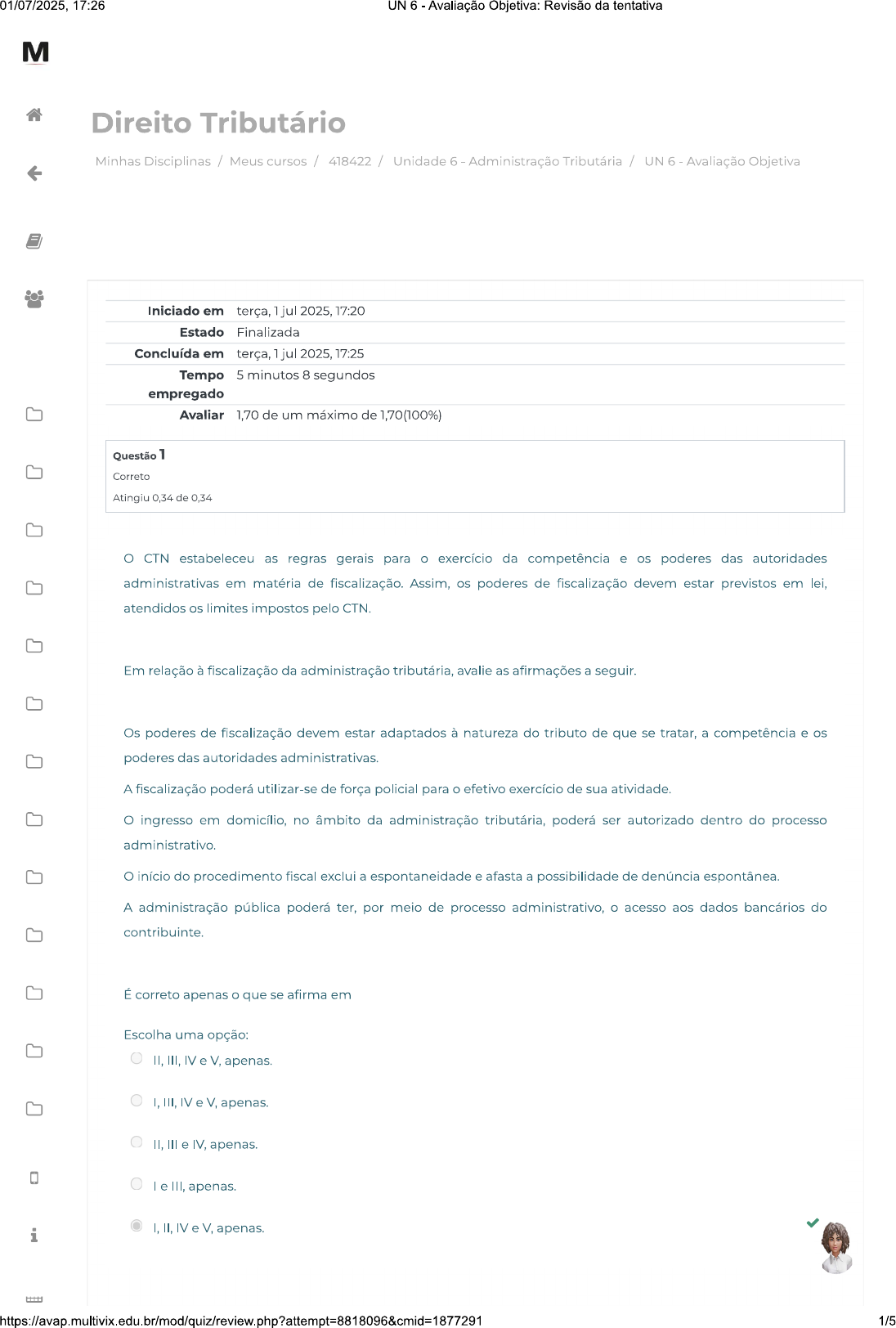 01/07/2025, 17:26 UN 6 Avaliação Objetiva: Revisão da tentativa M Direito Tributário Minhas Disciplinas / Meus cursos / 418422 / Unidade 6 Administração Tributária / UN 6 Avaliação Objetiva Iniciado em terça, 1 jul 2025, 17:20 Estado Finalizada Concluída em terça, 1 jul 2025, 17:25 Tempo 5 minutos 8 segundos empregado Avaliar 1,70 de um máximo de 1,70(100%) Questão 1 Correto Atingiu 0,34 de 0,34 CTN estabeleceu as regras gerais para exercício da competência e os poderes das autoridades administrativas em matéria de fiscalização. Assim, os poderes de fiscalização devem estar previstos em lei, atendidos os limites impostos pelo CTN. Em relação à fiscalização da administração tributária, avalie as afirmações a seguir. Os poderes de fiscalização devem estar adaptados à natureza do tributo de que se tratar, a competência e os poderes das autoridades administrativas. A fiscalização poderá utilizar-se de força policial para efetivo exercício de sua atividade. ingresso em domicílio, no âmbito da administração tributária, poderá ser autorizado dentro do processo administrativo. início do procedimento fiscal exclui a espontaneidade e afasta a possibilidade de denúncia espontânea. A administração pública poderá ter, por meio de processo administrativo, acesso aos dados bancários do contribuinte. É correto apenas que se afirma em Escolha uma opção: II, III, IV e V, apenas. I, III, IV e V, apenas. II, III e IV, apenas. le III, apenas. i I, II, IV e V, apenas. 1/501/07/2025, 17:26 UN 6 Avaliação Objetiva: Revisão da tentativa Questão 2 M Correto Atingiu 0,34 de 0,34 contribuinte do imposto do ICMS foi citado em uma execução fiscal. Tal citação veio acompanhada da Certidão de Dívida Ativa sendo que na presente certidão havia a indicação do nome do devedor, a quantia do débito, cálculo dos juros, entretanto não indicava fundamento legal da origem do crédito nem a data em que foi inscrita. Considerando a situação hipotética, é correto afirmar que Escolha uma opção: a certidão de dívida ativa não será nula, pois erro pode ser sanado até a decisão de primeira instância. a certidão de dívida ativa está correta, uma vez que erros materiais não são fundamentos para sua nulidade. a falta de fundamento legal é caso de nulidade da certidão de dívida ativa, mas a data em que foi inscrita é opção conferida à administração pública. a indicação do nome do devedor traz nulidade à certidão de dívida ativa, pois viola sigilo do contribuinte. a não indicação dos termos faltantes é caso de nulidade da certidão de dívida ativa. 2/501/07/2025, 17:26 UN 6 Avaliação Objetiva: Revisão da tentativa Questão 3 M Correto Atingiu 0,34 de 0,34 Prevê CTN que: "Constitui dívida ativa tributária a proveniente de crédito dessa natureza, regularmente inscrita na repartição administrativa competente, depois de esgotado prazo fixado, para pagamento, pela lei ou por decisão final proferida em processo regular." Considerando as características da dívida ativa, avalie as afirmações a seguir. A inscrição em dívida ativa torna possível a executoriedade do crédito tributário, mediante a cobrança judicial ou administrativa. A falta de cumprimento dos requisitos para inscrição da dívida ativa leva a sua nulidade. Uma vez constata a nulidade da inscrição da dívida ativa essa não poderá ser revista. É correto que se afirma em: Escolha uma opção: le II, apenas. I, e III. II e III, apenas. I, apenas. le III, apenas. i 3/501/07/2025, 17:26 UN 6 Avaliação Objetiva: Revisão da tentativa Questão 4 M Correto Atingiu 0,34 de 0,34 A administração tributária, no exercício de sua atividade fiscalizadora, abriu procedimento administrativo com intuito de verificar irregularidade de pessoa jurídica de direito privado. Constatou-se que a referida pessoa devia à União imposto recolhido a menor, contudo, entendendo que imposto teria sido recolhido de forma correta sujeito passivo apresentou recurso ao processo administrativo pendente de julgamento. Ao participar de um processo licitatório será preciso a emissão de certidão de regularidade fiscal. Considerando contexto, a pessoa jurídica Escolha uma opção: terá direito à certidão negativa, pois recurso extinguiu crédito anteriormente havido. só poderá emitir certidão positiva, devido ao lançamento do débito pela administração tributária. poderá requerer a emissão da certidão positiva com efeitos negativos, uma vez que recurso isenta à pessoa jurídica do crédito tributário. terá direito à certidão positiva com efeitos negativos, uma vez que recurso suspende à exigibilidade do crédito tributário. terá direito somente à certidão positiva, pois recurso não exime a pessoa jurídica do pagamento. 4/501/07/2025, 17:26 UN 6 Avaliação Objetiva: Revisão da tentativa Questão 5 M Correto Atingiu 0,34 de 0,34 A administração tributária visa à arrecadação e à fiscalização dos tributos, sob os aspectos do direito constitucional tributário nacional. A relevância de suas funções lhe autoriza a prática de atos de fiscalização em prol do interesse público. Considerando as características da administração pública, avalie as afirmações a seguir. Deve respeitar os princípios constitucionais, sendo limites ao poder de tributar do Estado. As pessoas jurídicas previstas na Constituição que gozam de imunidade tributária não estão isentas da fiscalização da administração tributária. sujeito passivo da relação jurídica-tributária deverá além da obrigação principal, cumprir a obrigação acessória, mantendo disponível à administração tributária a guarda dos livros obrigatórios de escrituração comercial e fiscal pelo período de um ano. É correto que se afirma em Escolha uma opção: I, e III, apenas. I, apenas. le II, apenas. II, apenas. e III, apenas. Conteúdo Online Seguir para... Exercícios de 