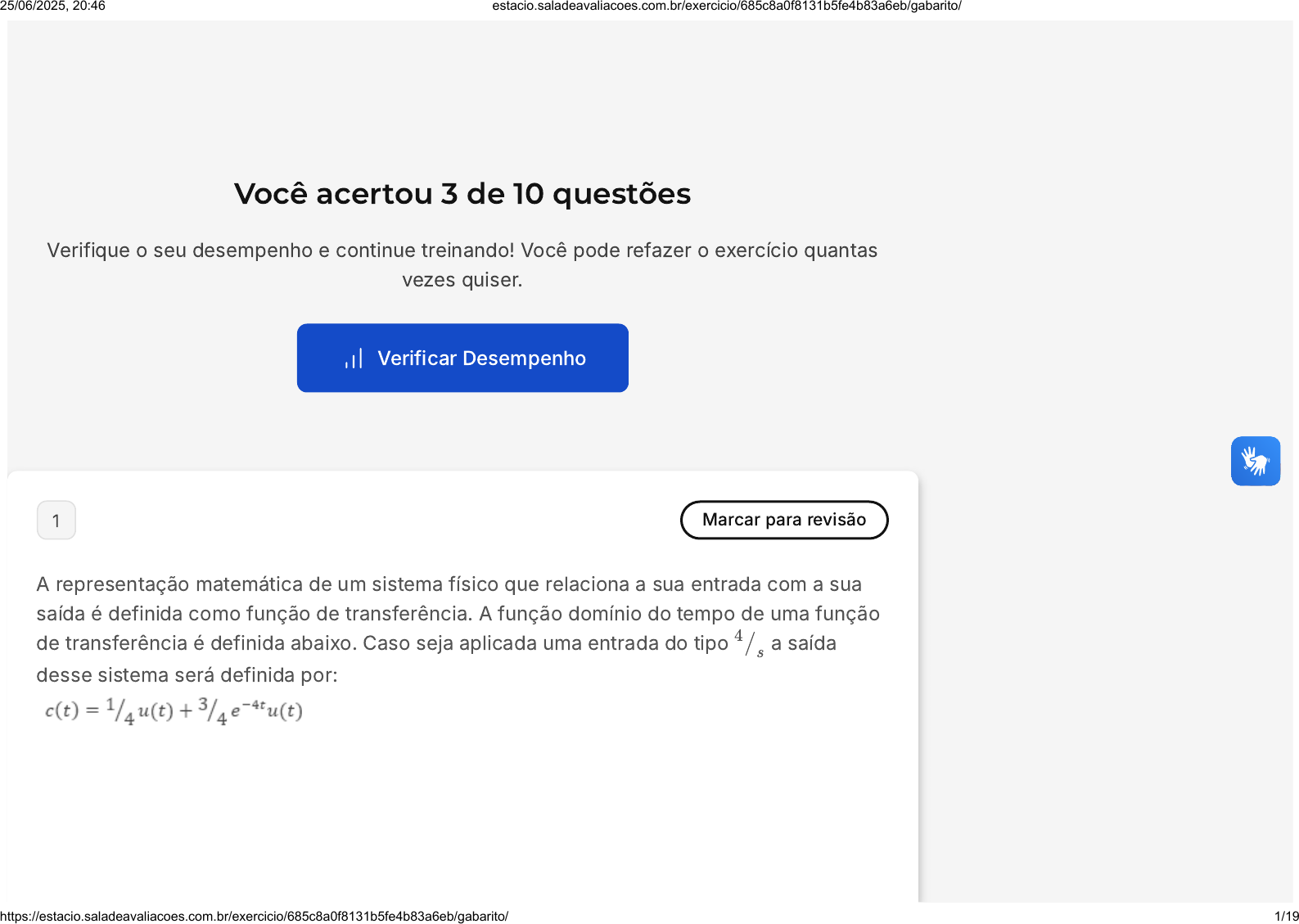Você acertou 3 de 10 questões Verifique o seu desempenho e continue treinando! Você pode refazer o exercício quantas vezes quiser. Verificar Desempenho 1 Marcar para revisão A representação matemática de um sistema físico que relaciona a sua entrada com a sua saída é definida como função de transferência. A função domínio do tempo de uma função de transferência é definida abaixo. Caso seja aplicada uma entrada do tipo a saída desse sistema será definida por: 4/s 25/06/2025, 20:46 estacio.saladeavaliacoes.com.br/exercicio/685c8a0f8131b5fe4b83a6eb/gabarito/ https://estacio.saladeavaliacoes.com.br/exercicio/685c8a0f8131b5fe4b83a6eb/gabarito/ 1/19 A B C D E c(t) = 1 + 3e−4t c(t) =1 /4u(t) +3 /4e−4tu(t) c(t) = 3e−4t c(t) = 1 c(t) = 1 − 3e−4t Resposta correta Parabéns, você selecionou a alternativa correta. Confira o gabarito comentado! Gabarito Comentado 25/06/2025, 20:46 estacio.saladeavaliacoes.com.br/exercicio/685c8a0f8131b5fe4b83a6eb/gabarito/ https://estacio.saladeavaliacoes.com.br/exercicio/685c8a0f8131b5fe4b83a6eb/gabarito/ 2/19 Gabarito: Justificativa: A entrada ao ser submetida a transformada inversa de Laplace leva a um sinal do tipo . Sendo assim: c(t) = 1 + 3e−4t 4/s u(t) = 4 2 Marcar para revisão A representação matemática de um sistema físico que relaciona a sua entrada com a sua saída é definida como função de transferência. O circuito RC da figura abaixo apresenta uma composição formada por 2 resistores divisores de tensão ( ) e um capacitor de 10 Faraday. A função de transferência definida pelo circuito é dada por: Fonte: YDUQS - Estácio - 2021 R1 = 5ohm, R2 = 5ohm 25/06/2025, 20:46 estacio.saladeavaliacoes.com.br/exercicio/685c8a0f8131b5fe4b83a6eb/gabarito/ https://estacio.saladeavaliacoes.com.br/exercicio/685c8a0f8131b5fe4b83a6eb/gabarito/ 3/19 A B C D E = VC(s) V (s) 100 (s+100) = VC(s) V (s) 1/100 (s+1/100) = VC(s) V (s) 1/ 100 (s−1/ 100 ) = VC(s) V (s) s (s+1/100) = VC(s) V (s) s (s−100) Resposta correta Parabéns, você selecionou a alternativa correta. Confira o gabarito comentado! Gabarito Comentado Gabarito: Justificativa: Circuitos com resistores em série possuem uma resistência equivalente igual a soma dos resistores do circuito. Então: = VC(s) V (s) 1/100 (s+1/100) 25/06/2025, 20:46 estacio.saladeavaliacoes.com.br/exercicio/685c8a0f8131b5fe4b83a6eb/gabarito/ https://estacio.saladeavaliacoes.com.br/exercicio/685c8a0f8131b5fe4b83a6eb/gabarito/ 4/19 A B Circuitos do tipo resistor - indutor (RL) possuem uma função de transferência definida por: 3 Marcar para revisão A representação matemática de um sistema físico que relaciona a sua entrada com a sua saída é definida como função de transferência. Um sistema mecânico é definido pela equação diferencial de ordem 2: onde M é a massa; B é o amortecedor e K a constante elástica. Supondo os seguintes valores: ; e . A função de transferência desse sistema é igual a:M = 4 B = 2 K = 1 Y (s) = + U(s) (4s+2)y(0)+4ẏ(0) 4s2+2s+1 1 4s2+2s+1 Y (s) = (4s+2)y(0)+4ẏ(0) 4s2+2s+1 25/06/2025, 20:46 estacio.saladeavaliacoes.com.br/exercicio/685c8a0f8131b5fe4b83a6eb/gabarito/ https://estacio.saladeavaliacoes.com.br/exercicio/685c8a0f8131b5fe4b83a6eb/gabarito/ 5/19 C D E Y (s) = U(s)1 4s2+2s+1 Y (s) = U(s) + (4s+2)y(0)+4ẏ(0) 4s2+2s+1 1 4s2+2s+1 Y (s) = U(s) Resposta incorreta Opa! A alternativa correta é a letra A. Confira o gabarito comentado! Gabarito Comentado Gabarito: Justificativa: Y (s) = + U(s) (4s+2)y(0)+4ẏ(0) 4s2+2s+1 1 4s2+2s+1 25/06/2025, 20:46 estacio.saladeavaliacoes.com.br/exercicio/685c8a0f8131b5fe4b83a6eb/gabarito/ https://estacio.saladeavaliacoes.com.br/exercicio/685c8a0f8131b5fe4b83a6eb/gabarito/ 6/19 A B C 4 Marcar para revisão A representação matemática de um sistema físico que relaciona a sua entrada com a sua saída é definida como função de transferência. Observando a conexão entre as engrenagens do sistema mecânico abaixo, é possível afirmar que o torque transmitido para o corpo inercial , sendo a relação e , é igual a: Fonte: YDUQS - Estácio - 2021 (T2) (N1 : N2 = 1 : 2) T1 = 10N . m T2 = 10N . m T2 = 20N . m T2 = 5N . m 25/06/2025, 20:46 estacio.saladeavaliacoes.com.br/exercicio/685c8a0f8131b5fe4b83a6eb/gabarito/ https://estacio.saladeavaliacoes.com.br/exercicio/685c8a0f8131b5fe4b83a6eb/gabarito/ 7/19 D E T2 = 25N . m T2 = 4N . m Resposta incorreta Opa! A alternativa correta é a letra B. Confira o gabarito comentado! Gabarito Comentado Gabarito: Justificativa: A relação entre as engrenagens é definida pela equação: Sendo assim, com os parâmetros da questão: T2 = 20N . m 25/06/2025, 20:46 estacio.saladeavaliacoes.com.br/exercicio/685c8a0f8131b5fe4b83a6eb/gabarito/ https://estacio.saladeavaliacoes.com.br/exercicio/685c8a0f8131b5fe4b83a6eb/gabarito/ 8/19 A B C 5 Marcar para revisão A representação matemática de um sistema físico que relaciona a sua entrada com a sua saída é definida como função de transferência. Considere o circuito elétrico da Figura abaixo. Se os valores dos elementos do circuito forem definidos por: e , pode-se afirmar que a função de transferência desse circuito será definida por: Fonte: YDUQS - Estácio - 2021 R = 4ohm L = 2henry = VL(s) V (s) 1 (s+2) = VL(s) V (s) s (s+4) = VL(s) V (s) 1 (s+4) 25/06/2025, 20:46 estacio.saladeavaliacoes.com.br/exercicio/685c8a0f8131b5fe4b83a6eb/gabarito/ https://estacio.saladeavaliacoes.com.br/exercicio/685c8a0f8131b5fe4b83a6eb/gabarito/ 9/19 D E = VL(s) V (s) s (s+1/ 2 ) = VL(s) V (s) s (s+2) Resposta incorreta Opa! A alternativa correta é a letra E. Confira o gabarito comentado! Gabarito Comentado Gabarito: Justificativa: Circuitos do tipo resistor - indutor (RL) possuem uma função de transferência definida por: = VL(s) V (s) s (s+2) 6 Marcar para revisão 25/06/2025, 20:46 estacio.saladeavaliacoes.com.br/exercicio/685c8a0f8131b5fe4b83a6eb/gabarito/ https://estacio.saladeavaliacoes.com.br/exercicio/685c8a0f8131b5fe4b83a6eb/g