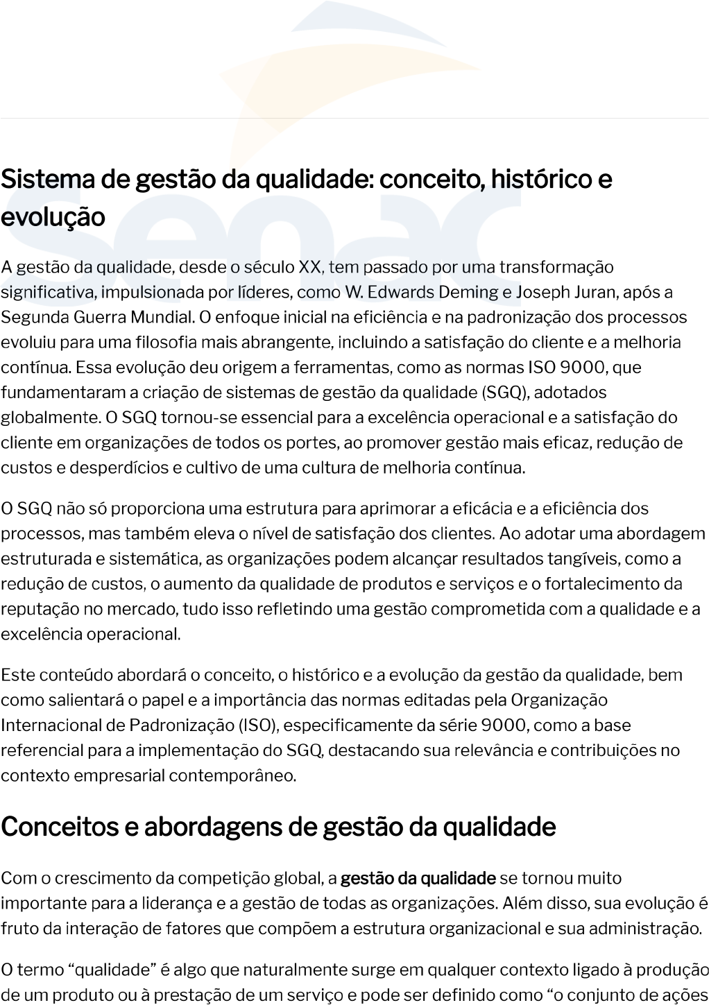 Sistema de gestão da qualidade: conceito, histórico e evolução A gestão da qualidade, desde século tem passado por uma transformação significativa, impulsionada por líderes, como W. Edwards Deming e Joseph Juran, após a Segunda Guerra Mundial. enfoque inicial na eficiência e na padronização dos processos evoluiu para uma filosofia mais abrangente, incluindo a satisfação do cliente e a melhoria contínua. Essa evolução deu origem a ferramentas, como as normas ISO 9000, que fundamentaram a criação de sistemas de gestão da qualidade (SGQ), adotados globalmente. O SGQ tornou-se essencial para a excelência operacional e a satisfação do cliente em organizações de todos os portes, ao promover gestão mais eficaz, redução de custos e desperdícios e cultivo de uma cultura de melhoria contínua. O SGQ não só proporciona uma estrutura para aprimorar a eficácia e a eficiência dos processos, mas também eleva nível de satisfação dos clientes. Ao adotar uma abordagem estruturada e sistemática, as organizações podem alcançar resultados tangíveis, como a redução de custos, aumento da qualidade de produtos e serviços e fortalecimento da reputação no mercado, tudo isso refletindo uma gestão comprometida com a qualidade e a excelência operacional. Este conteúdo abordará conceito, histórico e a evolução da gestão da qualidade, bem como salientará papel e a importância das normas editadas pela Organização Internacional de Padronização (ISO), especificamente da série 9000, como a base referencial para a implementação do SGQ, destacando sua relevância e contribuições no contexto empresarial contemporâneo. Conceitos e abordagens de gestão da qualidade Com crescimento da competição global, a gestão da qualidade se tornou muito importante para a liderança e a gestão de todas as organizações. Além disso, sua evolução é fruto da interação de fatores que compõem a estrutura organizacional e sua administração. O termo "qualidade" é algo que naturalmente surge em qualquer contexto ligado à produção de um produto ou à prestação de um serviço e pode ser definido como conjunto de açõese características de uma empresa que permite satisfazer as necessidades dos clientes de forma eficaz". Como conceito, a qualidade é conhecida há milênios, porém só recentemente ela surgiu como função gerencial. Primeiramente, a qualidade estava associada à definição de conformidade e especificações, depois, à visão de satisfação do cliente, tendo relevância fatores como prazo e pontualidade de entrega e condições de pagamento. Além desses fatores e da percepção da qualidade do produto, as empresas se viram obrigadas a produzir de forma com que conseguissem alcançar seus objetivos com mínimo de custo possível, afinal cliente incorre em custos com 0 produto desde a aquisição até descarte. Esse fato é chamado de ciclo de vida do produto, e, por esse motivo, considera-se um produto de qualidade aquele que tem um bom desempenho a um preço aceitável. Levando esse aspecto para âmbito interno da organização, produto é de qualidade quando internamente a empresa apresenta um nível de conformidade adequado a um custo aceitável. A primeira manifestação da busca pela qualidade ocorreu no século XVIII a. C., com Código de Hamurabi, em que inspetores estavam atentos à exatidão dos resultados das atividades e ao tratamento dos desvios durante processo de fabricação, ficando a cargo deles aceitar ou rejeitar produtos, de acordo com as rígidas especificações governamentais. Logo após esse período, egípcios, fenícios e romanos também adotaram essa postura de preocupar-se com desempenho satisfatório das atividades, notório no desenvolvimento de técnicas de pesquisas para manter a conformidade de seus bens. Até esse período, a procura encontrava-se superior à oferta, com foco na produtividade e na normalização dos produtos e peças, ocasionada pela evolução tecnológica. A qualidade ainda se baseava nas características físicas do produto, na conformidade com as especificações para a produção e naquilo que os projetistas consideravam que devia ser a sua funcionalidade, sendo então definida pelo produtor e assegurada por inspetores e clientes. A necessidade da qualidade de produção industrial se deu no período chamado de produção em massa, em meados do século caracterizado principalmente pela invenção de Henry Ford. Dono da Ford Motor Company, Henry foi primeiro empresário a produzir automóveis em massa, com baixos custos e em um pequeno intervalo de tempo. Inovou mercado com seu sistema de gestão do trabalho de linha de montagem, em que as atividades eram desenvolvidas de acordo com as normas estabelecidas. A defesa e a qualidade sempre estiveram juntas. Durante a Primeira Guerra Mundial, a qualidade foi reconhecida como ferramenta competitiva. Logo no período do pós-guerra, a escala industrial sofreu a maior mudança: passou de pequenas unidades produtivas, em queindivíduo era apenas uma parte do processo, para grandes unidades integradas de trabalho. A produção em larga escala estipulou a necessidade de fazer, inspecionar, aceitar ou retrabalhar, sendo só recentemente estipulado conceito mais econômico de fazer certo da primeira vez sempre. Nesse mesmo período, Japão se apresentava ao mundo destruído e precisando iniciar seu processo de reconstrução. Buscando uma saída, W.E. Deming foi convidado pela Japanese Union of Scientists and Engineers (JUSE) para treinar empresários e industriais sobre as principais ferramentas da qualidade, dando início à preocupação japonesa com a qualidade dos produtos. Dessa forma, percebe-se que a busca pela qualidade vem desde a antiguidade, e esse longo caminho percorrido pelas teorias e práticas de qualidade, para atingir nível em que estão hoje, associa-se às mudanças organizacionais ocorridas nas últimas décadas, conforme a segui