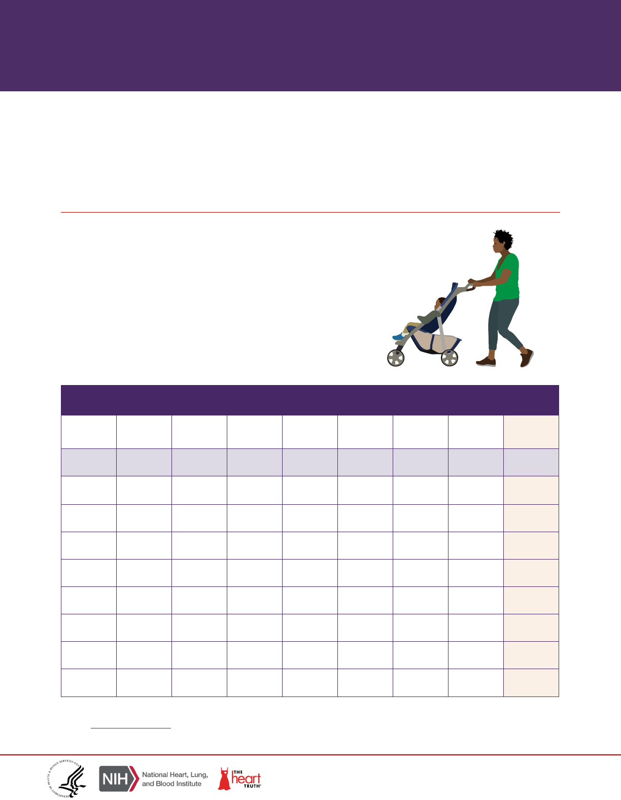 Make Physical Activity a Habit Physical activity is great for keeping your whole body healthy, managing stress, lowering high blood pressure, sleeping better, and more. Go for a combination of aerobic activity, like brisk walking, and exercises to strengthen your muscles, like yoga or lifting weights. Use this chart to record how much physical activity you get and when you do strength exercises. Having a record will help you stay on track and see your progress. ● Write down what you do every day. ● Start out slowly. ● Aim to reach at least 150 minutes (2½ hours total) per week! ● Try to do strength training at least two days a week. Draw a star on those days in your chart. Write down the number of minutes you’re active each day. Week # Sunday minutes Monday minutes Tuesday minutes Wednesday minutes Thursday minutes Friday minutes Saturday minutes Total minutes Example 5 5 10 10 15 15 15 75 Week 1 Week 2 Week 3 Week 4 Week 5 Week 6 Week 7 Week 8 Go to hearttruth.gov for more tips on making physical activity part of your self-care routine. hearttruth.gov https://www.nhlbi.nih.gov/health-topics/education-and-awareness/heart-truth https://www.nhlbi.nih.gov/health-topics/education-and-awareness/heart-truth
