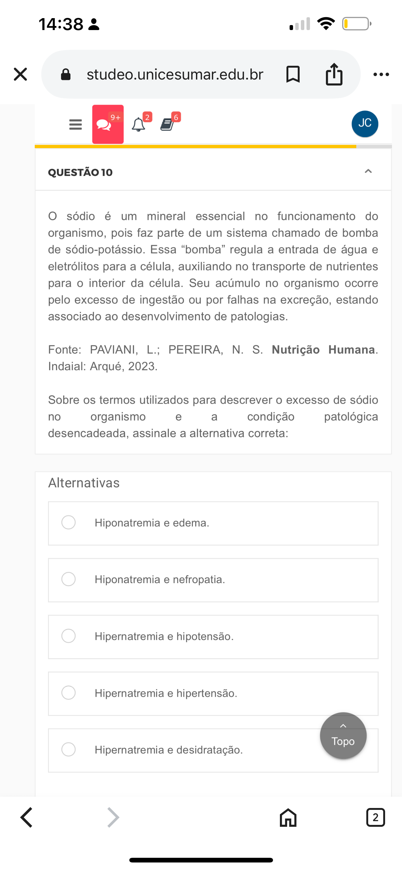 14:38 X 9+ 2 6 JC QUESTÃO 10 sódio é um mineral essencial no funcionamento do organismo, pois faz parte de um sistema chamado de bomba de sódio-potássio. Essa "bomba" regula a entrada de água e eletrólitos para a célula, auxiliando no transporte de nutrientes para interior da célula. Seu acúmulo no organismo ocorre pelo excesso de ingestão ou por falhas na excreção, estando associado ao desenvolvimento de patologias. Fonte: PAVIANI, L.; PEREIRA, N. S. Nutrição Humana. Indaial: Arqué, 2023. Sobre os termos utilizados para descrever excesso de sódio no organismo e a condição patológica desencadeada, assinale a alternativa correta: Alternativas Hiponatremia e edema. Hiponatremia e nefropatia. Hipernatremia e hipotensão. Hipernatremia e hipertensão. Topo Hipernatremia e desidratação. 2