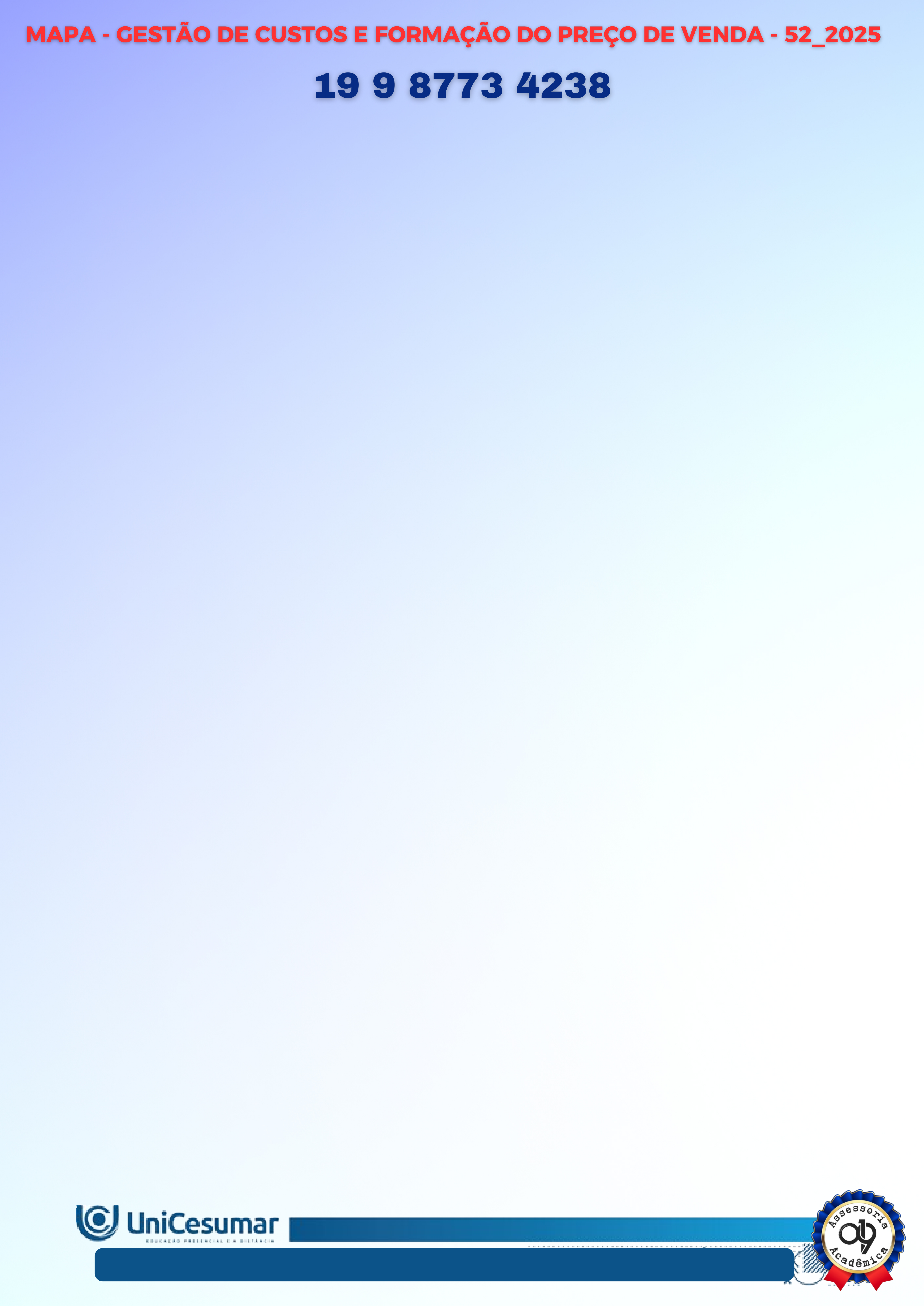 Olá, estudante! O objetivo da atividade MAPA (Material de Avaliação Prática de Aprendizagem) é permitir que você se sinta imerso com relação ao cálculo do preço de venda de determinado produto, utilizando como ferramenta o mark-up divisor. Que tal aproveitar para colocar em prática os conteúdos aprendidos na disciplina de Gestão de Custos e Formação de Preço de Venda? A determinação do preço de venda constituiuma das principais e das mais difíceis decisões a ser tomada em uma empresa, pois depende de um número considerável de variáveis, que nem sempre partem de decisão interna da organização, merecendo um planejamento consubstanciado em informações estratégicas de mercadoe que possa refletir os objetivos da instituição. Ao se procurarformar o preço de venda, é preciso observar a base escolhida para essa formação, a partir do custo, ou a partir do mercado. Fonte: adaptadode: https://anaiscbc.abcustos.org.br/anais/article/view/3037. Acesso em: 13 maio 2025. Marília e Joana são amigas desde a época da faculdade. Recentemente, constituíram um pequeno negócio para fabricar xales de seda. Decidiram optar por esse segmento de negócio depois de realizar uma pesquisa de mercado com o público feminino e perceberem que esse é um acessório indispensável no guarda-roupa das mulheres. Imagine que sua missão é ajudar as duas empresárias a realizar o cálculo do preço de venda dessa peça e, para tanto, recebeu relatóriocontendo as informações de que o custo variávelde produção do xale é de R$ 18,00; os impostos sobre as vendas somam o montante de 25%; a margem de contribuição desejada pelas sócias é de 35%; e que as comissões sobre as vendas são de 10%. Após analisar todos os dados fornecidos, realize os cálculose atenda às seguintes demandas: 1. Calcule o preço de venda do xale, utilizando como ferramenta o mark-up divisor. (Nesse item, demonstre os cálculos realizados para chegar no resultado). 2. Apresente a demonstração do resultado com os cálculosreferentes à venda de uma unidade do xale. Para auxiliá-lo na execuçãodesta atividade, seguem algumas orientações: - Assista ao vídeo explicativo, disponível na pasta "Material da disciplina". - Caso faça uso de fontes como livros, internet, revistas e artigos, informe-as nas Referências ao final de seu texto. - Realize uma cuidadosa correção ortográfica em seu texto, e o copie no template/formulário (modelo), disponível na pasta Material da Disciplina. - Anexe o arquivo no ambiente da atividade, clicandosobre o botão Selecionar arquivo. - Após anexar o trabalho, certifique-se de que seja o arquivo correto. Clique no botão Responder e, posteriormente, em Finalizar Questionário (após "Finalizar o Questionário", não será possível reenviar a atividade ou realizar qualquer modificação no arquivo enviado). Bons estudos! --019 ASSESSORIA ACADÊMICA-- 19 9 87734238 PEÇA JÁ SUA ATIVIDADE 19 9 87734238